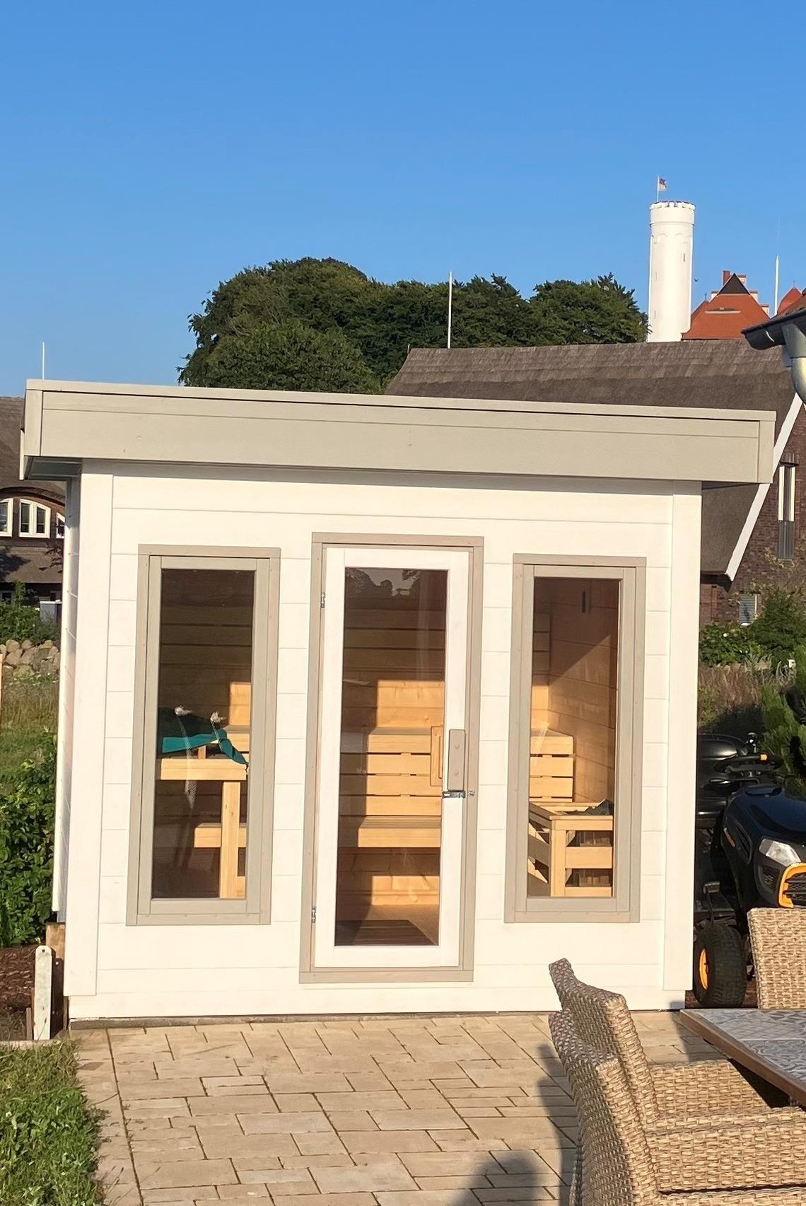Entspannung geben auch die Außensauna mit anschließender Regendusche oder ein Bad in der großen Wanne.
