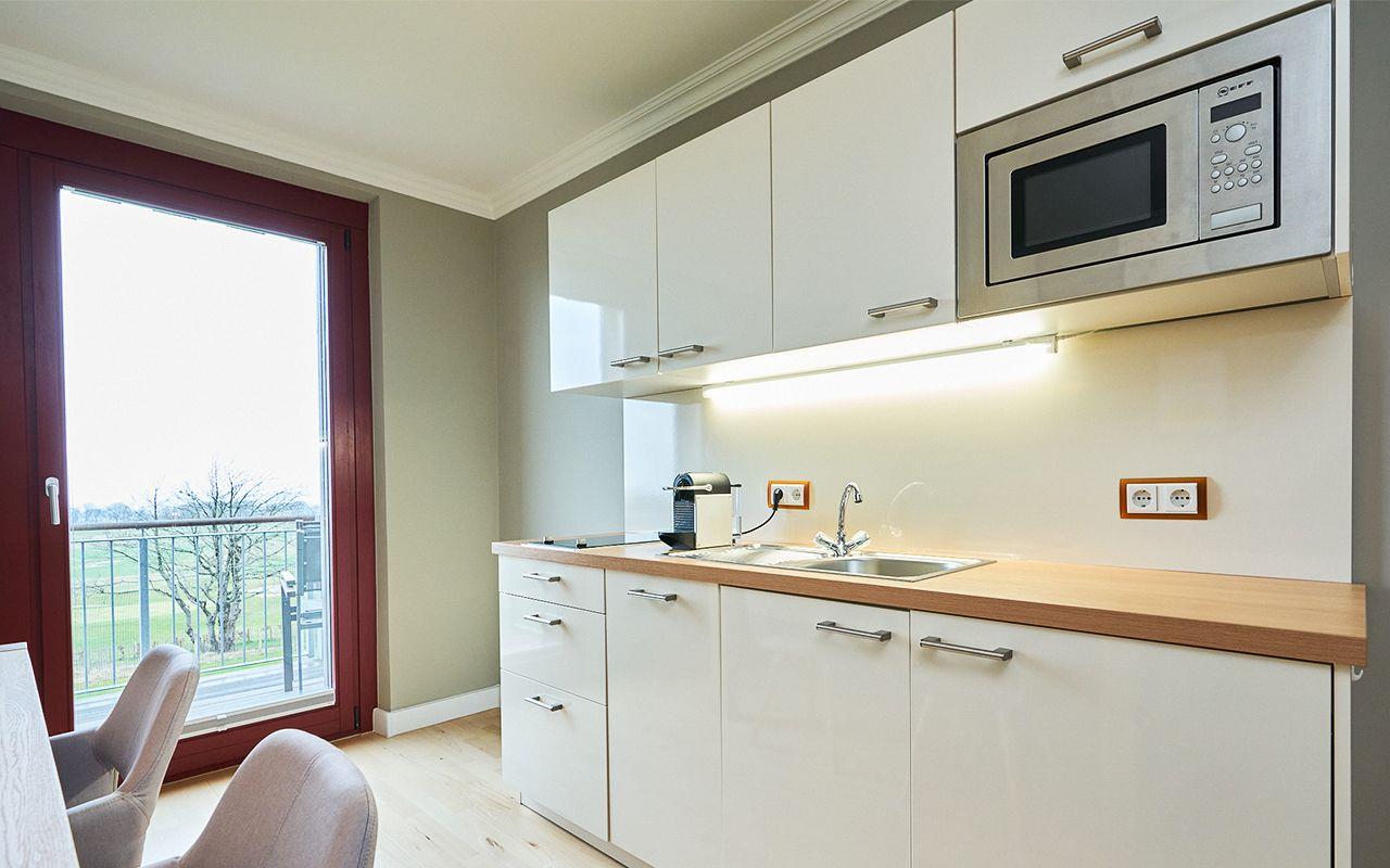 Treten Sie ein - über den hellen, geräumigen Flur gelangen Sie in den großzügigen und gemütlichen Wohnbereich, erste Blicke auf die Ostsee und den Schlosspark lassen sich nicht vermeiden. Einfach traumhaft. Die vollständig ausgestattete und integrierte Küchenzeile fügt sich harmonisch ein. Viel Raum und Platz sorgen für gemütliche Stunden zusammen. Das Schlafzimmer, hell und großzügig, bietet Ihnen ein gemütliches Doppelbett und das Bettsofa eine weitere, schöne Ausruhzone. Hier lässt es sich wunderbar mit einem Buch oder dem Blick in die Natur gut abschalten. Zusätzlich kann das Bettsofa im Schlafzimmer auch als Aufbettung für eine weitere Person genutzt werden. Von den beiden Balkonen, die vom Ess- und Wohnbereich ausgehen, haben Sie die Wahl Richtung Ostsee, den Golfplatz oder in den Schlosspark zu schauen. Einfach herrlich. Die Wohnung verfügt weiterhin über ein schönes, modernes und großes Bad mit zwei getrennten Waschbecken, Dusche und WC. Wann immer Sie hier vorbeischauen, der Ausblick sorgt für gute Stimmung. Ein separater, kleiner Abstellraum im Flur bietet Stauraum für Ihr Gepäck.