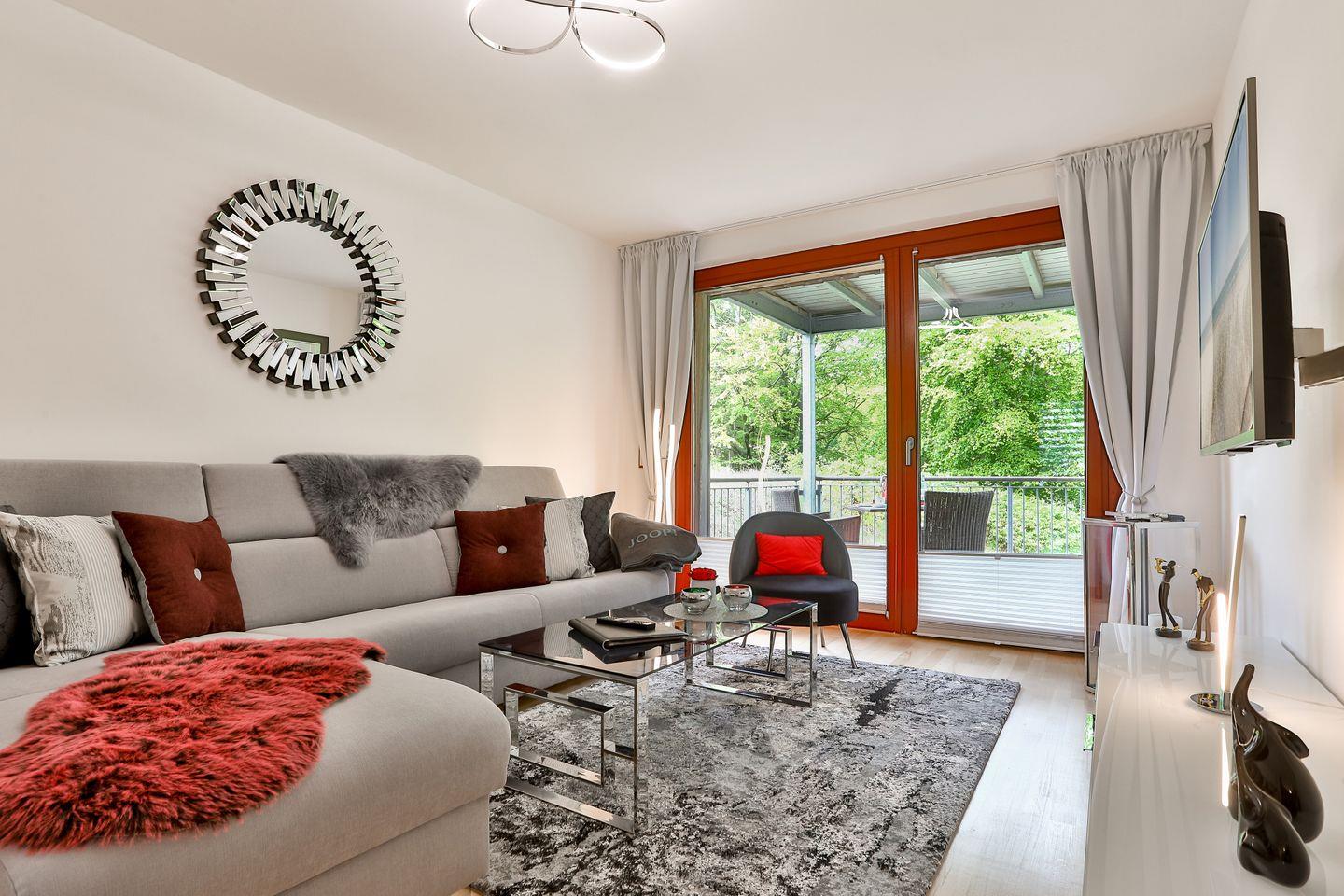 Unsere Ferienwohnung "Major" bietet einen hellen, großen Wohnbereich mit Flatscreen-TV und einer gemütlichen Essecke inklusive integrierter, vollständig ausgestatteter Küchenzeile. Sie haben einen Balkon mit Blick zur Meerseite und einen mit Blick in den Park – Helligkeit und Panoramablick garantiert.