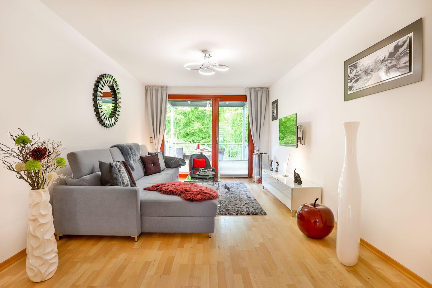 Die Ferienwohnung bietet einen Wohnbereich mit Flatscreen-TV und einer Essecke inklusive Küchenzeile mit Geschirrspüler, Kochfeld etc. Sie haben einen Balkon mit Blick zum Meer und einen mit Blick in den Park. Das Schlafzimmer ist mit einem Doppelbett ausgestattet. Im Wohnbereich befindet sich ein hochwertiges Schlafsofa. Das Duschbad mit WC ist mit einem Haartrockner und Kosmetikspiegel ausgestattet. Im Flur finden Sie einen separaten Abstellraum für Ihr Gepäck.