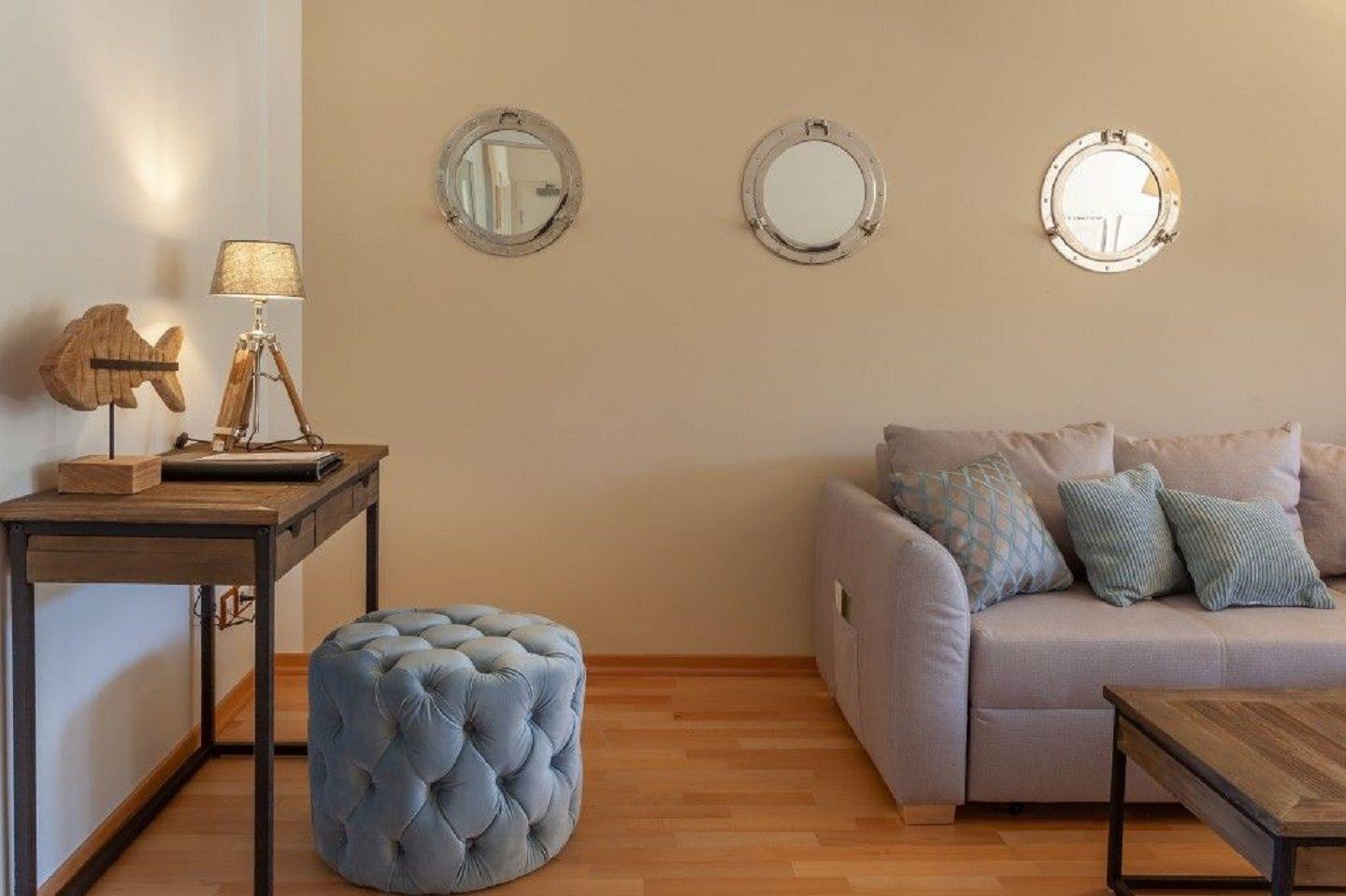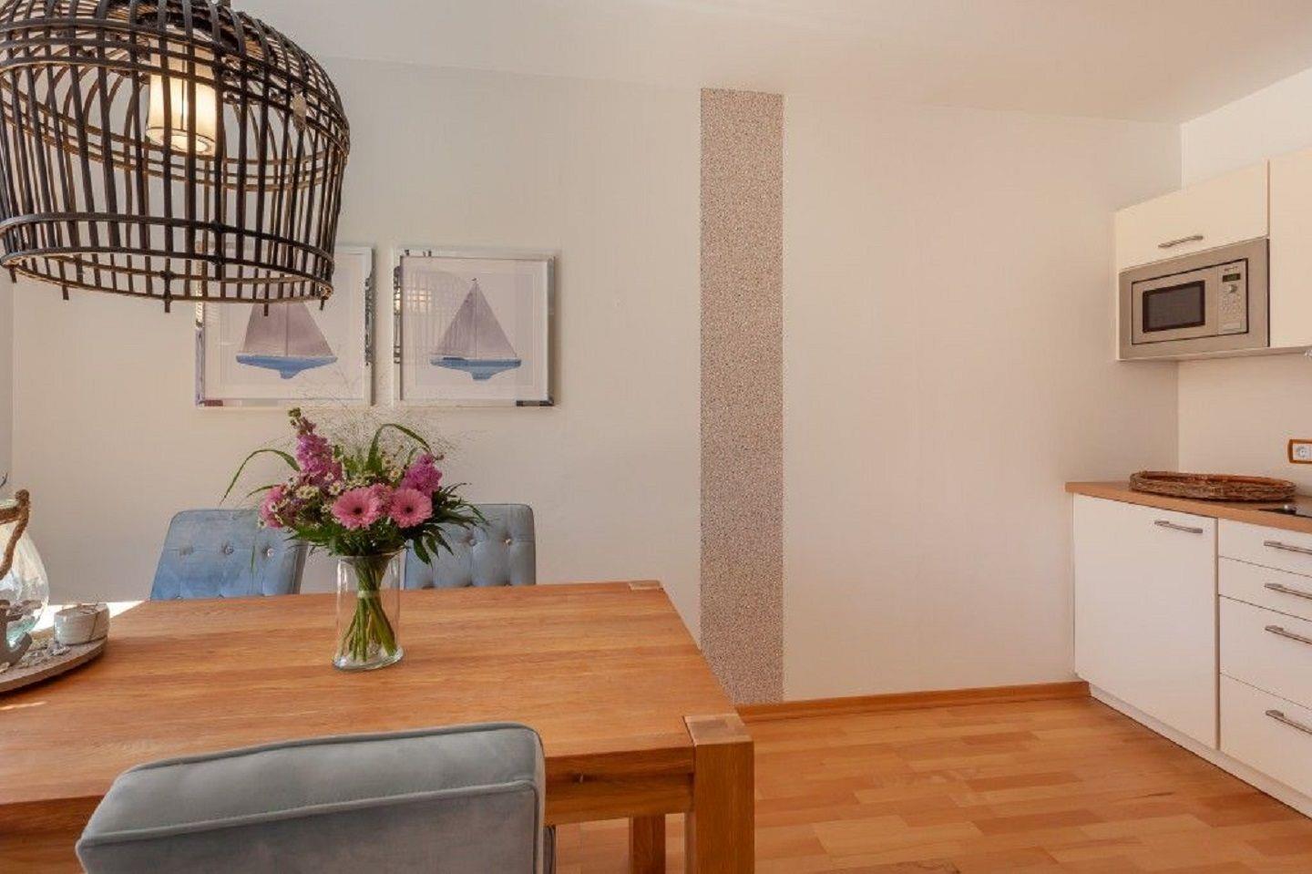 Im großzügigen, maritim gestalteten 3-Raum-Ferienappartement genießen Sie einen atemberaubenden Blick auf den Nationalpark Jasmund und die Ostsee bis hin zum Kap Arkona. Die Wohnung bietet auf ca. 74 qm Wohnfläche einen lichtdurchfluteten Wohnbereich mit Flatscreen-TV sowie einen gemütlichen Essbereich, der zum Verweilen einlädt. Die voll ausgestattete Küchenzeile mit neuen Geräten und reichlich Zubehör wie Nespresso-Kapsel- und Filterkaffeemaschine, Toaster und Wasserkocher ermöglichen es Ihnen, Ihre eigenen Mahlzeiten zuzubereiten. Zwei Balkone bieten unterschiedliche Ausblicke: Einer lädt zum Frühstück mit Blick auf den Park ein, der andere bietet am Abend einen wunderschönen Sonnenuntergang über Kap Arkona. In diesem hochwertigen Appartement für bis zu 4 Personen stehen zwei Schlafzimmer zur Verfügung, eines mit einem komfortablen Doppelbett und das andere mit zwei Einzelbetten. Das größere Schlafzimmer wurde 2024 komplett erneuert, um optimalen Schlafkomfort zu bieten. Eine separate Abstellkammer bietet zusätzlichen Stauraum für Ihr Gepäck. Das helle Duschbad mit WC verfügt über einen Haartrockner und Kosmetikspiegel und bietet ebenfalls einen herrlichen Blick auf das Meer. Ein Glasfaseranschluss sorgt für einen ausgezeichneten Internetzugang, und ein Stellplatz für Ihr Auto ist ebenfalls vorhanden. Das Appartement Birdie ist mit seinem Zugang zum Wander- und Radwegenetz des Nationalparks Jasmund der ideale Ausgangspunkt für einen abwechslungsreichen Urlaub, der sowohl Aktive als auch Erholungssuchende gleichermaßen begeistern wird.