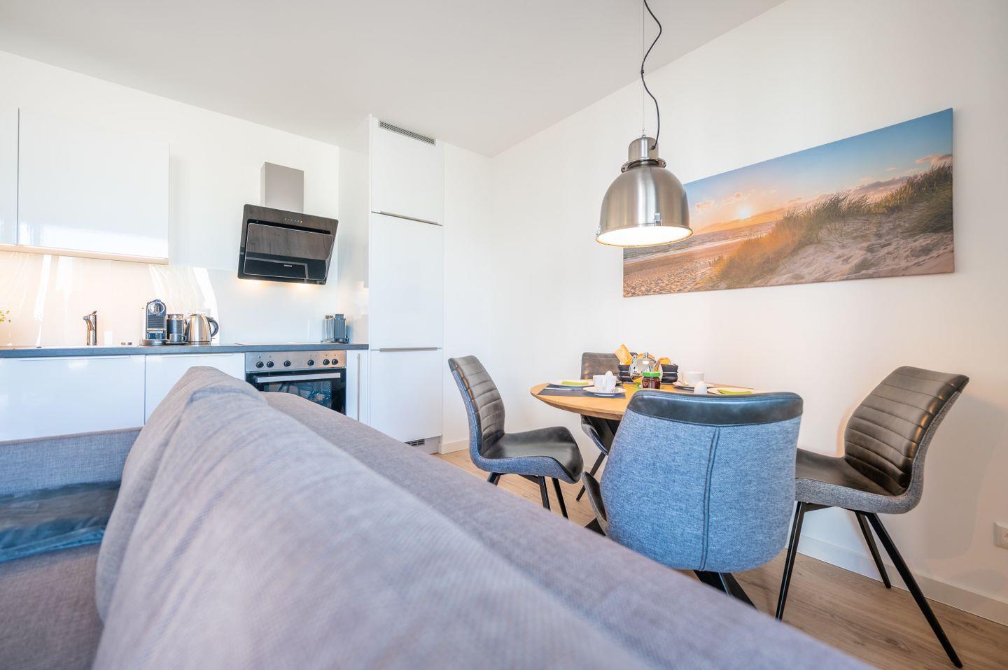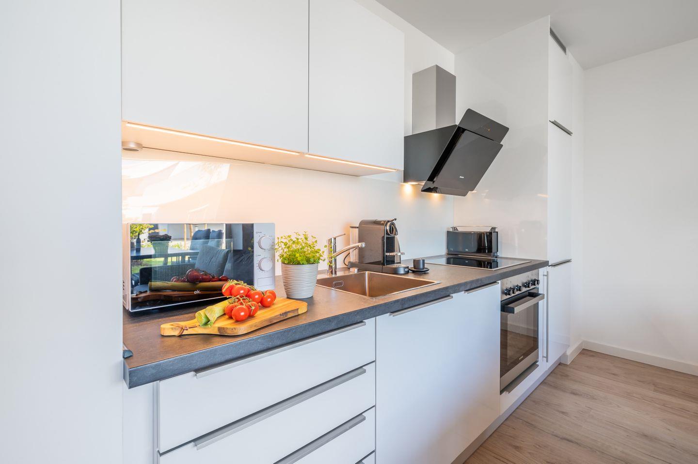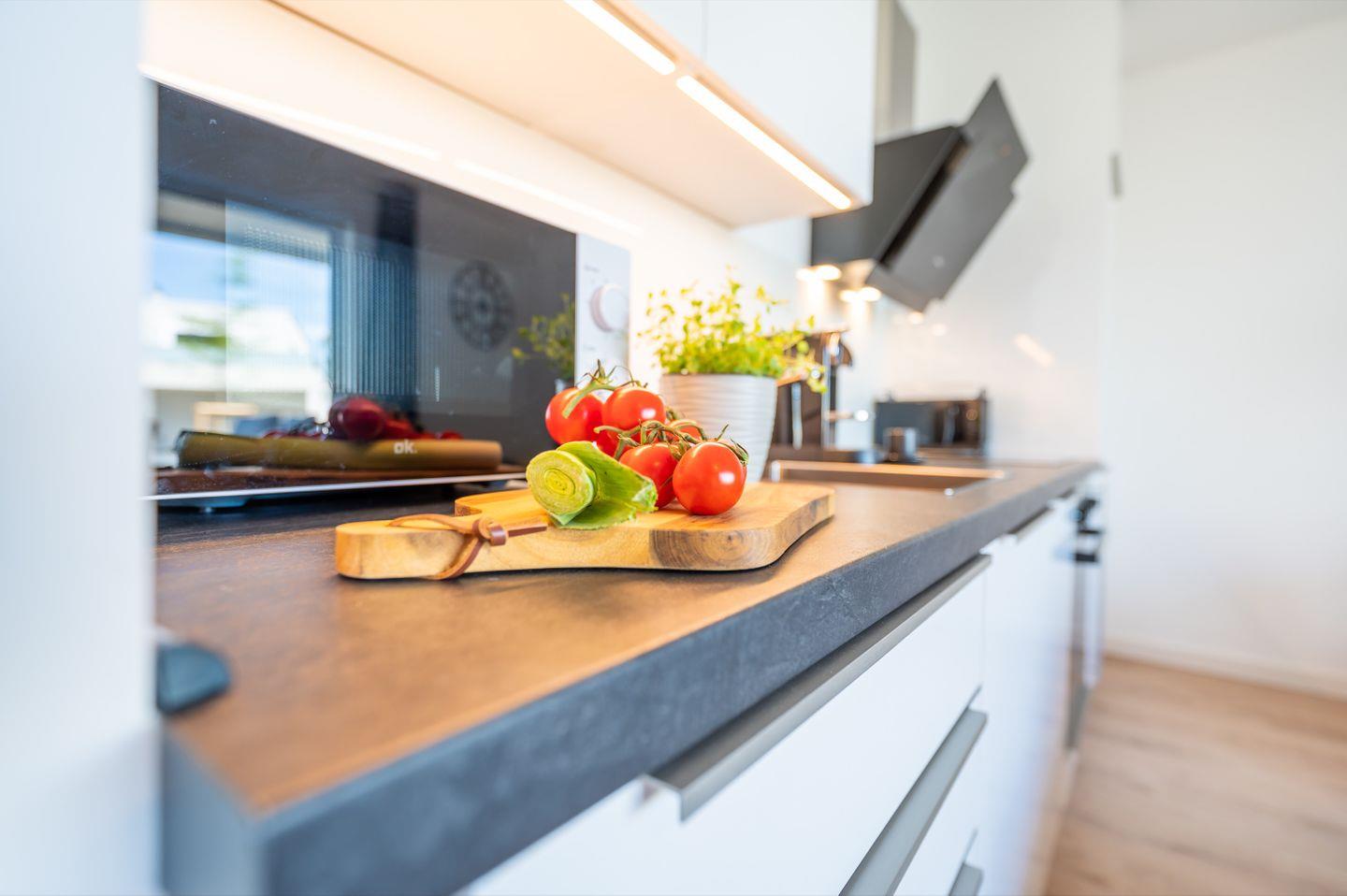 Hell und vollständig ausgestattet fügt sich die integrierte, moderne Einbauküche exzellent ein. Herd, Backofen, Kühlschrank mit Gefrierfach, Geschirrspülmaschine, Kaffeemaschine, Mikrowelle, Toaster, Wasserkocher und vieles mehr, die Küchenausstattung lässt keine Wünsche offen.