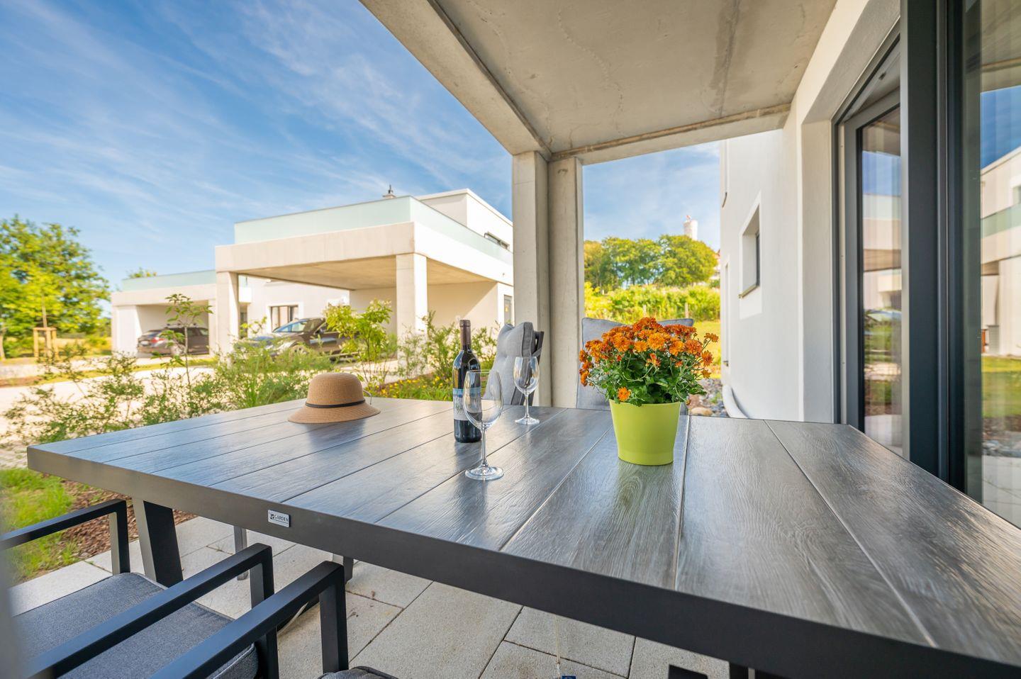 Die überdachte und bestückte Sonnenterrasse bietet nicht nur einen wundervollen Ausblick auf das historische Schloss Ranzow und die umgebende Natur, sondern bietet auch an trüberen Tagen Schutz und kann demnach auch an kalten Tagen genossen werden.