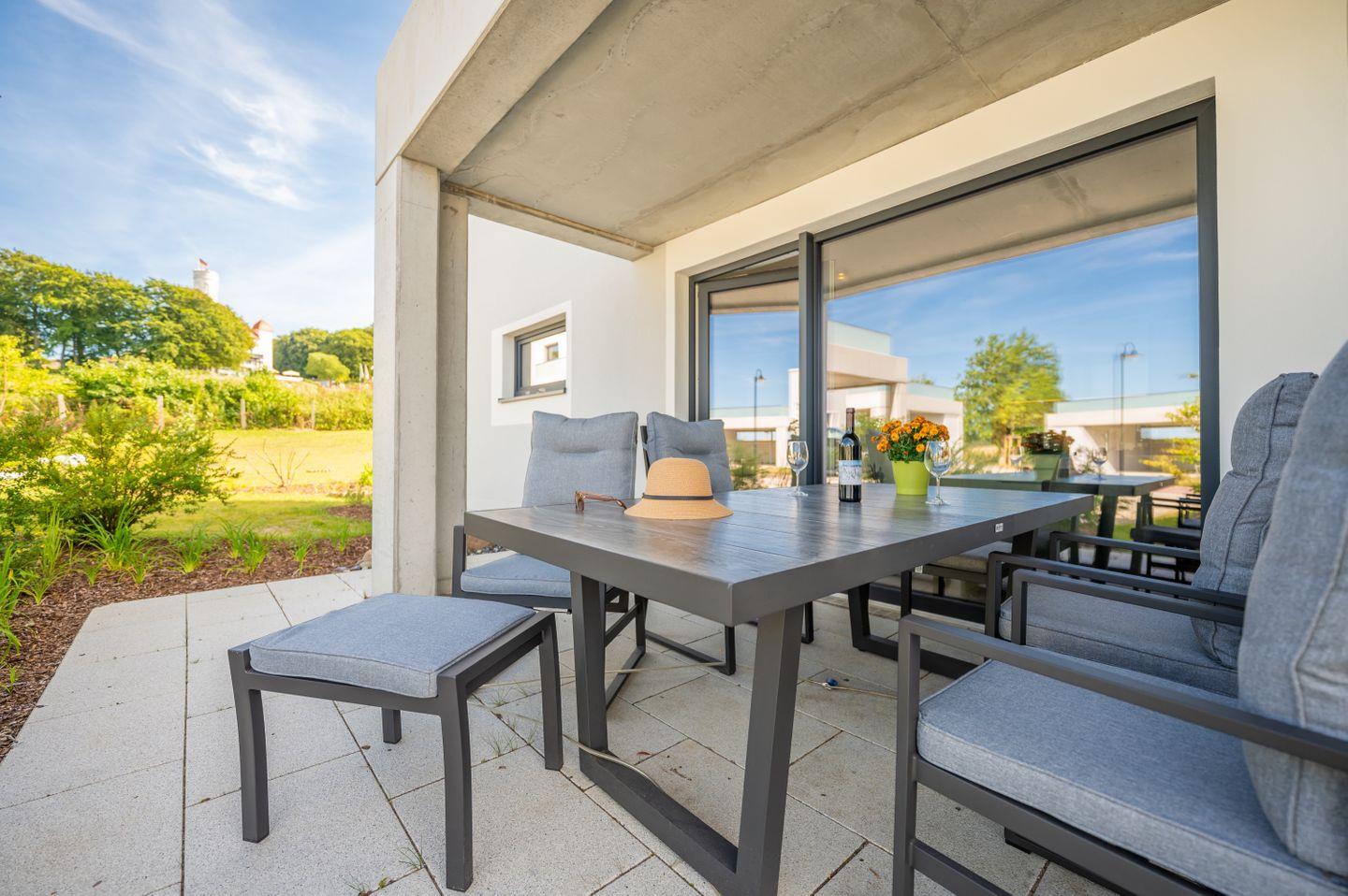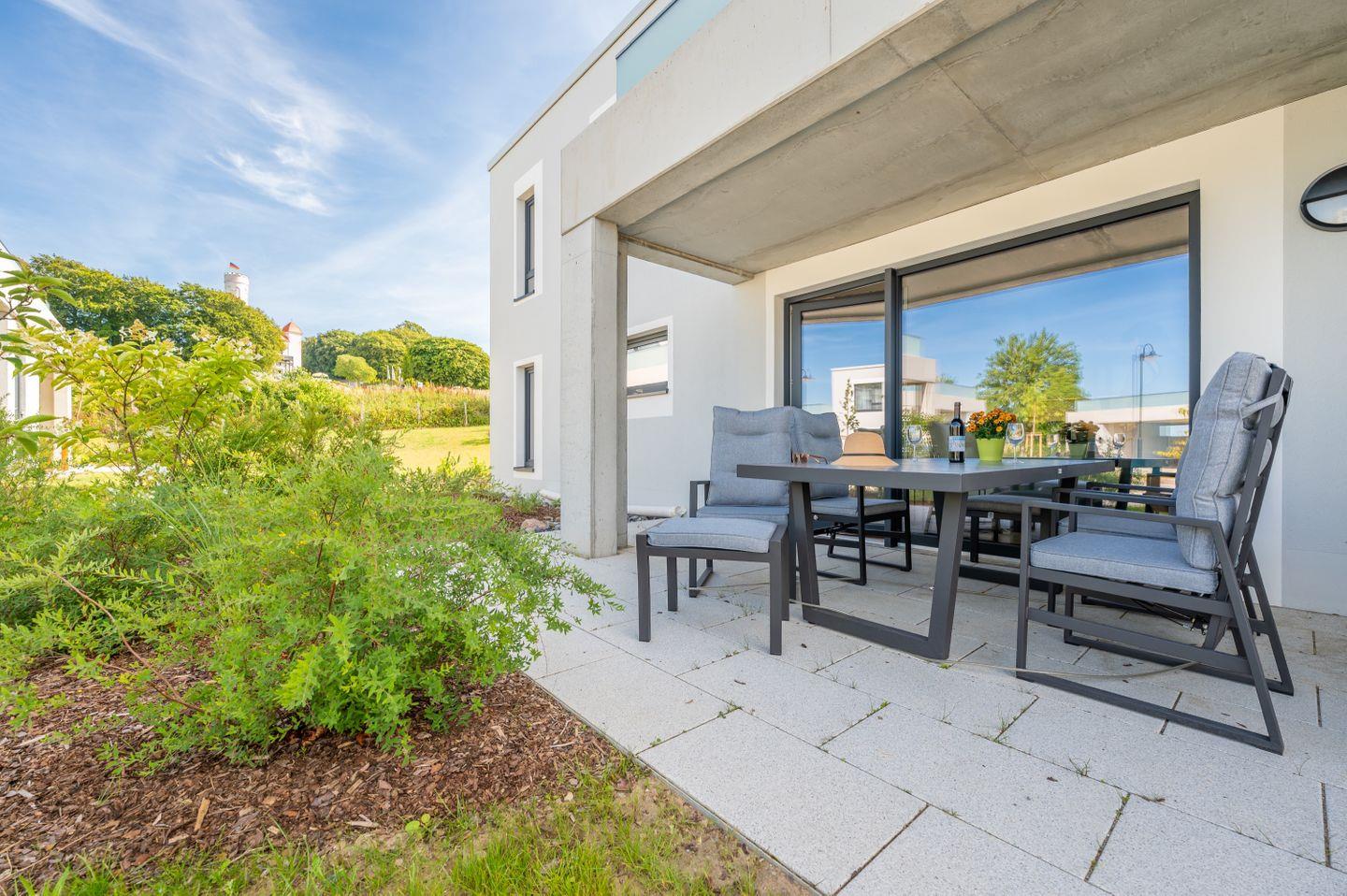 Unter dem Motto Natur, Komfort und Ruhe erwartet Sie diese charmante und lichtdurchflutete Ferienwohnung "Ankerplatz 1" mit einer Wohlfühlfläche von ca. 58 qm und Sonnenterrasse. Ideal für bis zu 3 Personen. - Die großzügige Sonnenterrasse verwöhnt Sie mit einem traumhaften Blick auf den Nationalpark Jasmund und auf das Schloss Ranzow mit Golfplatz. Ein überdachter Parkplatz steht Ihnen direkt am Haus zur kostenfreien Nutzung zur Verfügung.