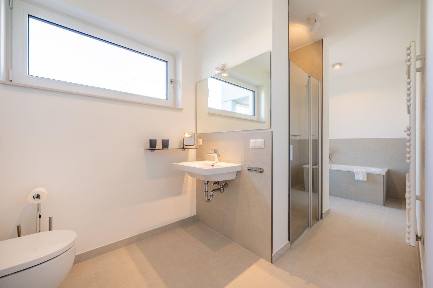 Das helle, moderne Bad mit Dusche und Badewanne ermöglicht einen perfekten Start in den Tag.