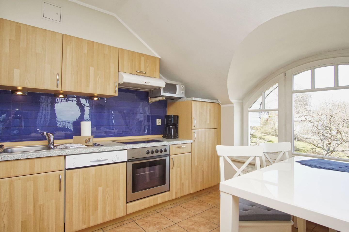 KÜCHE // offen Küche, 4-Platten Ceranherd, Spülmaschine, Kühlschrank mit Gefrierfach, Backofen, Kaffeemaschine, reichlich Besteck, Geschirr und Küchenutensilien ++