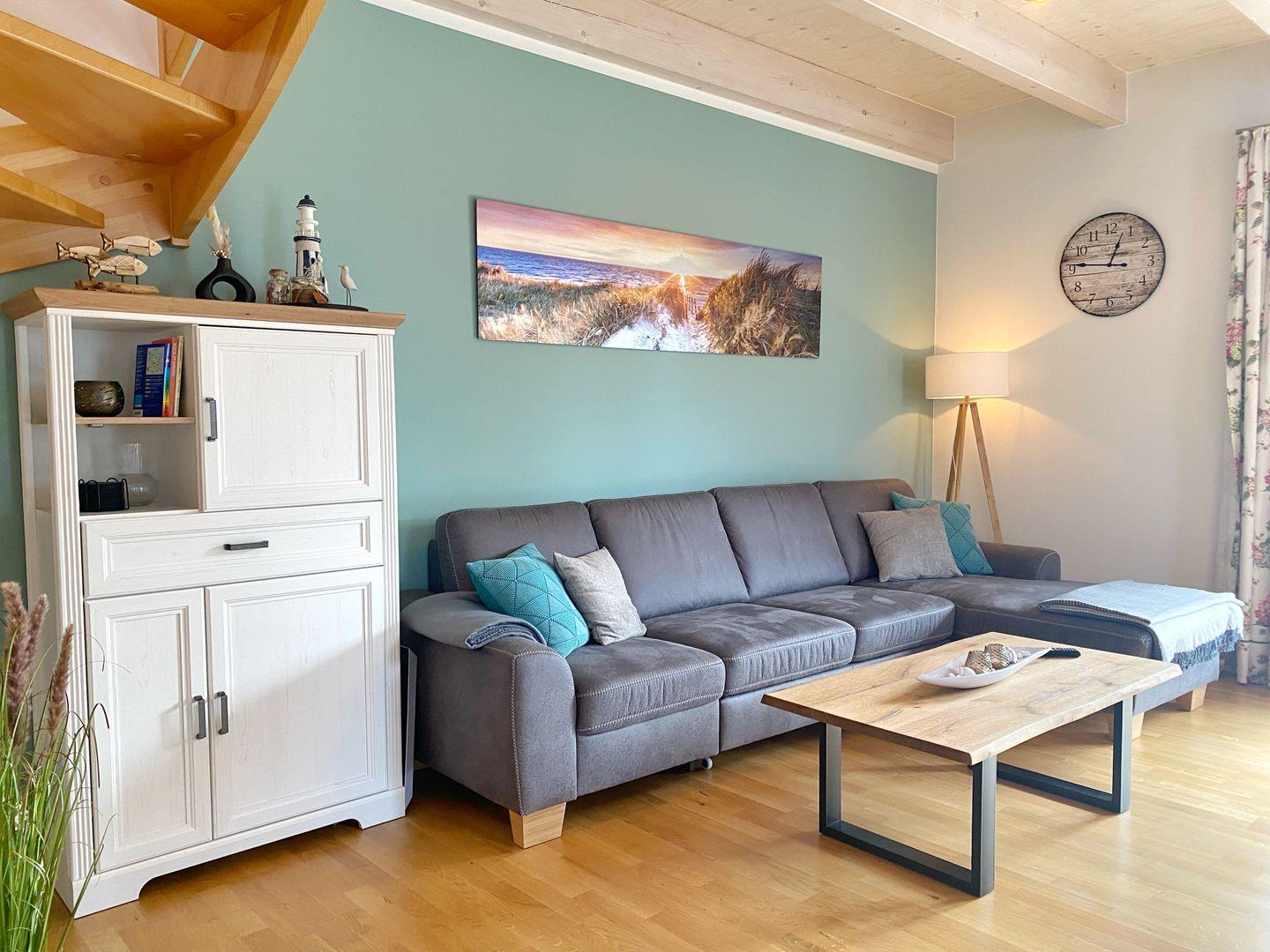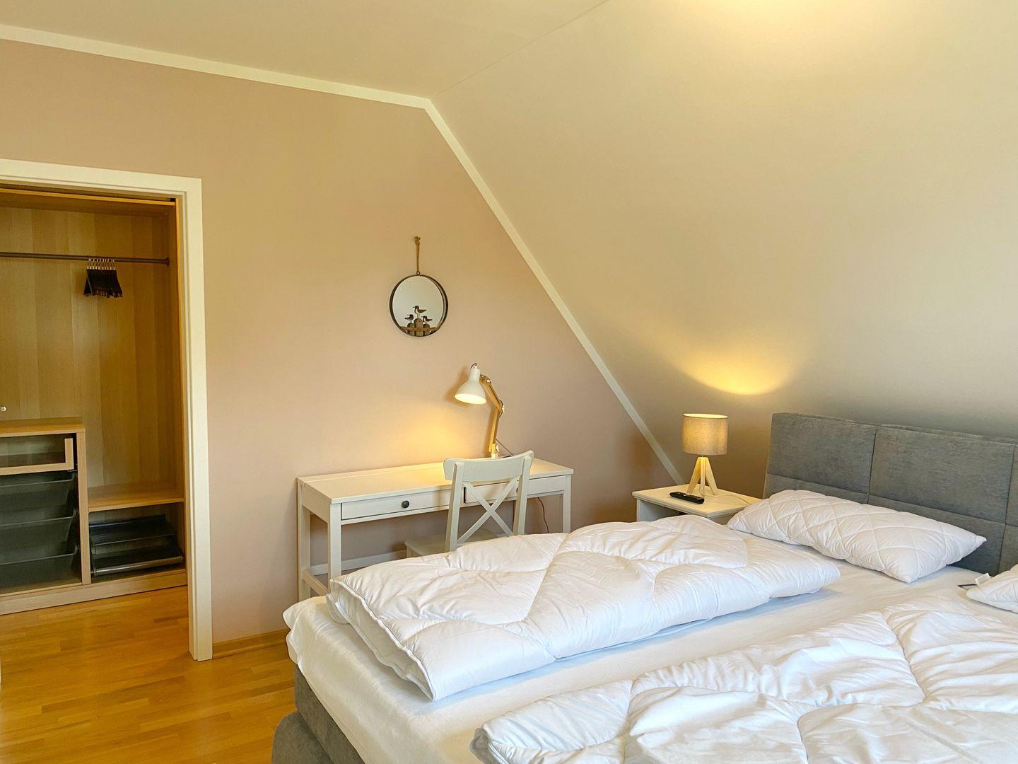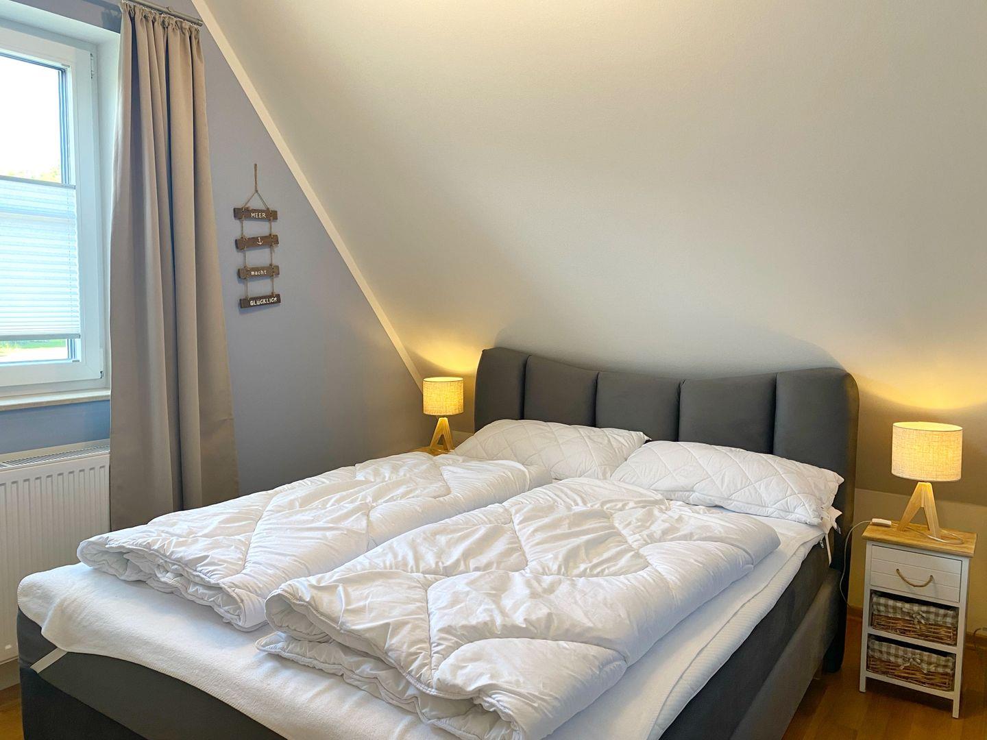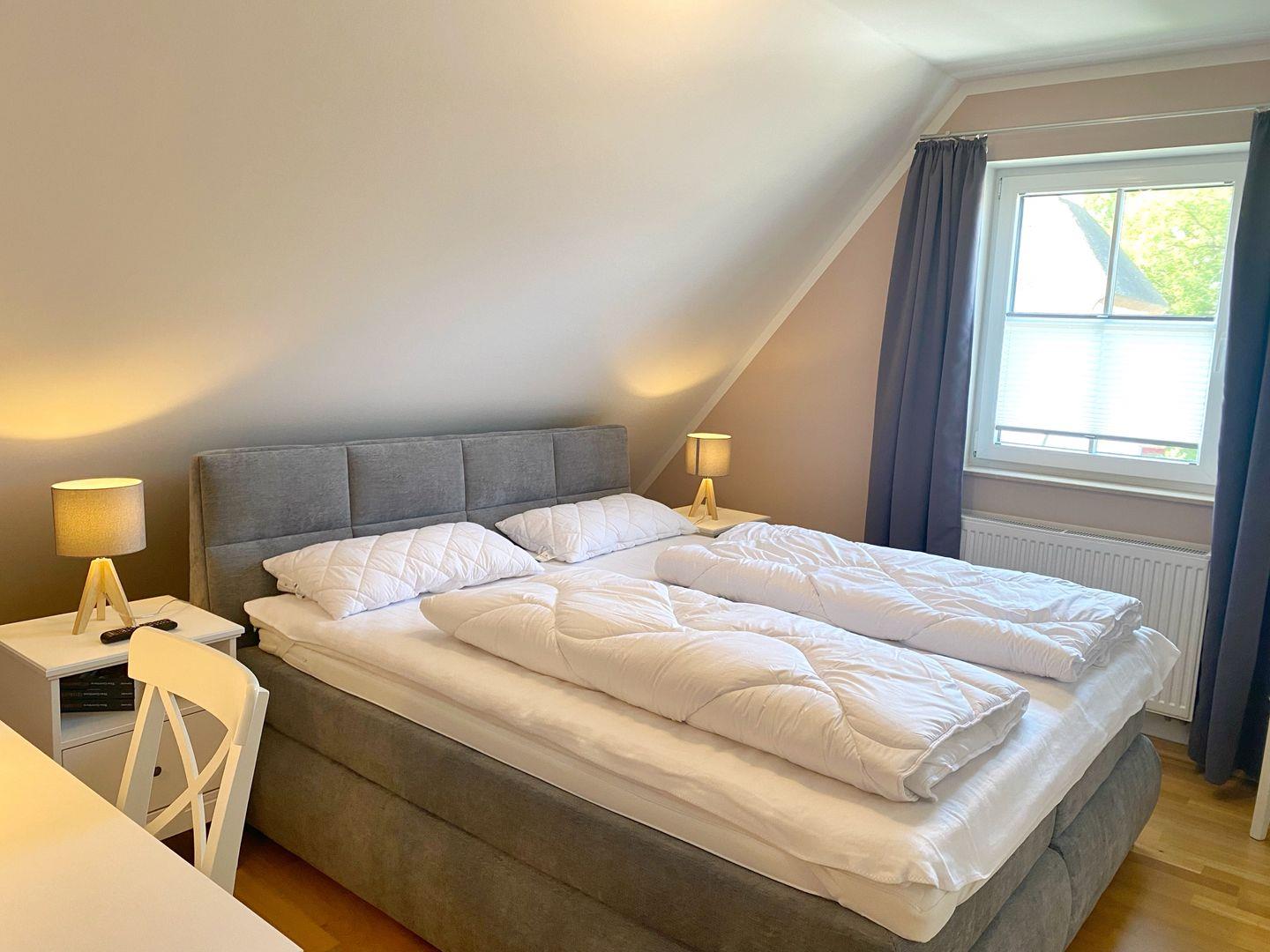 Im Obergeschoss befinden sich die beiden Schlafzimmer, beide ausgestattet mit bequemen Boxspring-Doppelbetten. Für kleine Gäste steht ein Reise-Kinderbett zur Verfügung. Eine 5. und 6. Person kann im Wohnzimmer auf der Schlafcouch nächtigen. Sowohl im Wohnzimmer als auch in beiden Schlafzimmern gibt es ein TV-Gerät.