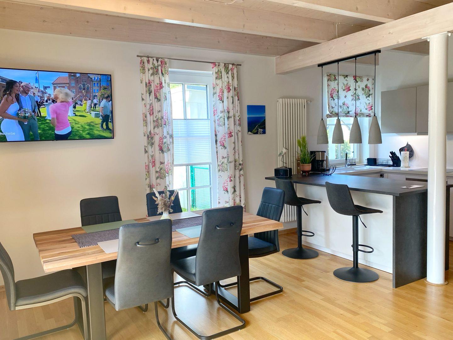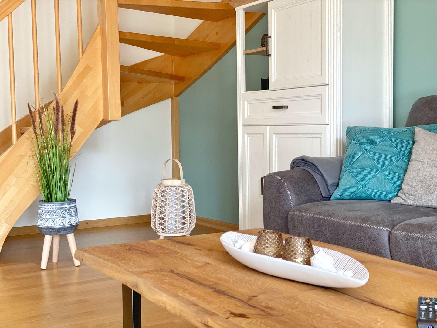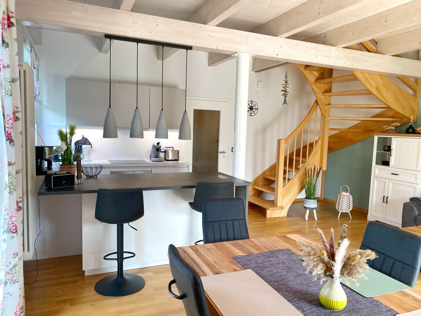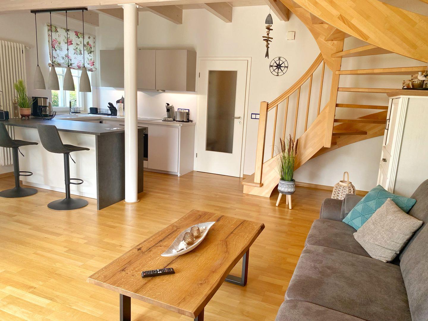 Im Erdgeschoss der Doppelhaushälfte befindet sich das gemütliche Wohn-Esszimmer mit offener Küche. Von dort gelangt man auf die vorgelagerte Terrasse und in den Garten. Der Wohnbereich ist in hellen Farben gemütlich und modern eingerichtet. Die moderne Einbauküche verfügt über Geschirrspüler, Cerankochfeld, Backofen, Kühlschrank mit Gefrierfach, Wasserkocher, Kaffeemaschine, Senseo-Kaffeeautomat, Toaster, Eierkocher und zahlreiche Küchenutensilien.