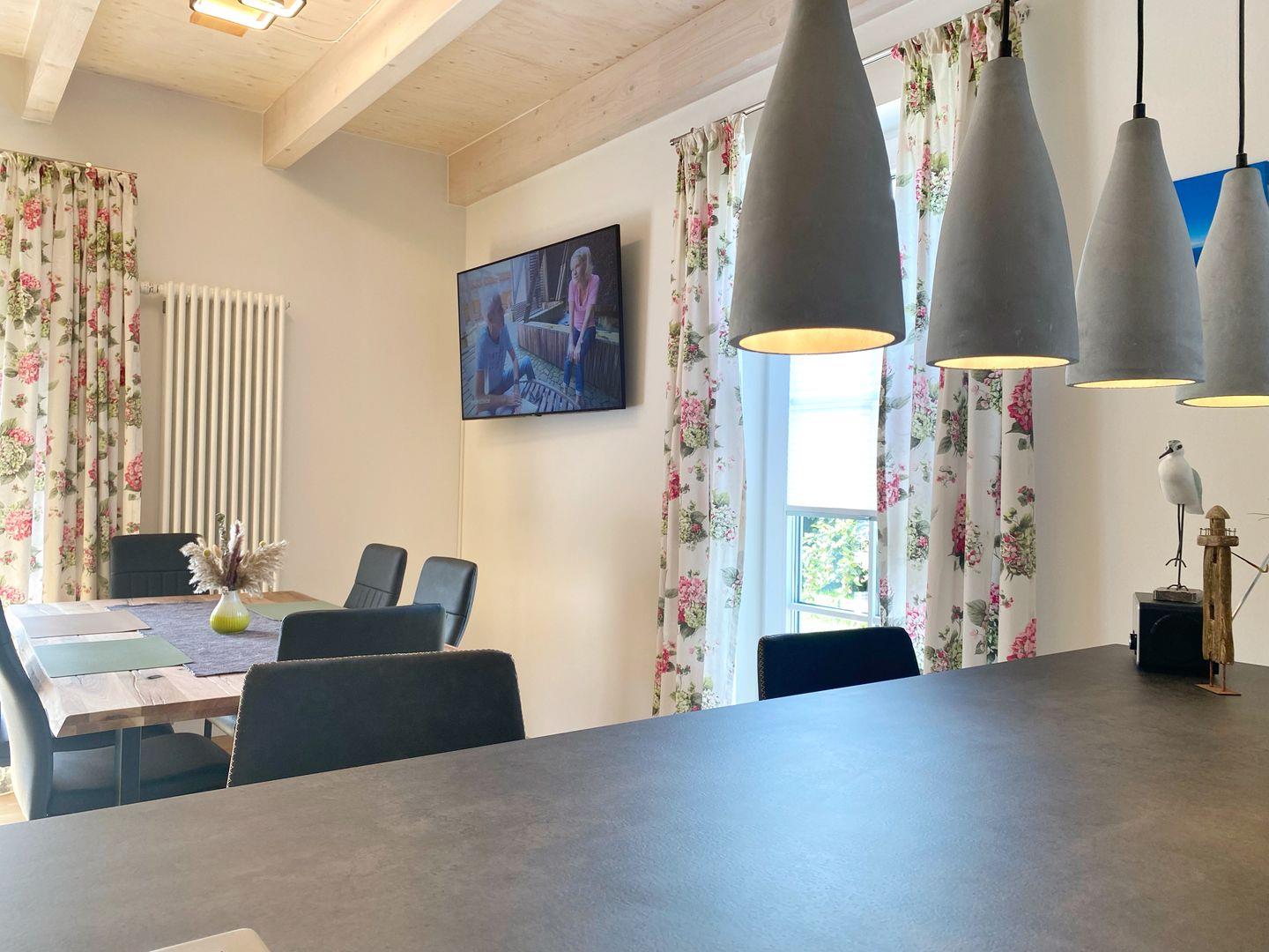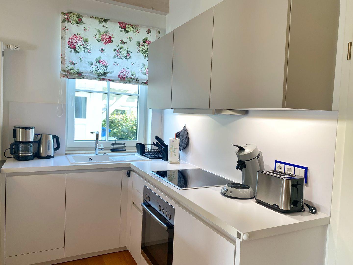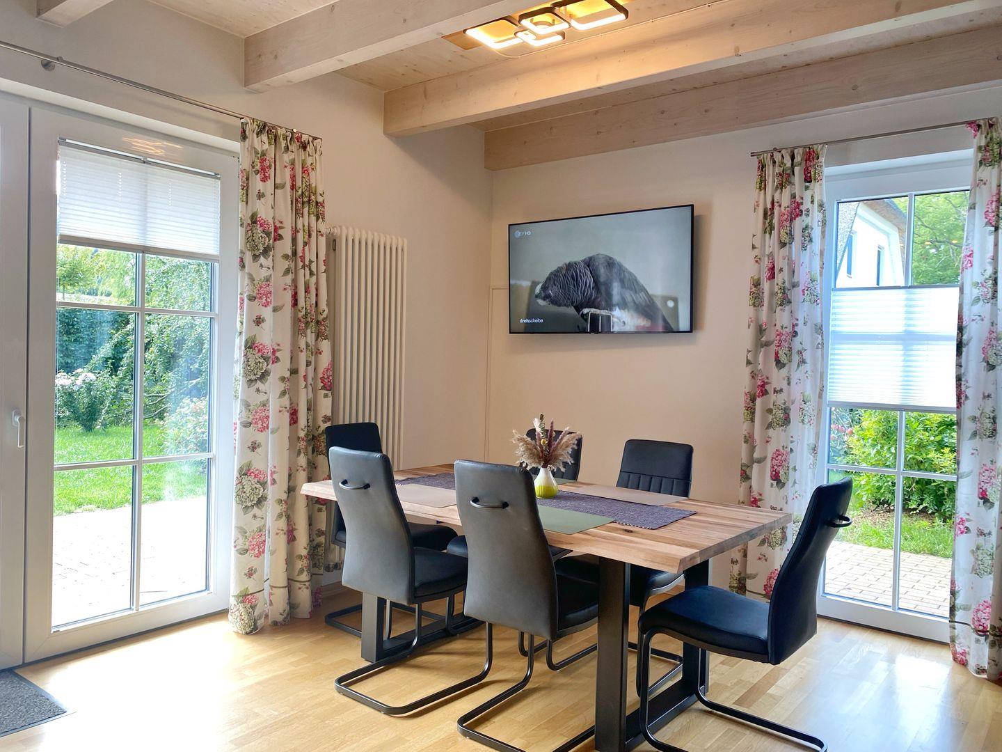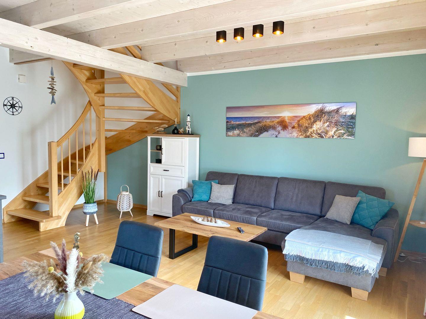 Im Erdgeschoss der Doppelhaushälfte befindet sich das gemütliche Wohn-Esszimmer mit offener Küche. Von dort gelangt man auf die vorgelagerte Terrasse und in den Garten. Der Wohnbereich ist in hellen Farben gemütlich und modern eingerichtet. Die moderne Einbauküche verfügt über Geschirrspüler, Cerankochfeld, Backofen, Kühlschrank mit Gefrierfach, Wasserkocher, Kaffeemaschine, Senseo-Kaffeeautomat, Toaster, Eierkocher und zahlreiche Küchenutensilien.