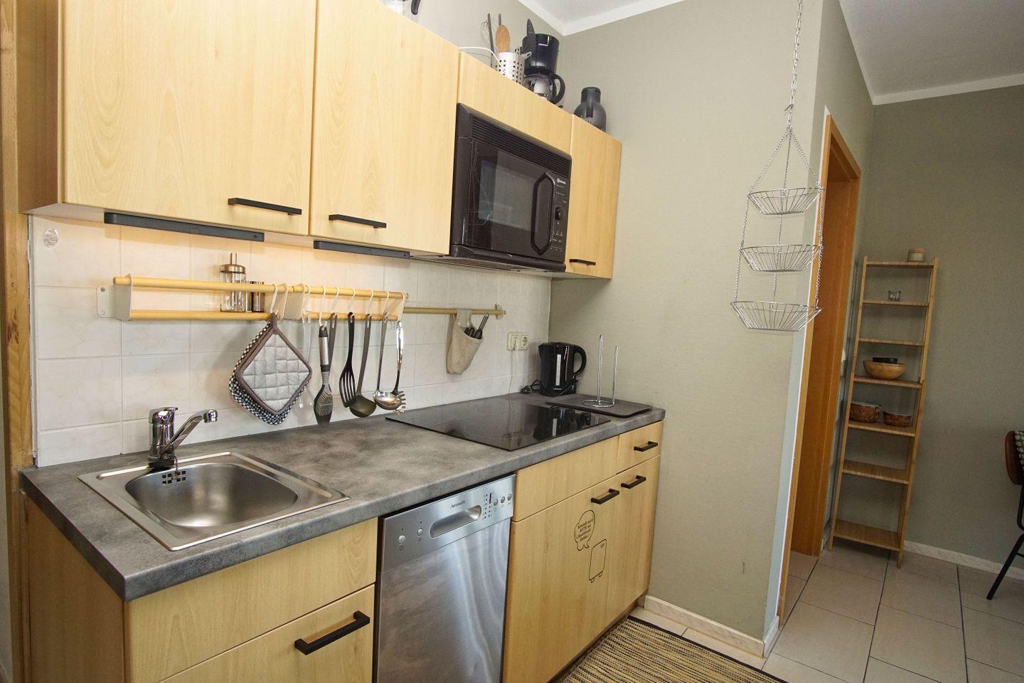 KÜCHE // offen Küche, 4-Platten Ceranherd, Mini Backofen, Spülmaschine, Kühlschrank mit Gefrierfach, Mikrowelle, Kaffeemaschine, reichlich Besteck, Geschirr und Küchenutensilien ++