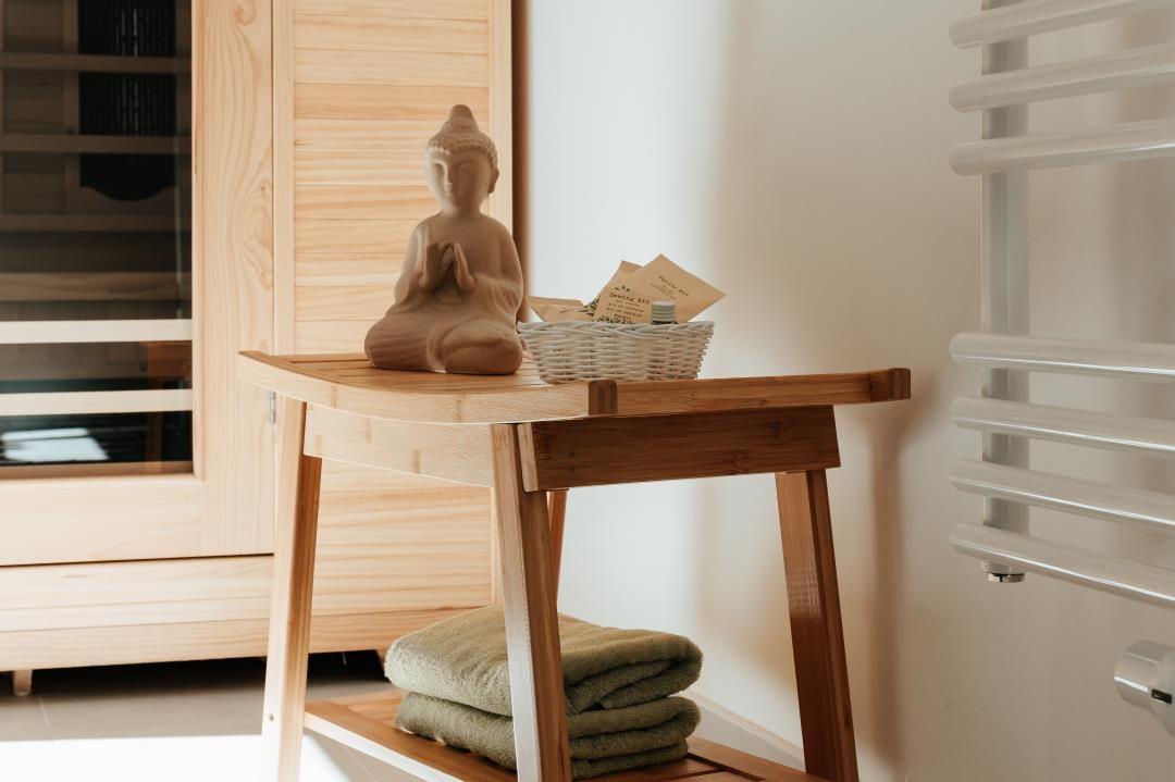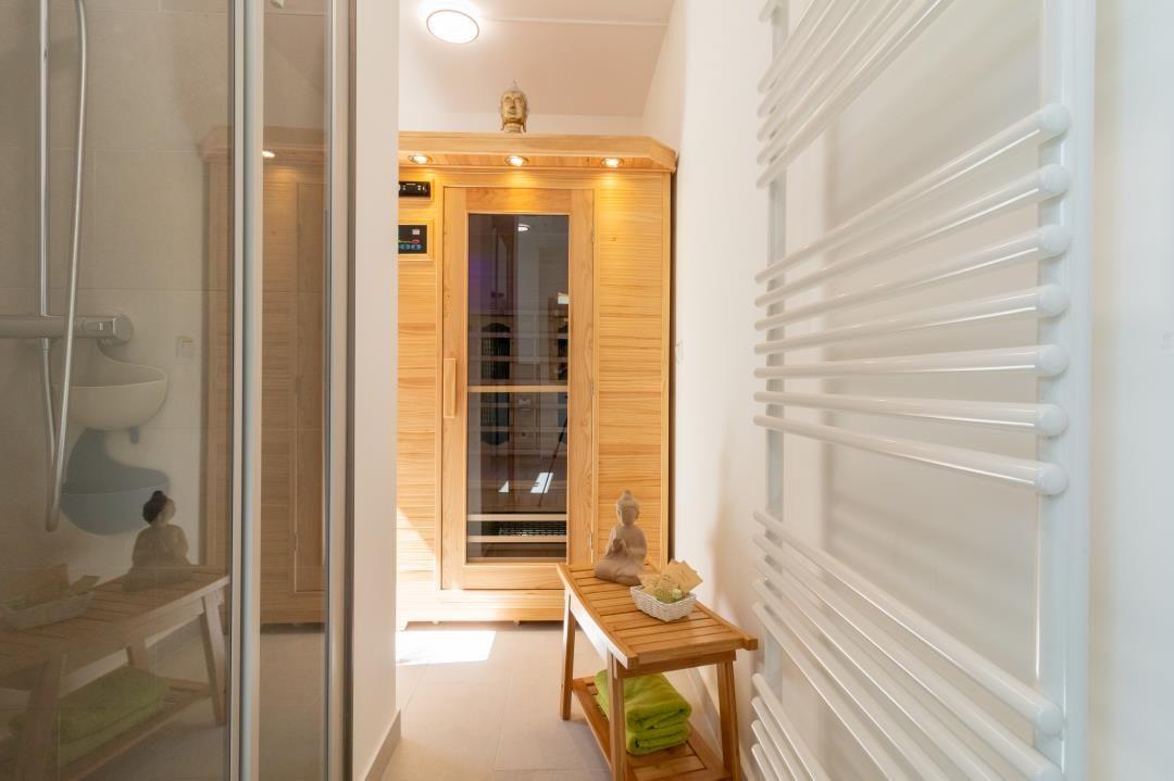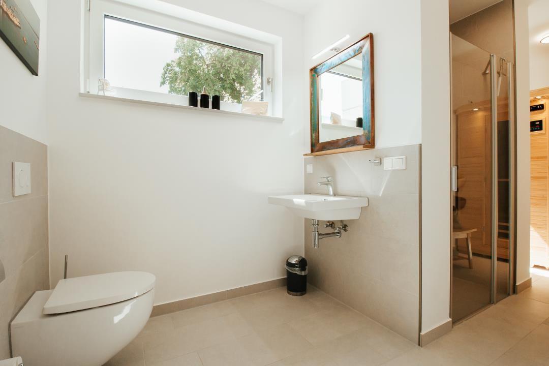 Im stilvollen Badezimmer erwartet dich eine moderne Infrarotsauna – perfekt zum Entspannen nach einem Tag an der frischen Ostseeluft. Eine bodengleiche Dusche, ein Föhn und moderne Badkeramik runden das Wellnessangebot ab.