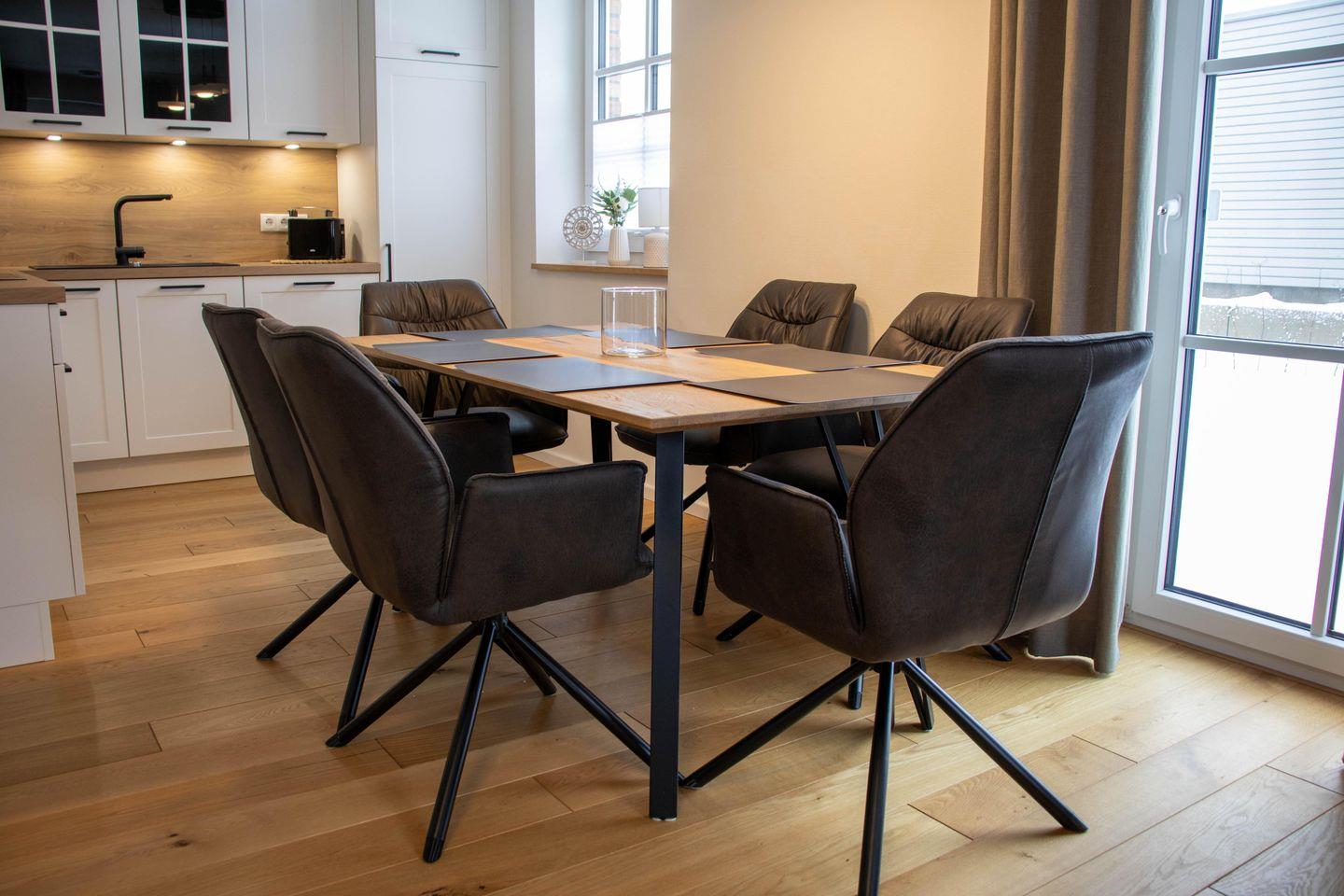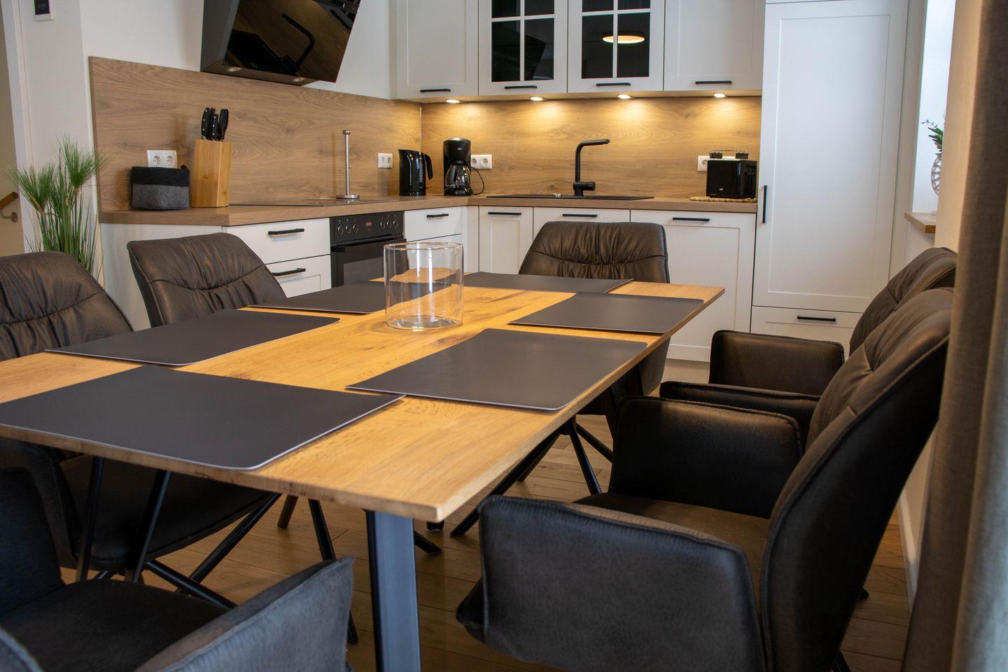 Im Erdgeschoss erwartet euch ein heller Wohnbereich mit Kaminofen, großer Sofalandschaft und Smart TV. Ihr kocht in der offenen Küche mit Kochinsel und modernen Geräten. Von hier aus gelangt ihr direkt auf die Terrasse und in den Garten. Im Sommer sitzt ihr draußen mit Blick ins Grüne. An kühlen Tagen sorgt der Kamin für eine angenehme Atmosphäre.