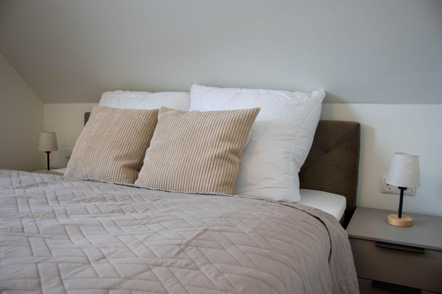 Drei Schlafzimmer mit komfortablen Boxspringbetten sorgen für erholsame Nächte. Zwei Zimmer liegen im Obergeschoss, ein weiteres im Souterrain. Alle Schlafzimmer sind mit TV ausgestattet. Verdunkelungsplissees unterstützen eure Nachtruhe.