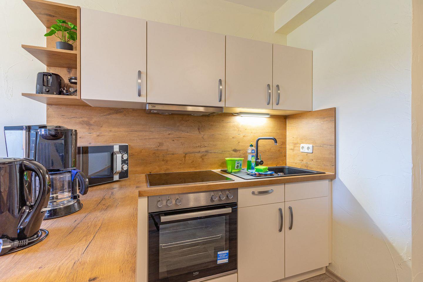 Der Wohnbereich ist praktisch und komfortabel gestaltet: Sofa, Sessel, Esstisch sowie TV und Internet/WLAN stehen Ihnen zur Verfügung. Eine Garderobe sorgt für Ordnung, ein Wäscheständer ist ebenfalls vorhanden. Die offene Küche zum Wohnzimmer ist mit Herd (2-Platten), Mini-Backofen, Kühlschrank, Mikrowelle, Kaffeemaschine, Wasserkocher und Toaster ausgestattet; Abfalleimer und Geschirrhandtücher sind vorhanden. Bettwäsche, Handtücher und eine Erstausstattung sind inklusive, sodass Sie entspannt anreisen können. Das Badezimmer verfügt über Dusche, WC, Waschbecken, Spiegel, Fenster und warmes Wasser.