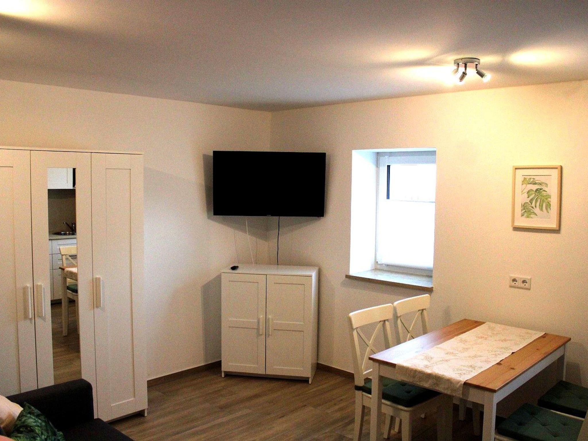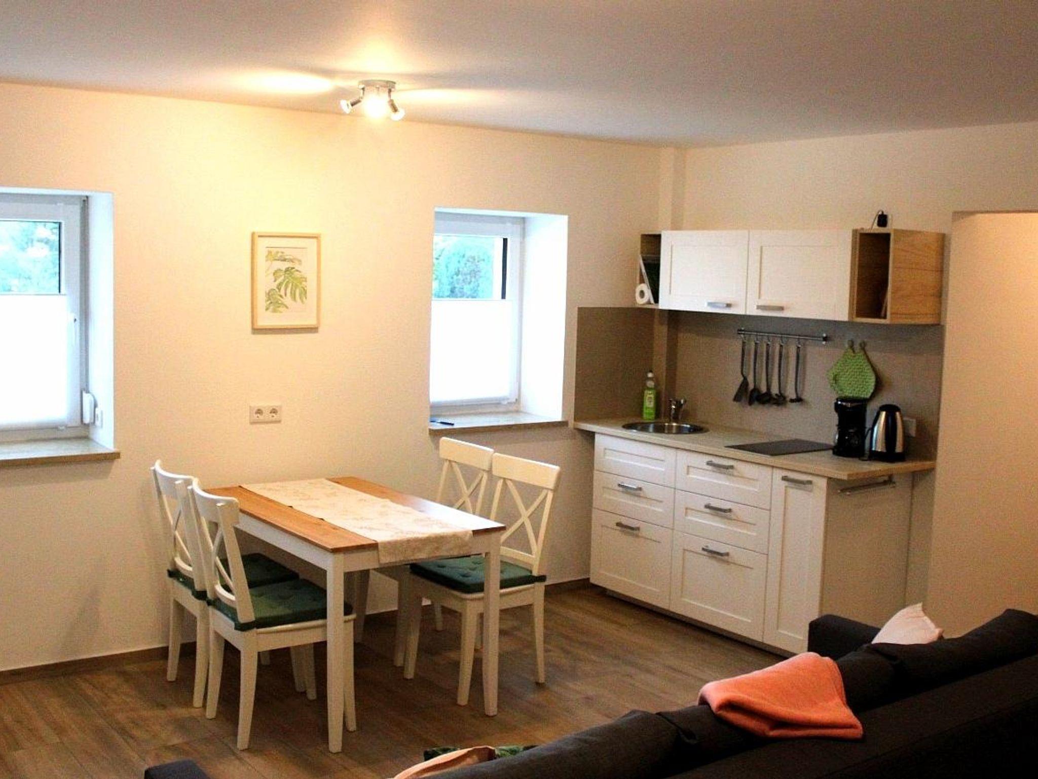 Die Ferienwohnung ist für 2 Personen geeignet. Im kombinierten Schlaf- und Wohnbereich befindet sich ein komfortables Doppelbett. Bei Bedarf kann für eine weitere Person das Sofa in eine Schlafcouch umgewandelt werden. Die Küche ist mit zwei Herdplatten, Kühlschrank, Toaster, Wasserkocher, Mikrowelle und einer Kaffeemaschine ausgestattet. Das neue Badezimmer enthält eine Dusche, Toilette und Waschbecken. Im Außenbereich lädt eine gemütliche Terrasse zum Entspannen z.B. nach einer Wanderung ein. WLAN ist vorhanden.