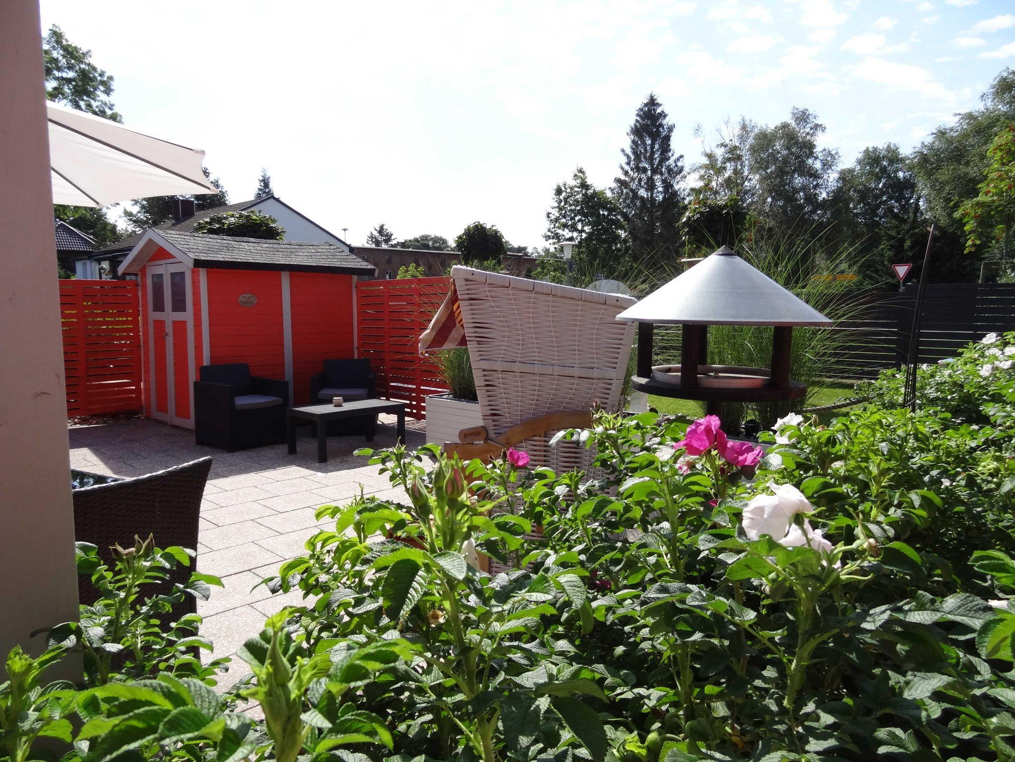 Zum Ferienhaus gehören eine große Terrasse mit Gartenmöbeln, Sonnenschirm und Grillmöglichkeit. Parkplatz und Wlan sind kostenfrei.