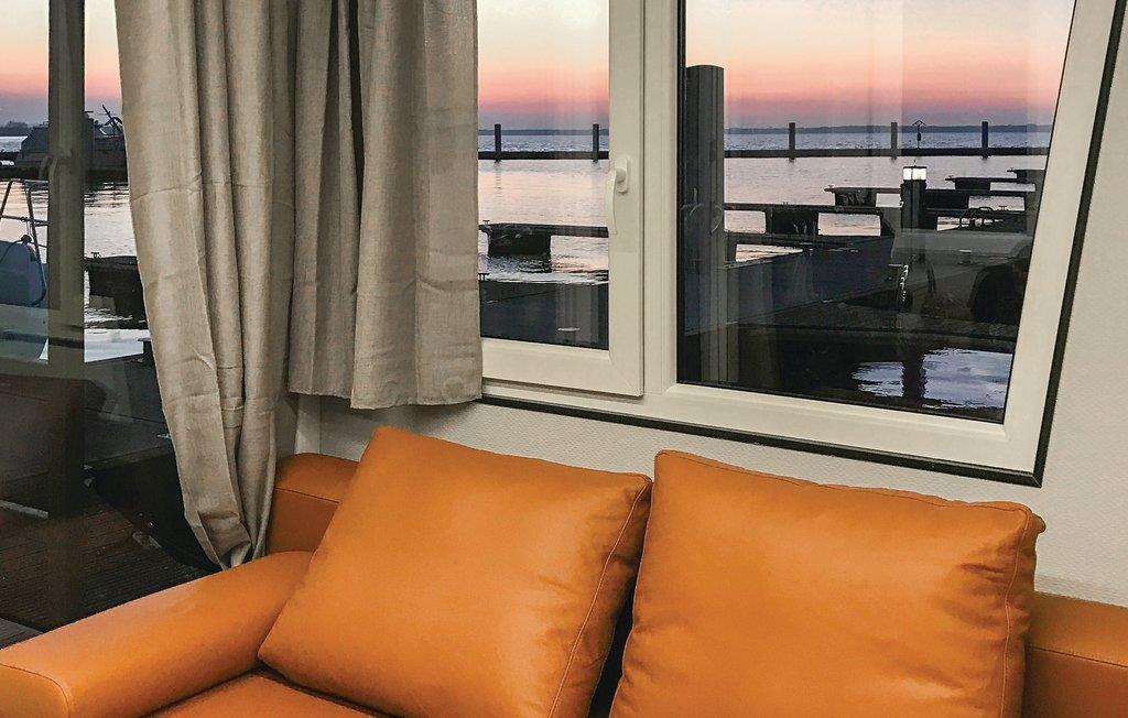 Sie betreten das Hausboot über die offene Terrasse am Bug und gelangen so in den Wohnbereich mit Steuerstand. Hier befindet sich auch die bequeme Schlafcouch und der Essbereich mit offener Miniküche. Der Schlafraum grenzt direkt an diesen an.