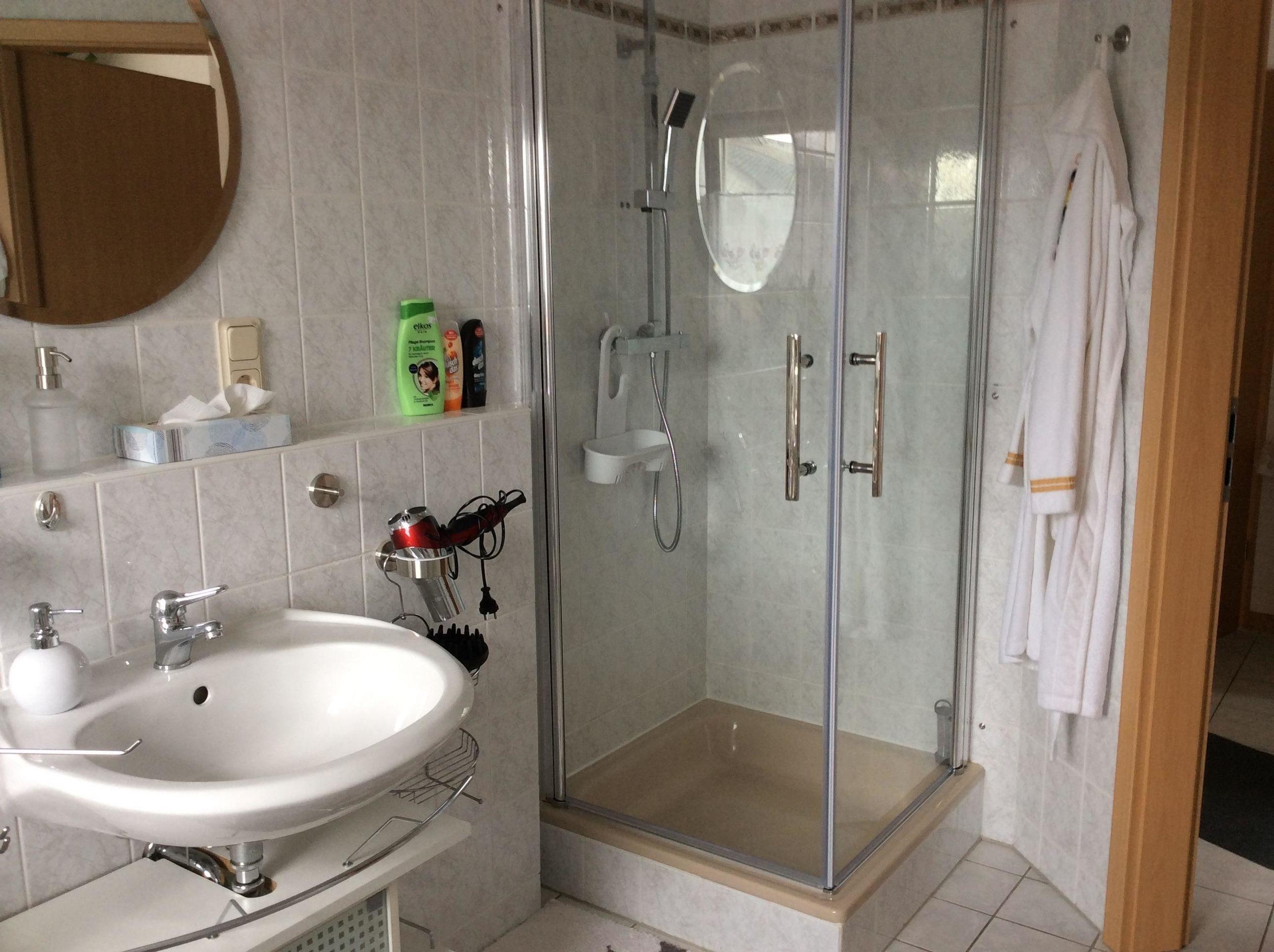 Im großen, modernen Badezimmer finden Sie Dusche, WC und Waschmaschine gegen Gebühr