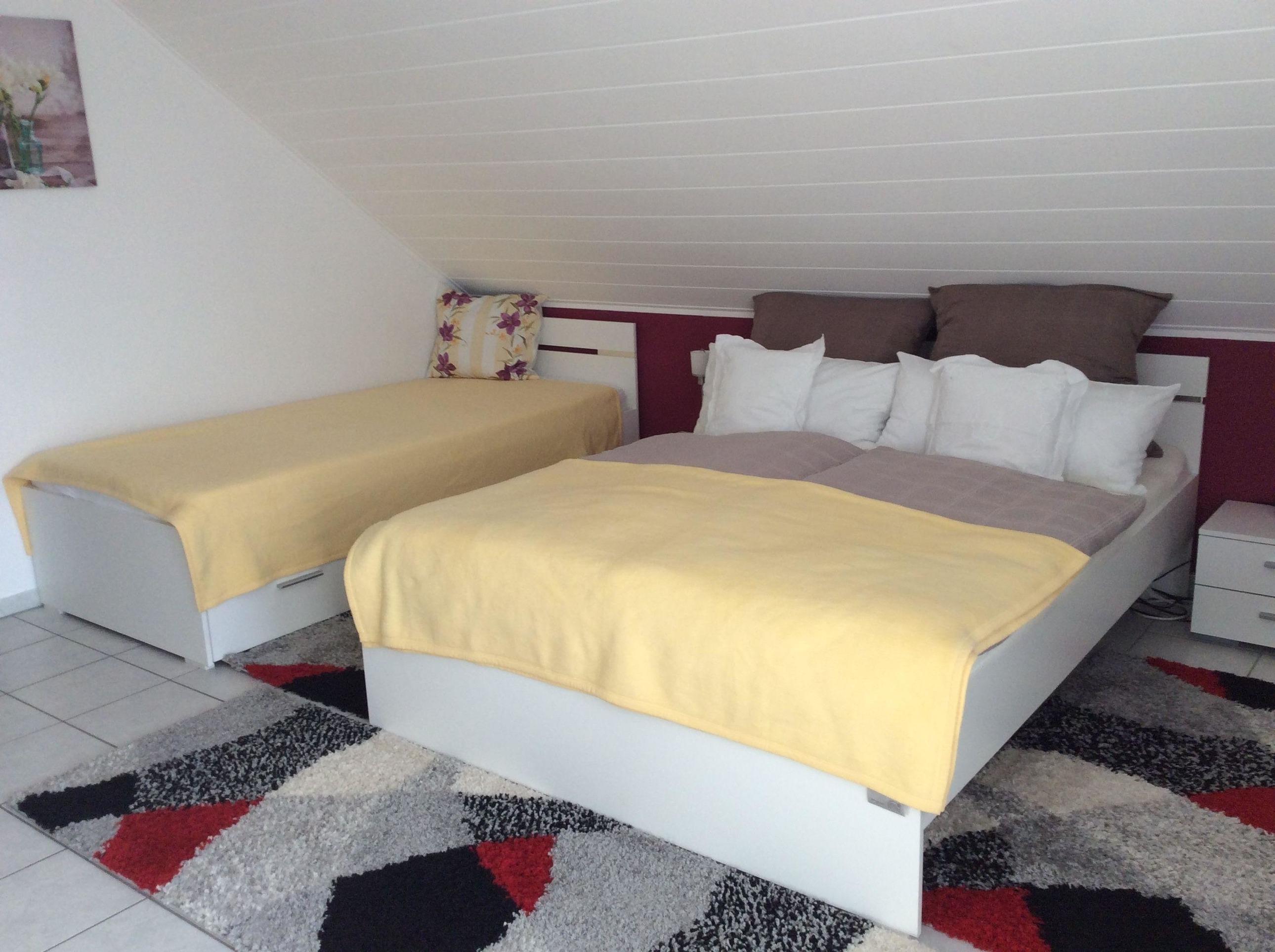 Weiteres bietet Ihnen die Wohnung ein separates Schlafzimmer. Dort finden Sie ein Doppelbett und ein Einzelbett.