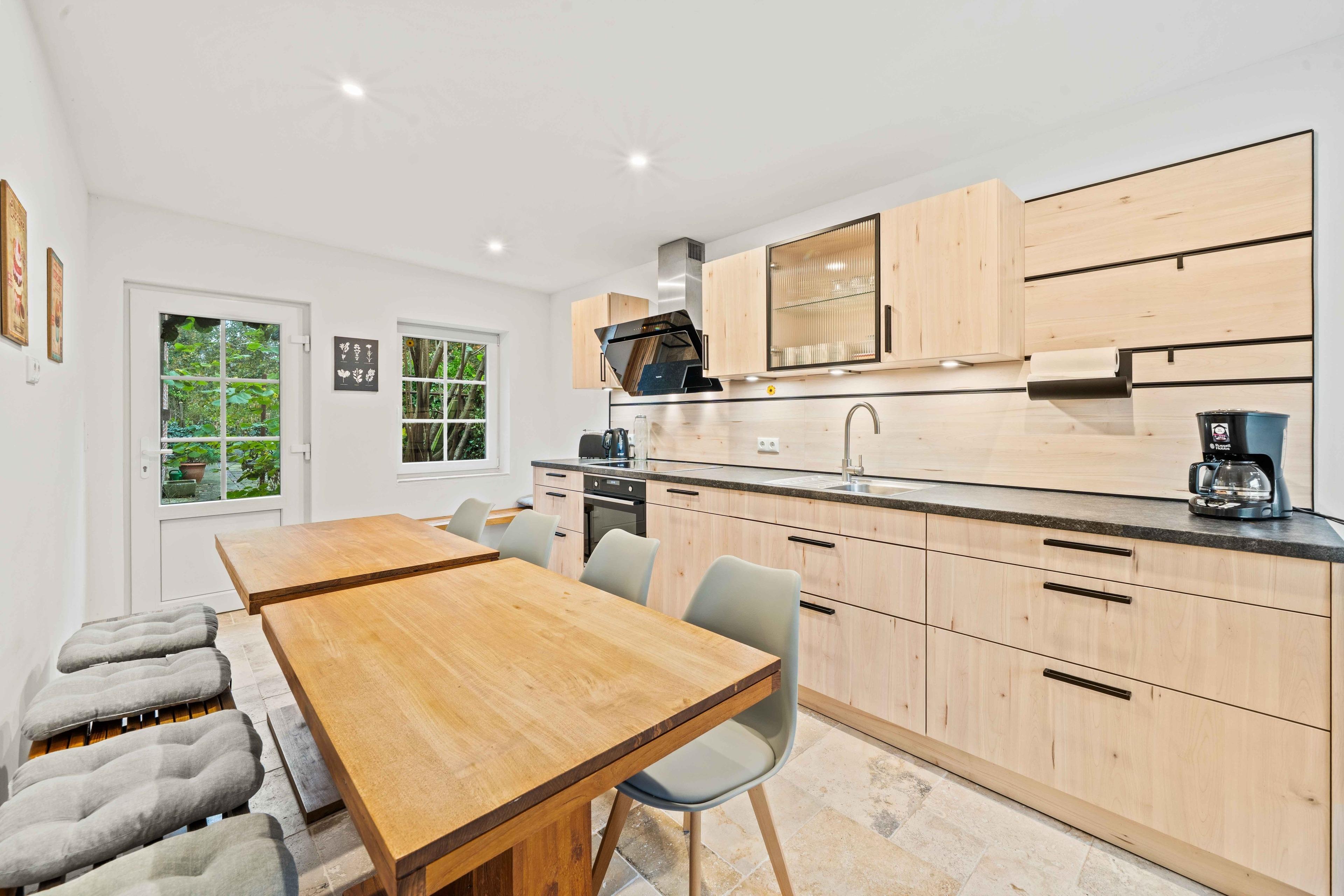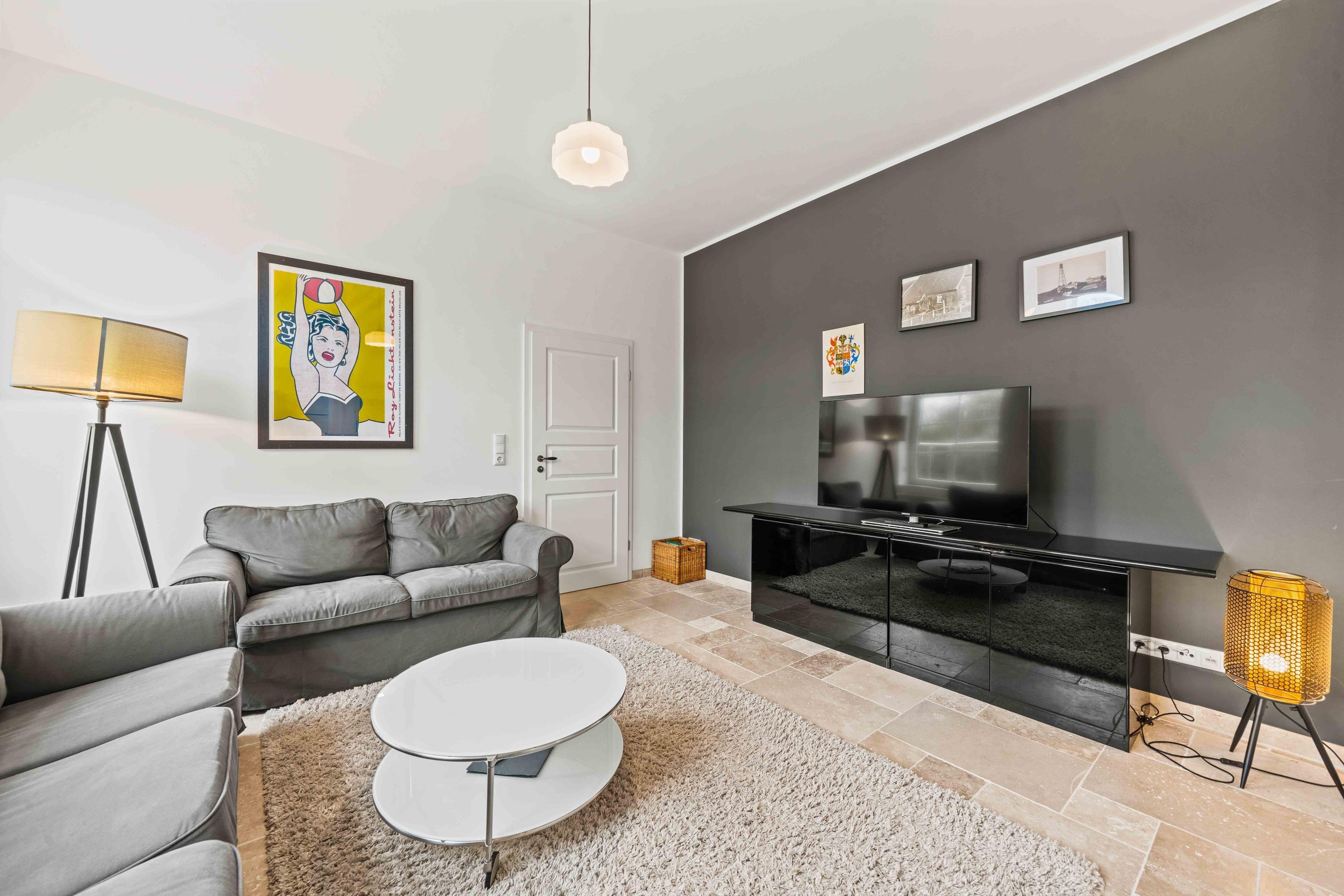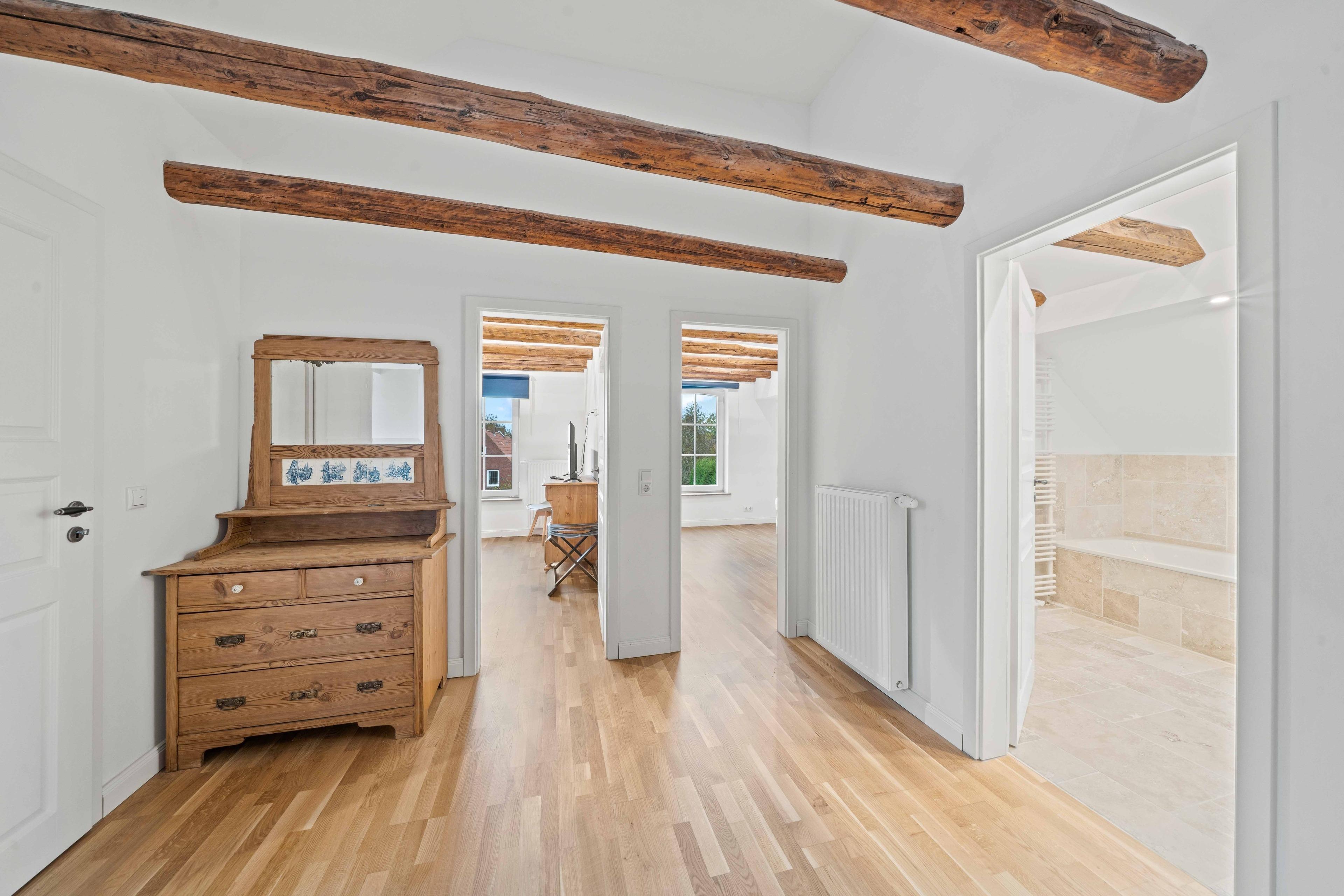 Inmitten der malerischen ostfriesischen Landschaft, im ruhigen Warfendorf Loquard, erwartet Sie das „Schmuckstück an der Nordsee“ – ein stilvolles Ferienhaus, das historische Atmosphäre mit modernem Wohnkomfort verbindet. Das großzügige Domizil befindet sich in einem ehemaligen Gulfhof, der mit viel Liebe zum Detail aufwändig saniert wurde. Hier treffen traditionelle Architektur und modernes Interieur aufeinander, wobei alte Holzbalken erhalten wurden, die das Ferienhaus besonders wohnlich und gemütlich machen. Auf 140qm Wohnfläche finden Familien und Freundesgruppen reichlich Platz zum Entspannen, denn das Haus verfügt über vier einladende Schlafzimmer, jedes davon mit einem komfortablen Doppelbett und TV ausgestattet. Zwei moderne Badezimmer sorgen für ausreichend Privatsphäre: Während eines der Bäder neben einer ebenerdigen Dusche auch eine freistehende Badewanne bietet, überzeugt das zweite Bad ebenfalls mit einer ebenerdigen Dusche und hochwertiger Ausstattung. Das Herzstück der Ferienwohnung ist der große Wohnbereich mit gemütlicher Sofaecke. Etwas abgetrennt finden Sie die voll ausgestattete, hochwertige Küche mit geräumigem Esstisch. Im Außenbereich erwartet Sie vor dem Haus eine möbilierte Terrasse, sowie eine Grün- und Steinfläche, auf der getobt oder gespielt werden kann. Auch vierbeinige Familienmitglieder sind hier herzlich willkommen.