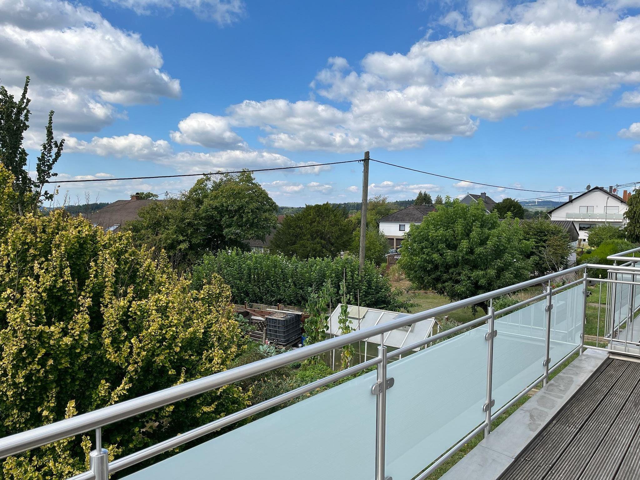 Der große ums Eck gehende Balkon ist sowohl vom Wohnzimmer als auch von einem der Schlafzimmer aus begehbar und bietet einen wunderschönen Blick ins Grüne.