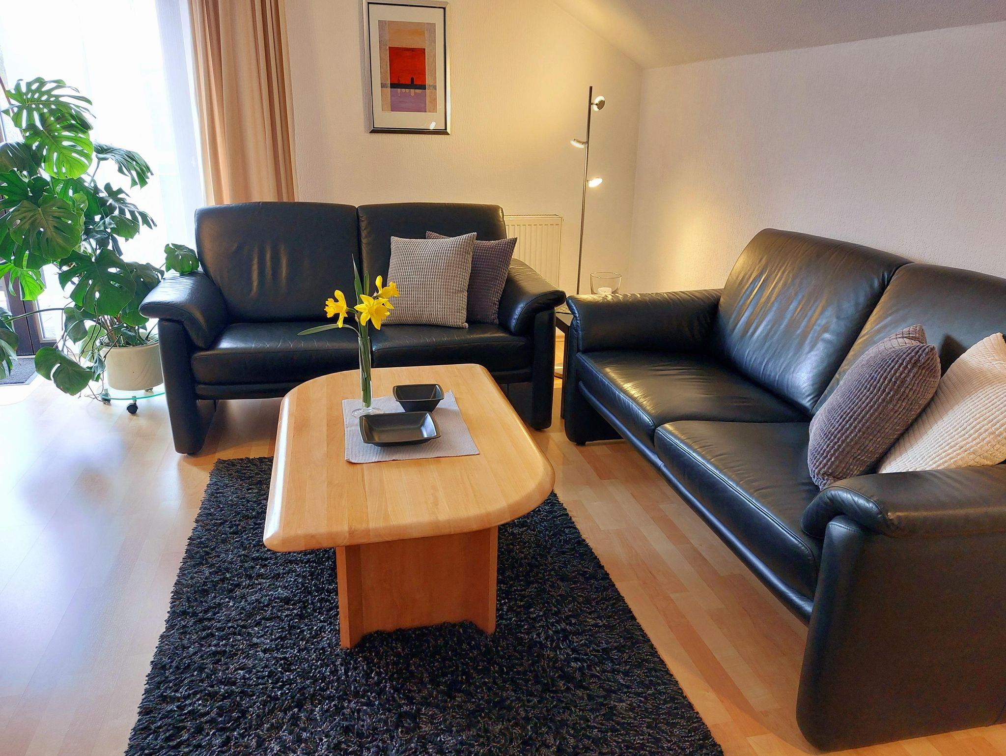 Komfortable familienfreundliche Ferienwohnung *****, ruhig am Waldrand, 90 qm, bis 4 Pers. (+ Kinderbett); separate Küche, komplett ausgestattet, Spülmaschine, Elektroherd, Mikrowelle, Kühl-/Gefrierkombination; Wohnzimmer mit Sat-TV, Stereoanlage, Telefon, WLAN; 2 Schlafzimmer (je 1 Doppelbett 1,80 m x 2,00 m), Betten bezogen; Bad/Dusche/WC, Handtücher stehen zur Verfügung; Waschmaschine, Trockner; auf Wunsch Babyausstattung; großer überdachter Balkon, möbliert; Liegewiese mit Sitzgruppe, Grillstelle, Schaukel, Tischtennis. Nichtraucherwohnung. Bitte keine Haustiere.