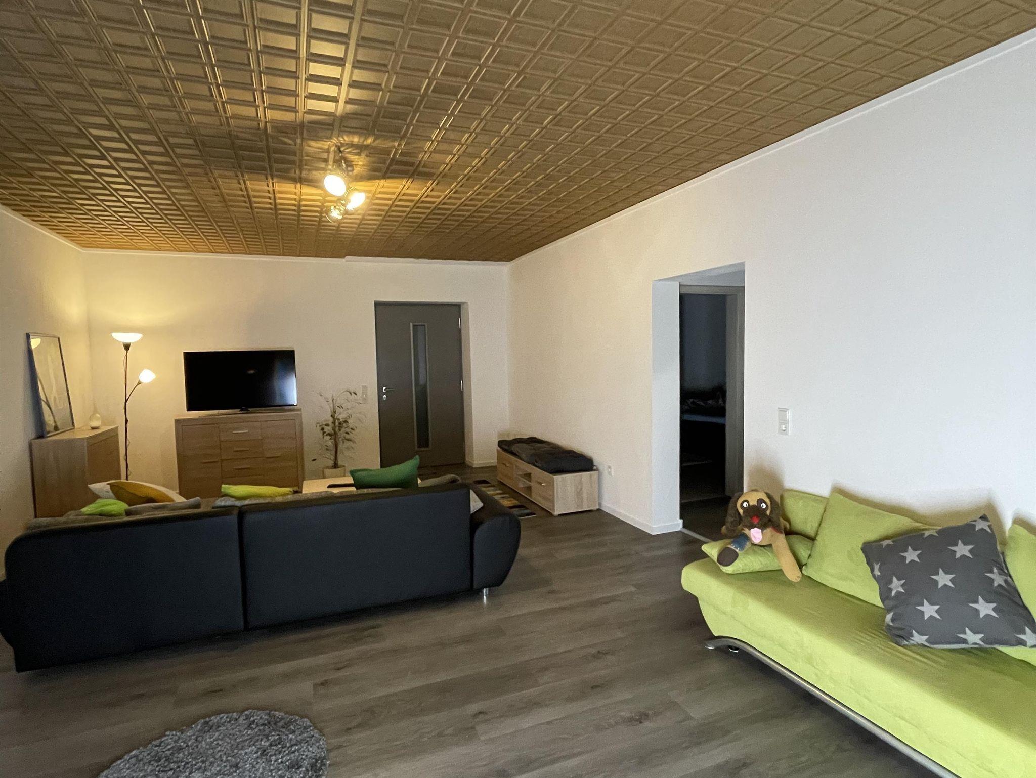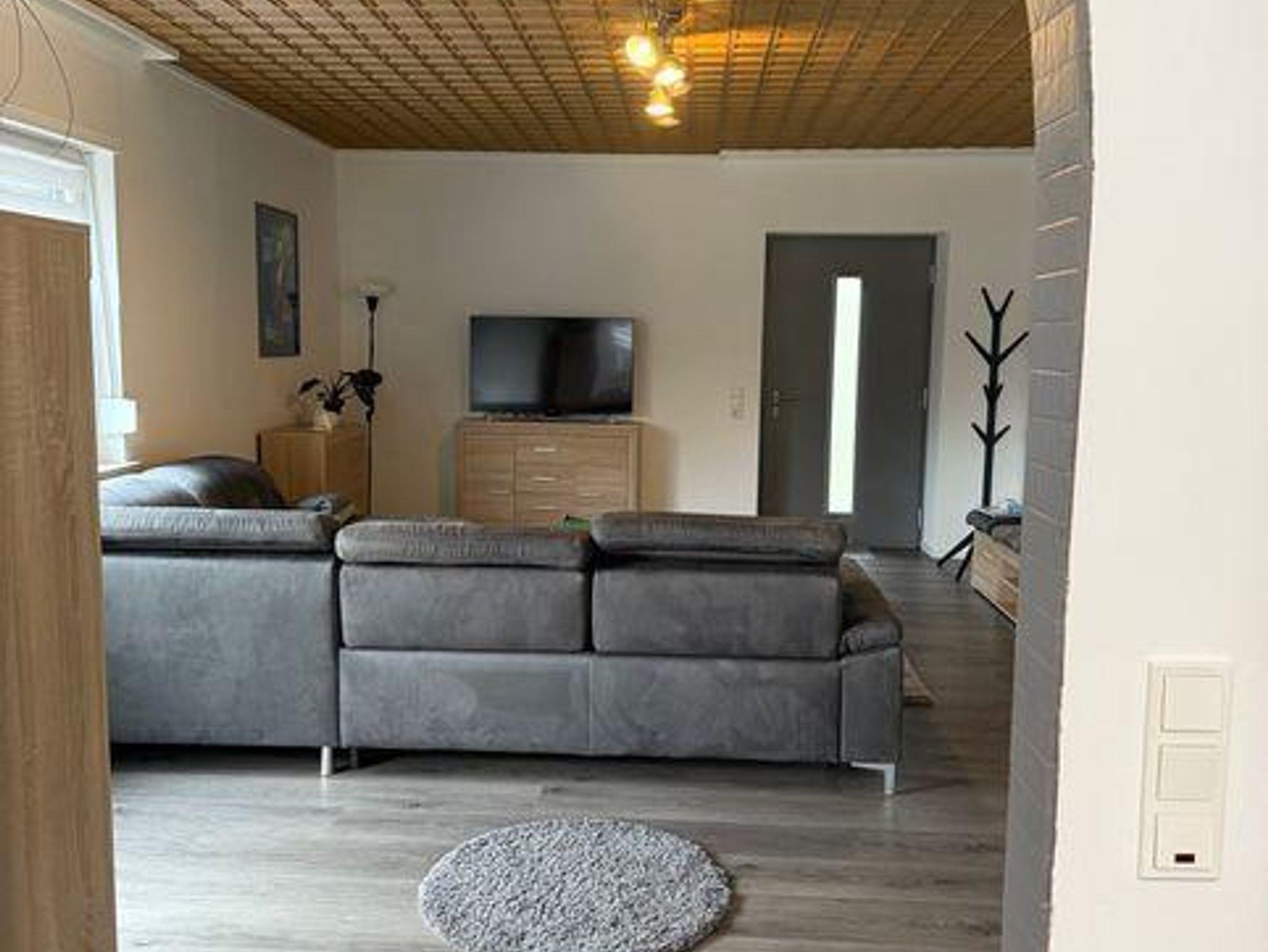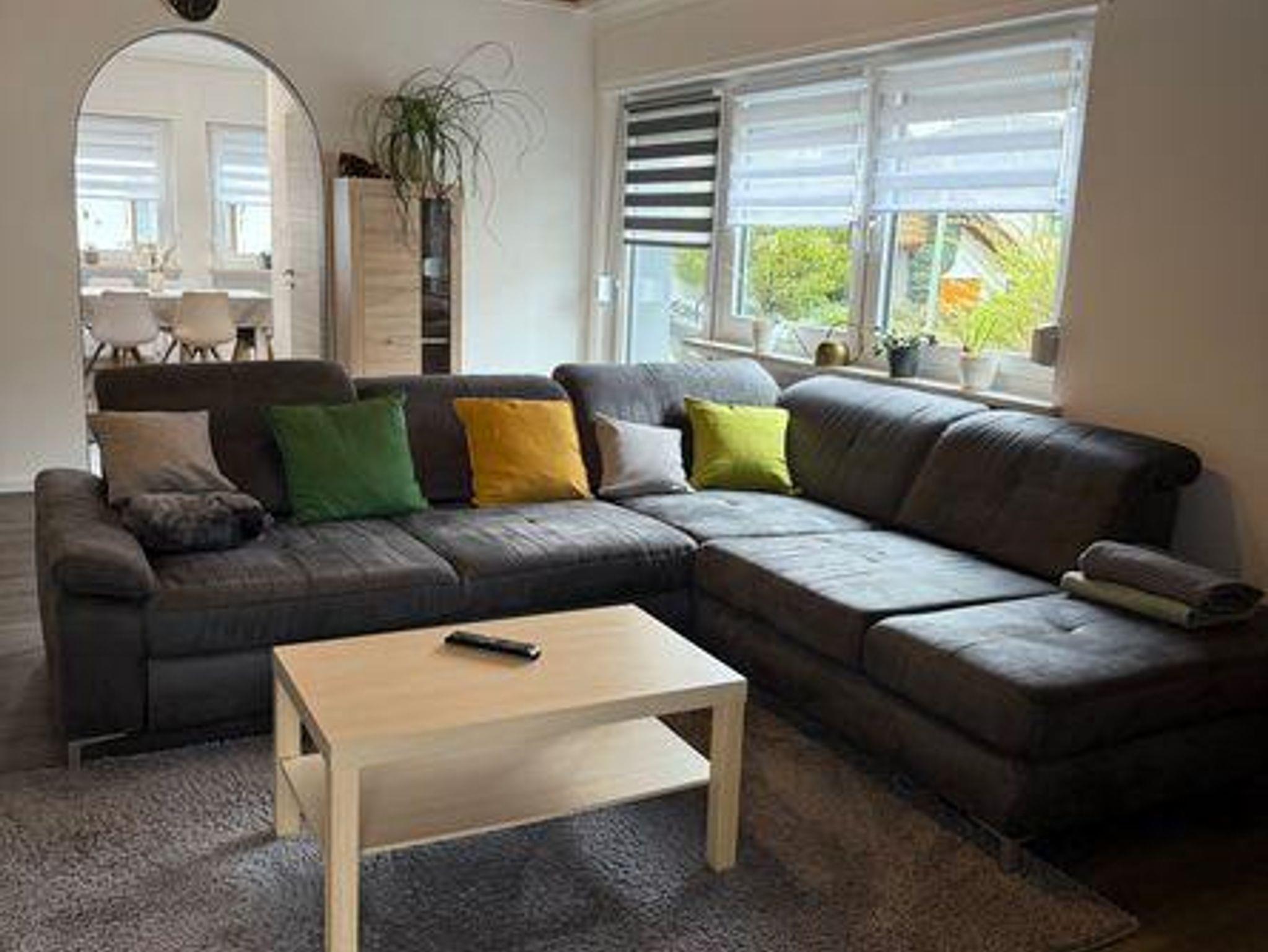 Das große, modern und gemütlich eingerichtete Wohnzimmer mit ausziehbarer Eck-Schlafcouch und separatem Schlafsofa sowie Flachbild-TV lädt zum Verweilen und Chillen ein. Von hier aus ist der direkte Zugang zu Terrasse und Garten möglich.