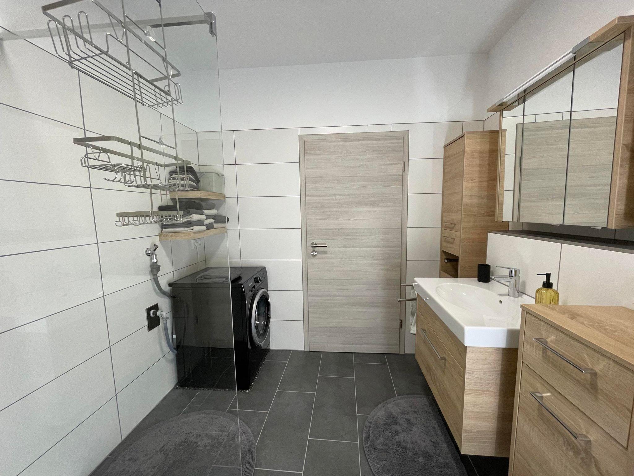 Das neue Bad mit großer Dusche ist ausgestattet mit WC, gr. Waschbecken, Spiegelschrank, Hängeschränken, Haarföhn u. neuer Waschmaschine. Dusch- und Handtücher sowie Waschlappen sind vorhanden und im Preis inbegriffen. Ebenso Waschmittel falls Sie Ihre Wäsche vor Ort waschen möchten. Es gibt auch Hygieneartikel wie Toilettenpapier, Duschcreme, Shampoo, Zahnbürsten, Zahnpasta, Wattestäbchen, … Man kennt das ja, wie es einem ergeht, wenn man was zuhause hat liegenlassen, was eigentlich mit auf Reise sollte