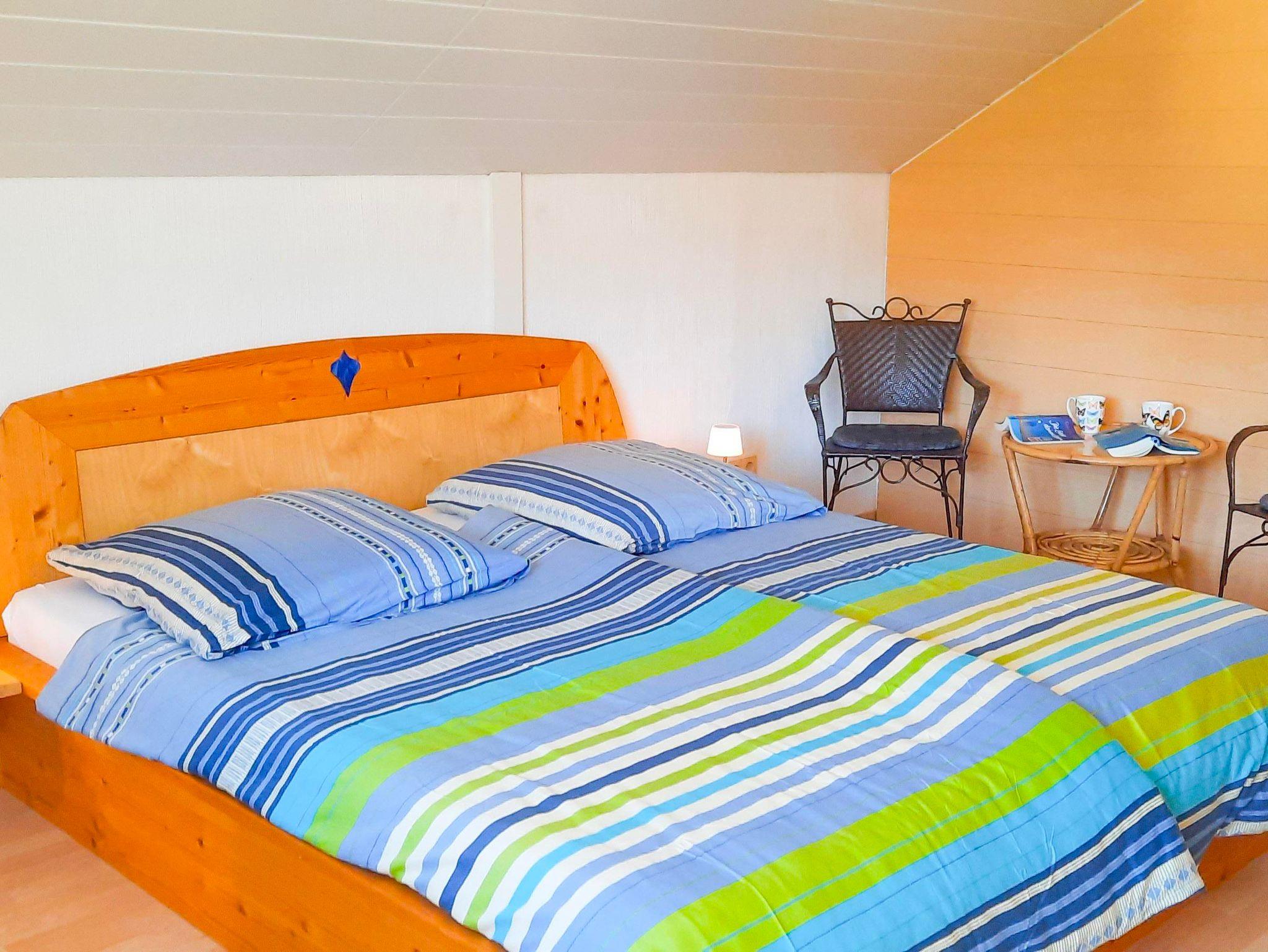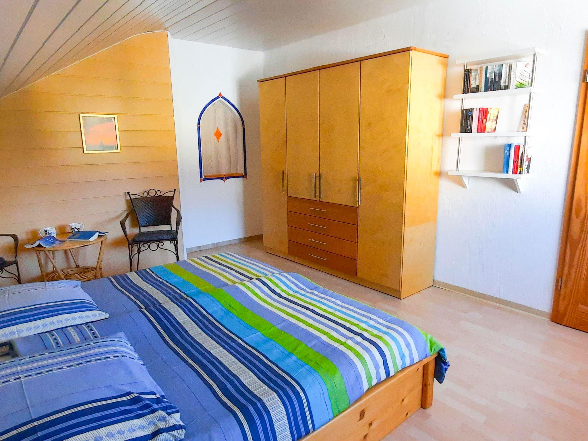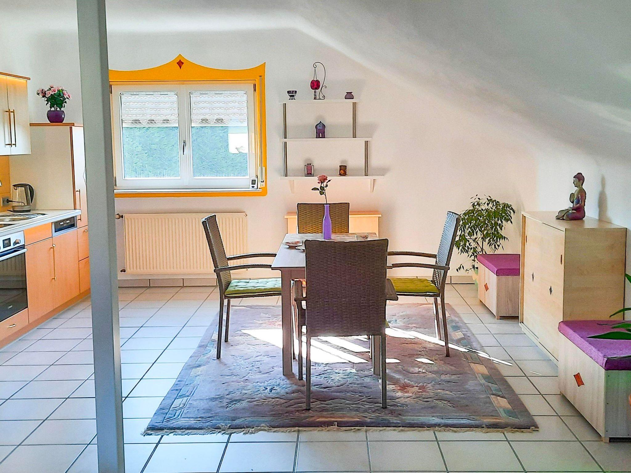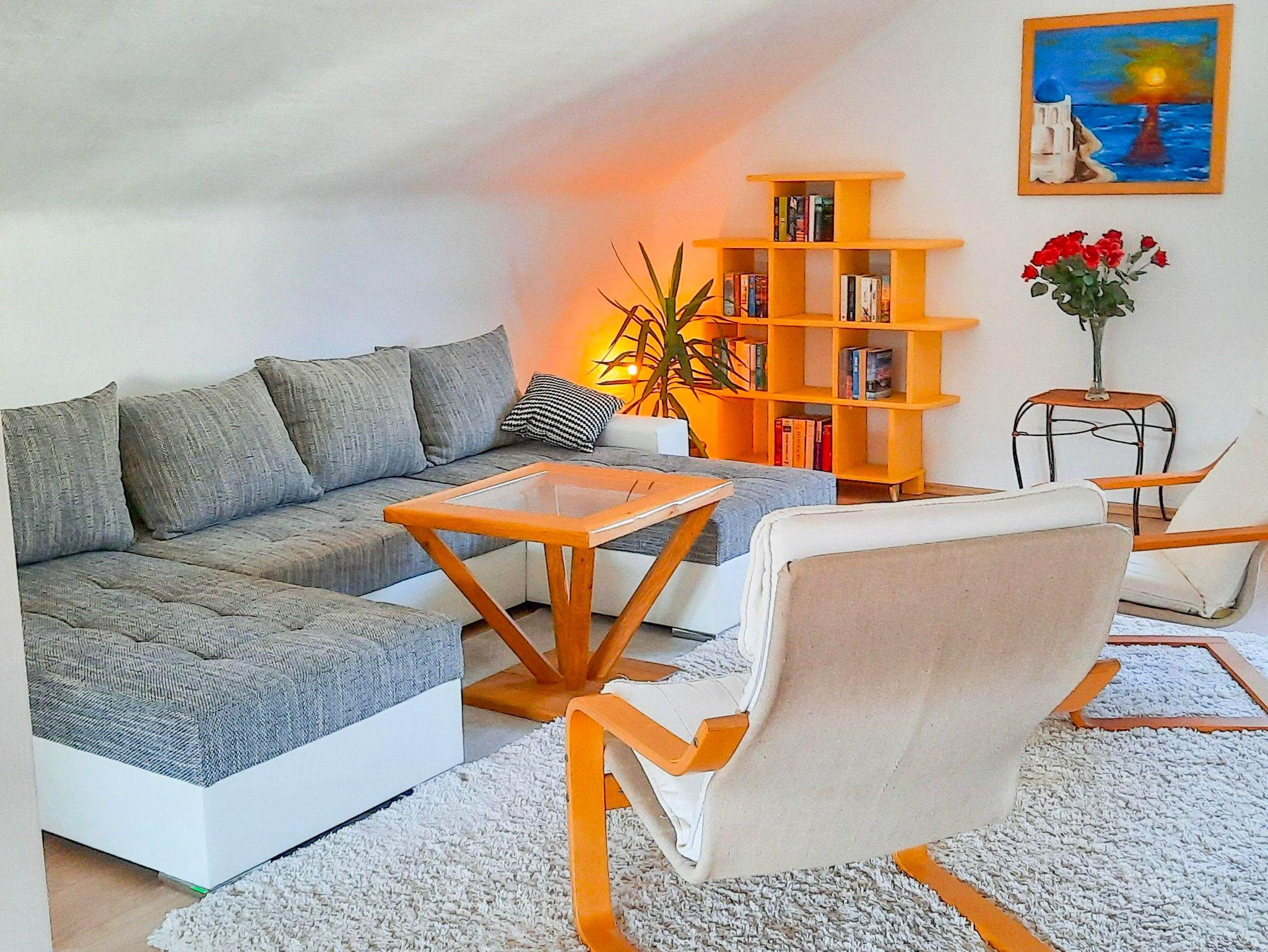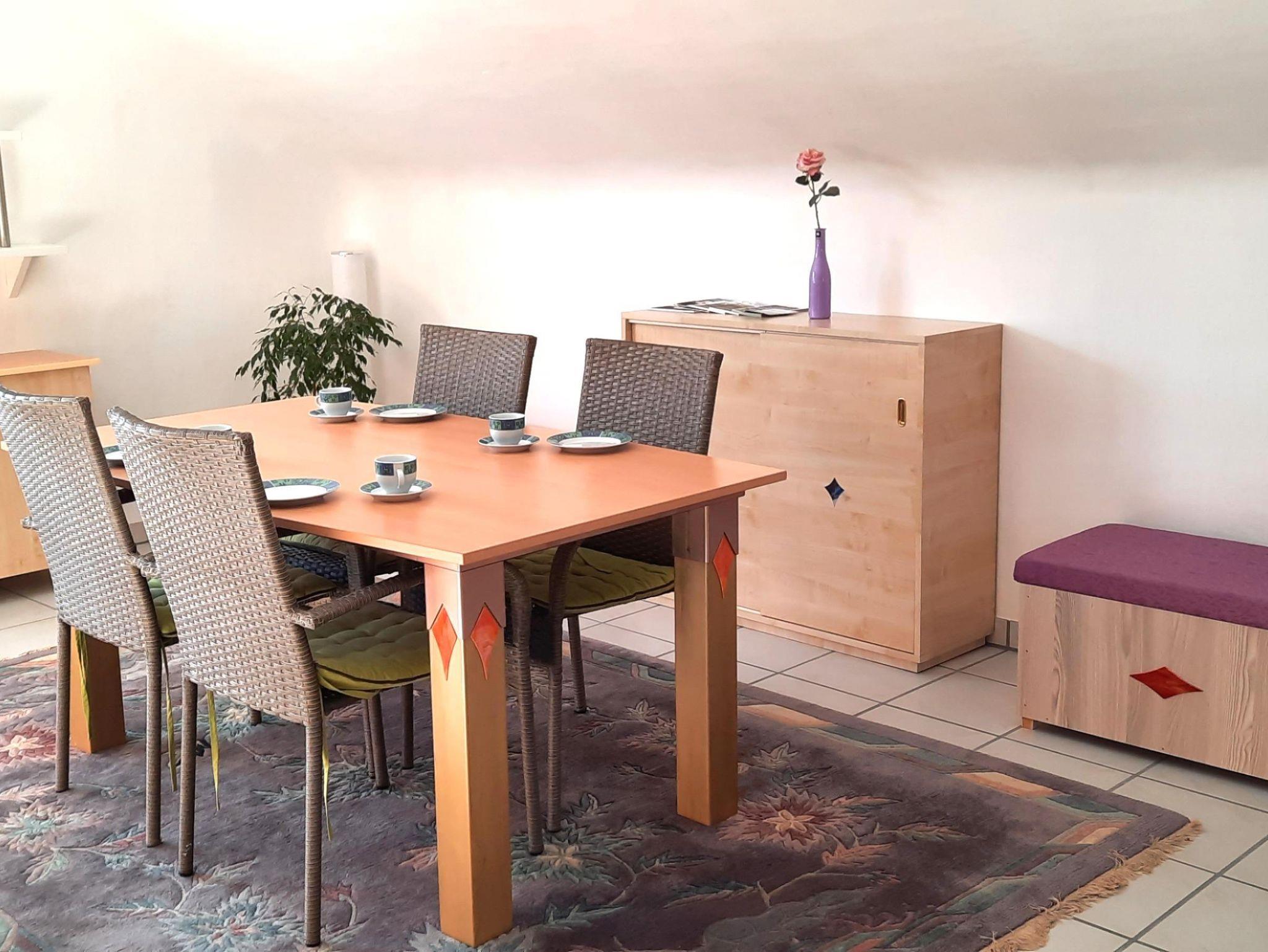 Kommen Sie zur Ruhe in unserer neuen und gemütlichen Wohnung mit Dachschrägung und Klimaanlage. Im Wohnzimmer finden Sie eine gemütliche Sitzecke sowie einen Beamer für entspannte Stunden. Die komplett ausgestattete Küche verfügt über einen Backofen, Elektroherd, Kühlschrank, Geschirrspülmaschine, eine Kaffeemaschine und einen Wasserkocher. Das Schlafzimmer ist mit Bio-Massivholzmöbeln und einem komfortablen Doppelbett ausgestattet. Das Bad bietet eine Dusche und ein WC. Auf Anfrage kann auch unser Billardtisch genutzt werden.