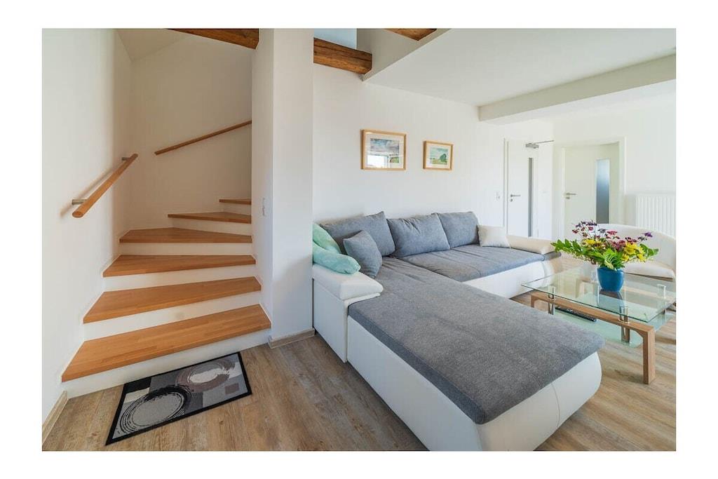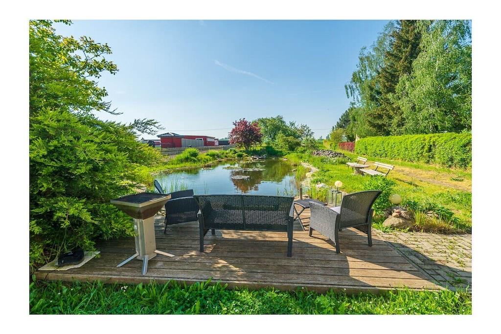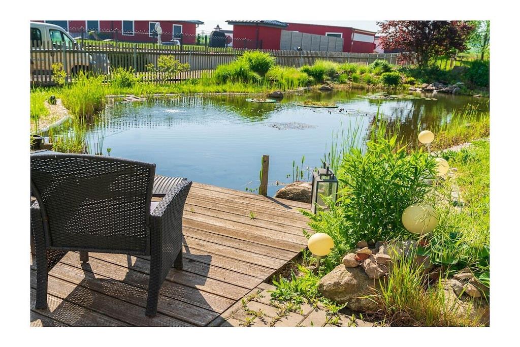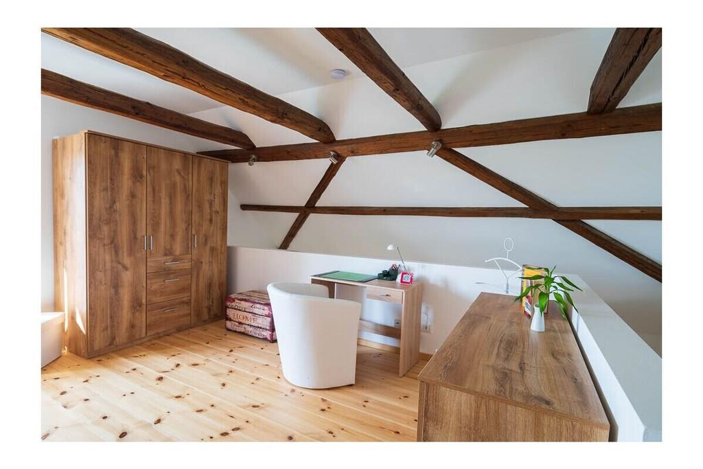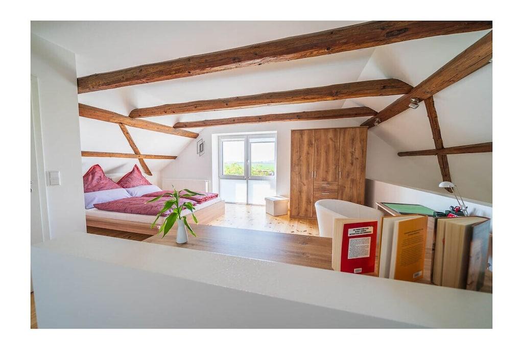 High-quality furnished 65-square-meter holiday home over three floors. With an open gallery level over two floors, with balcony, in the middle of green gardens, with recreational rooms. View of the garden with a large fish pond and the fields and mountains of the Leipzig lowland bay. The holiday home, which was only completed in 2022, was created from the former agricultural commercial rooms of the building built in 1881. The former three-sided farm in the historic center of a Saxon municipality Lossatal with 3,500 years of history combines rural gentle tourism with local culture as a socio-cultural center. This means that all families interested in multi-day relaxation stays feel at home here.