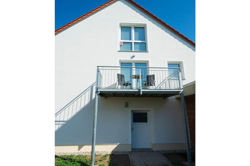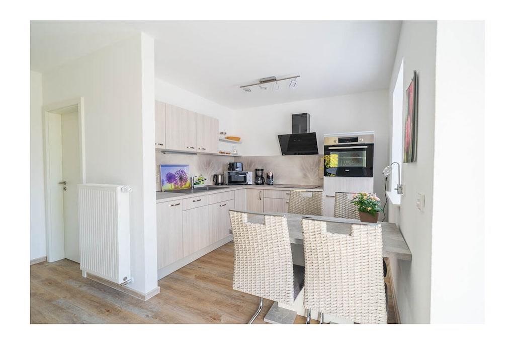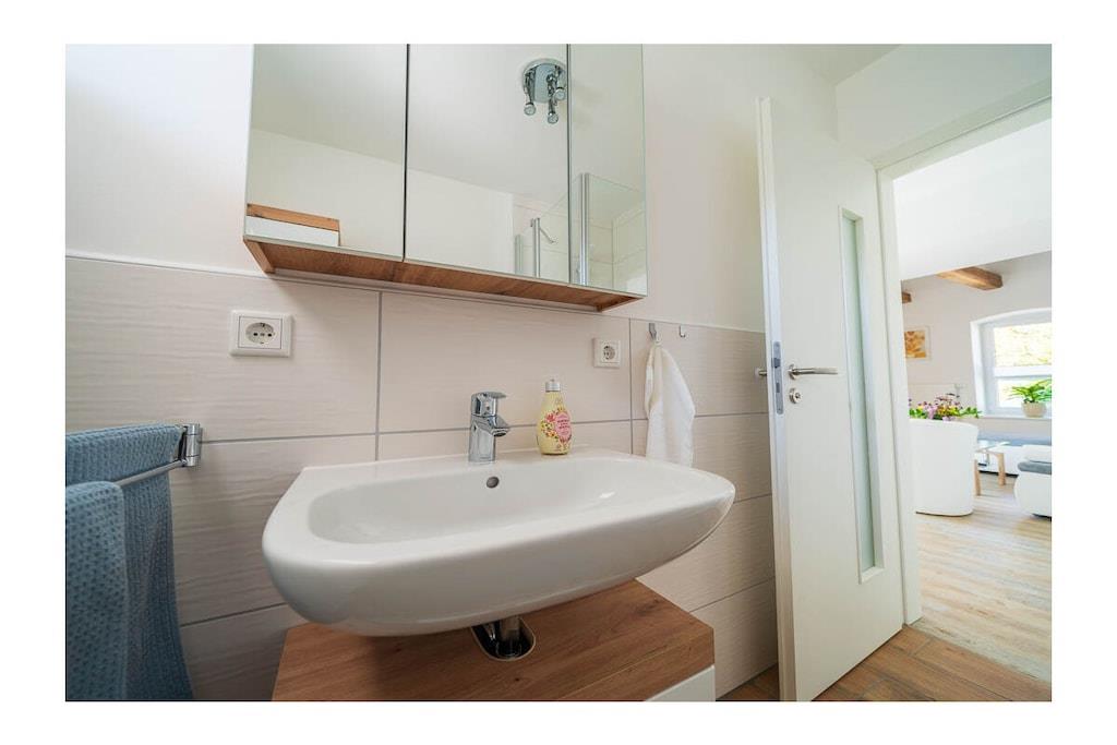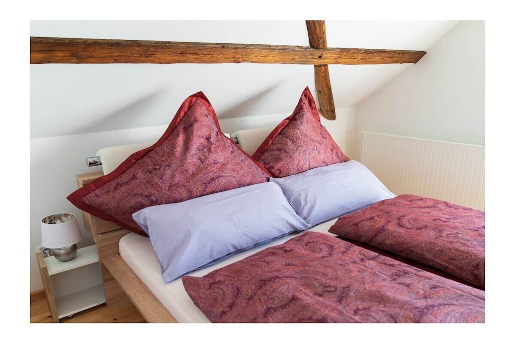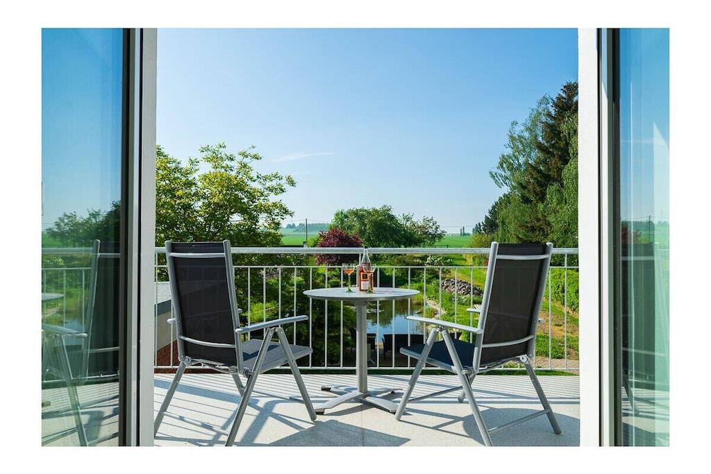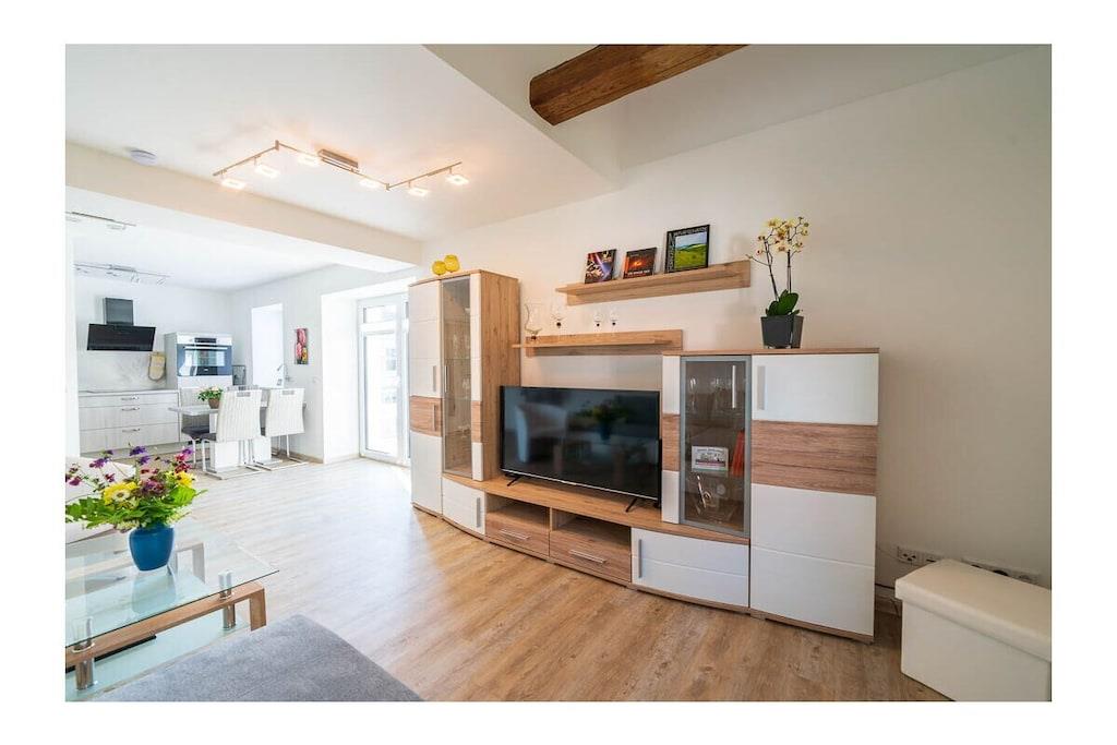 High-quality furnished 65-square-meter holiday home over three floors. With an open gallery level over two floors, with balcony, in the middle of green gardens, with recreational rooms. View of the garden with a large fish pond and the fields and mountains of the Leipzig lowland bay. The holiday home, which was only completed in 2022, was created from the former agricultural commercial rooms of the building built in 1881. The former three-sided farm in the historic center of a Saxon municipality Lossatal with 3,500 years of history combines rural gentle tourism with local culture as a socio-cultural center. This means that all families interested in multi-day relaxation stays feel at home here.