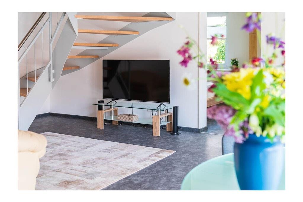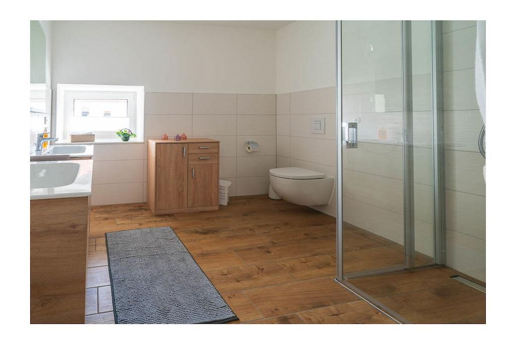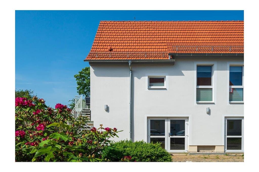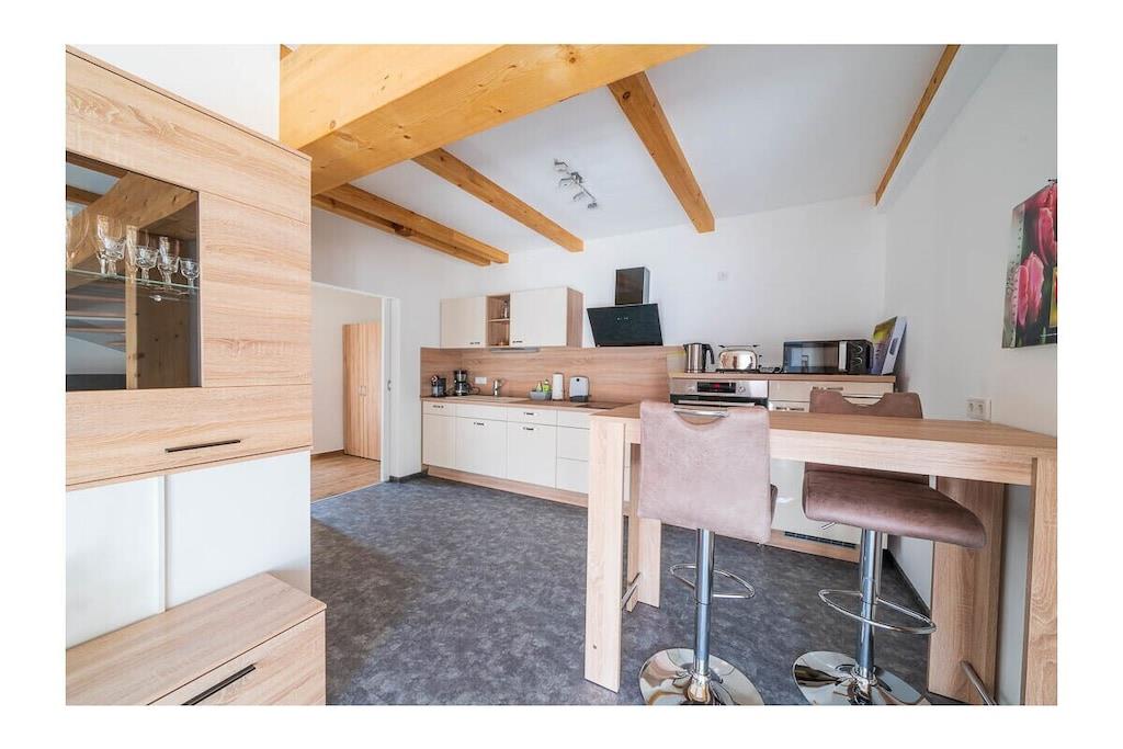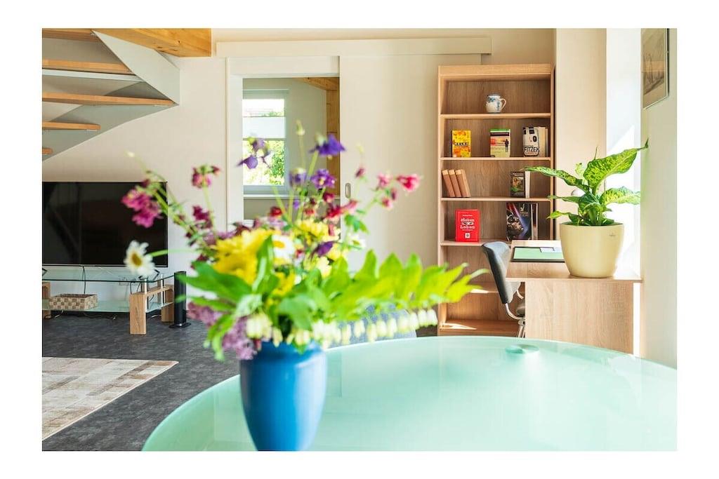Lovingly furnished 100-square-meter holiday home with an open gallery level over two floors, with a balcony-like outdoor platform, surrounded by green gardens, with recreational rooms, garden, 100-cubic-meter fish pond in the garden, view of the church tower, church garden, park and the fields and mountains of the Leipzig lowland bay. The holiday home was created from the former agricultural commercial rooms of the building built in 1840 and will not be completed until 2022. The former three-sided farm in the historic center of a Saxon community with 3,500 years of history is a socio-cultural center that combines rural gentle tourism with local culture. This means that all families interested in multi-day relaxation stays feel at home here.