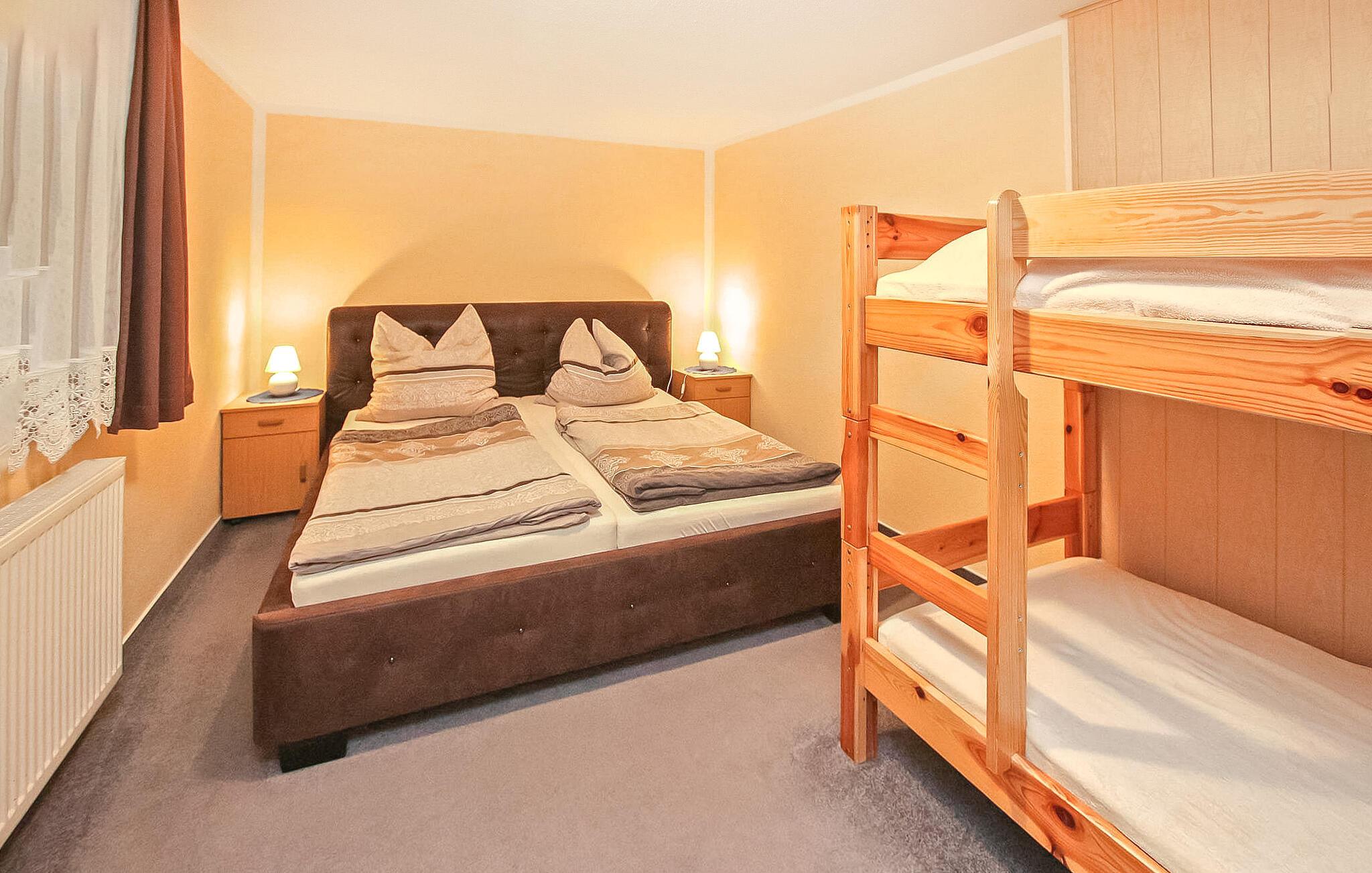 Das ca. 40 qm große, zentral beheizte und mit Insektenschutz ausgestattete Nichtraucher-Ferienhaus für bis zu 4 Personen verfügt über einen Wohnraum (Polstermöbel, Flachbild-TV, Durchgang zum Schlafraum), ein Schlafzimmer (ein Doppelbett, ein Etagenbett), eine separate Küche (Esstisch, E-Herd mit Backofen, Kühlschrank, Mikrowelle, div. Küchenkleingeräte), ein Bad (Dusche, WC) und einen kleinen Flur. Zusätzlich stehen eine Parkfläche, eine Sitzecke vor dem Haus, Grill, kostenloses W-LAN und 2 Fahrräder zum Verleih zur Verfügung.