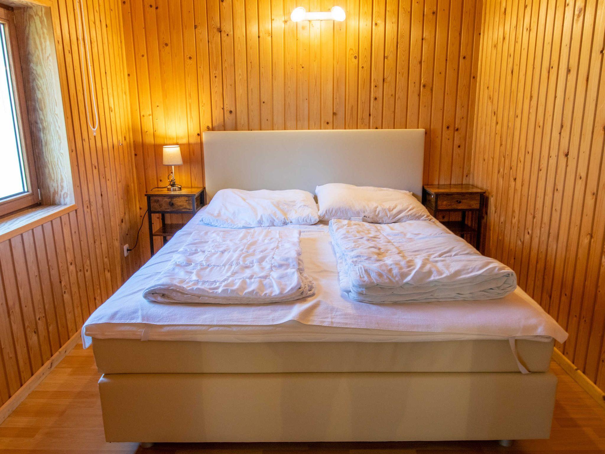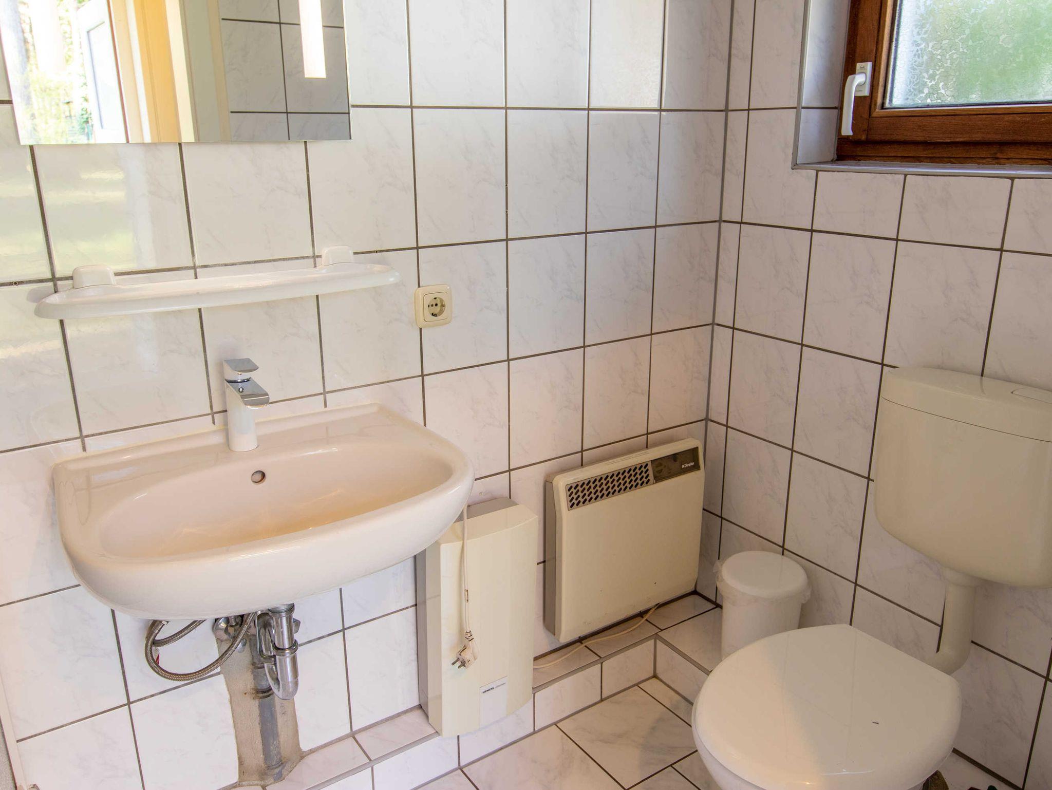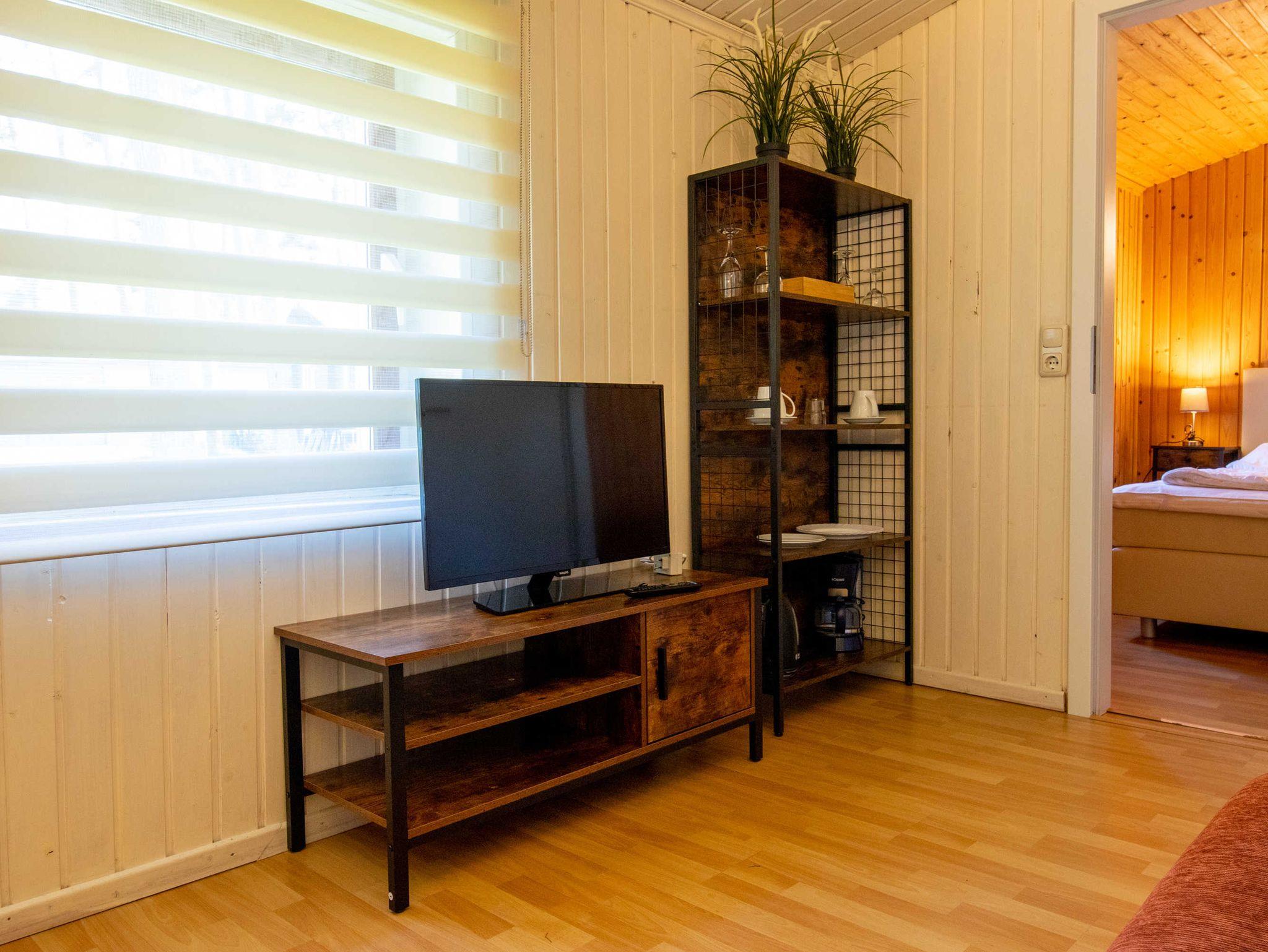 Die ca. 25 m² große Ferienwohnung befindet sich auf der Waldseite der Anlage in einem Doppelhäuschen mit Terrasse. Die Wohnung verfügt über ein Schlafzimmer mit Doppelbett, ein Wohnzimmer mit Schlafcouch, die als Aufbettung für zwei weitere Personen dienen kann, eine kleine Küchenzeile mit Kühlschrank im Eingangsbereich sowie ein Bad mit Dusche und WC. Vor dem Häuschen steht Ihnen eine möblierte Terrasse zur Verfügung. Die Ferienwohnung eignet sich für bis zu 4 Personen. Zusätzlich kann ein Kinderbett für ein Kleinkind (bis 3 Jahre) aufgestellt werden. Kinderbett, Hochstuhl, Wäschepaket sowie ein Parkplatz sind inklusive.