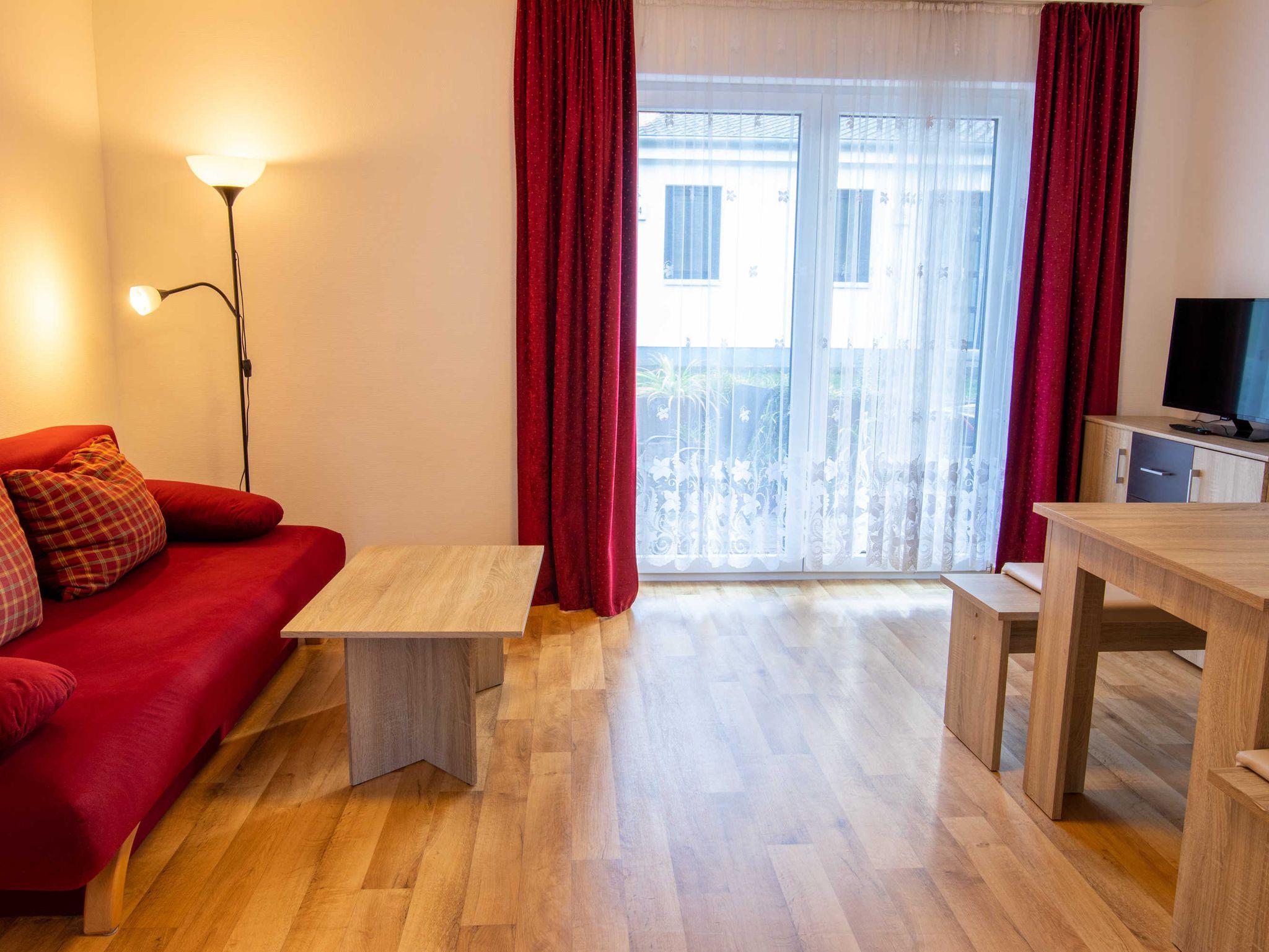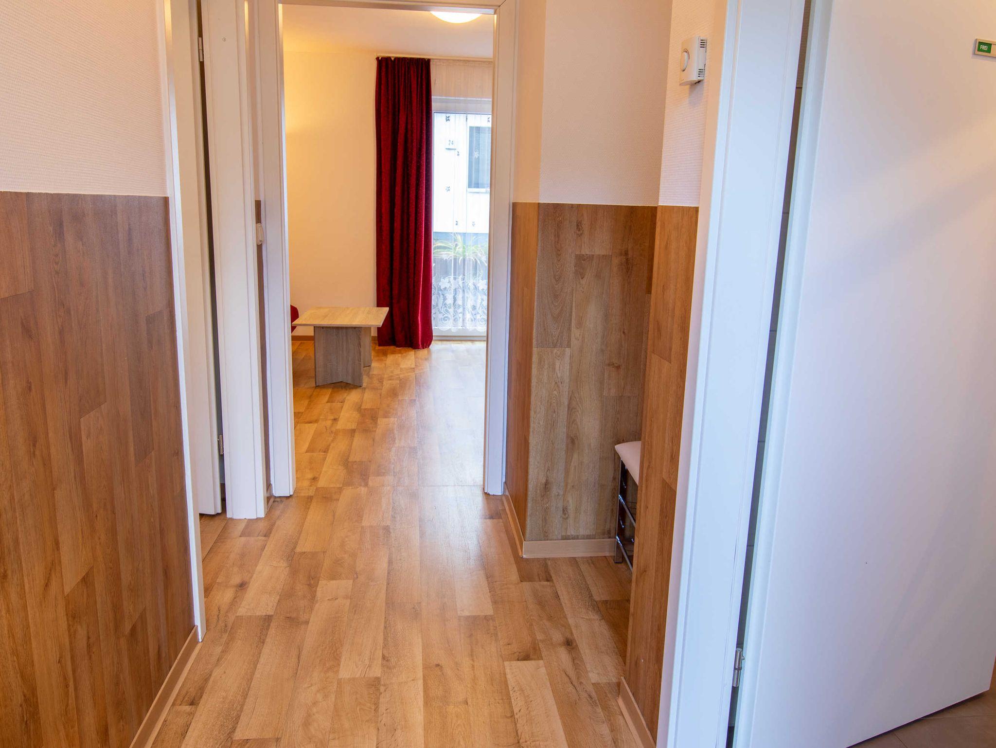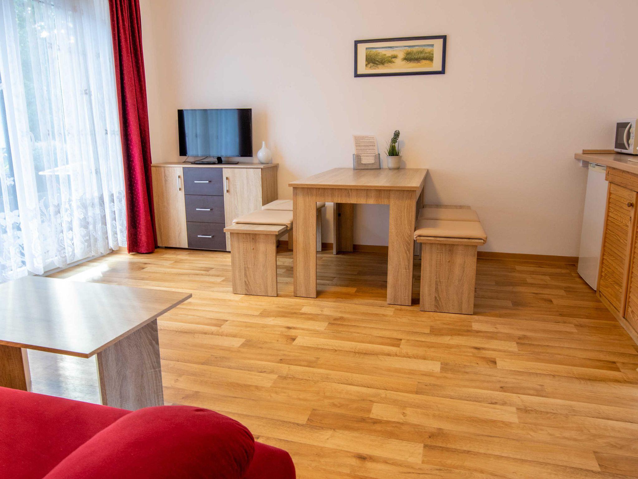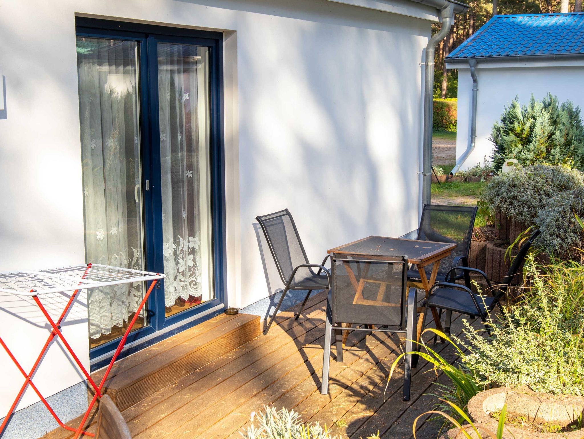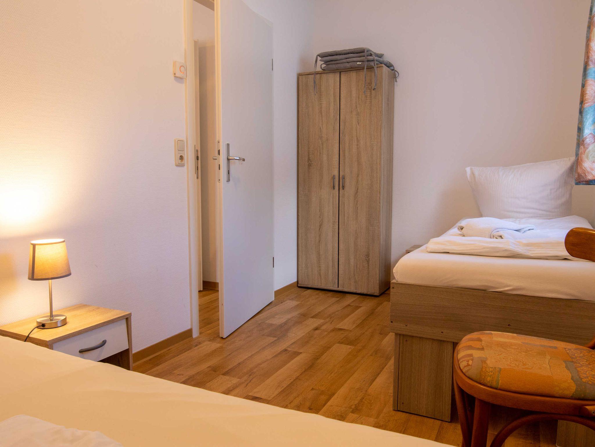 Die ca. 50 m² große Ferienwohnung befindet sich in einem einzeln stehenden Doppelhaus mit Terrasse und Blick zum Wald. Sie verfügt über ein Wohnzimmer mit Miniküche, zwei separaten Schlafzimmern, Flur und Bad.