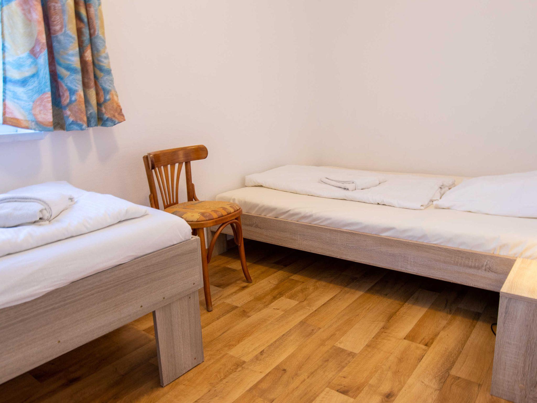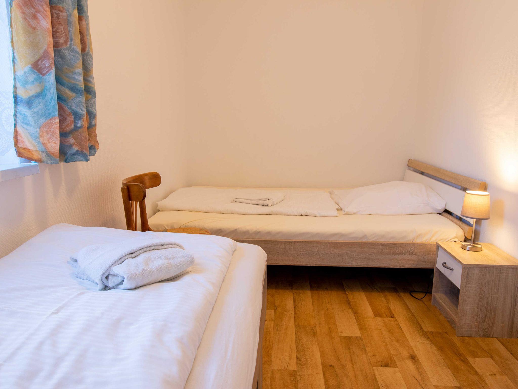 Das Wohnzimmer ist mit einer Schlafcouch (Aufbettung für 2 Personen), TV, einem Esstisch und einer Miniküche mit Kühlschrank und Mikrowelle eingerichtet. Im ersten Schlafzimmer befindet sich ein gemütliches Doppelbett mit Kleiderschrank. Das zweite Schlafzimmer beherbergt zwei Einzelbetten und einen Kleiderschrank. Das freundliche Tageslichtbad hat eine Dusche und ein WC. Zum Entspannen und Sonne tanken lädt die Terrasse ein. Sie ist vom Wohnzimmer aus begehbar.