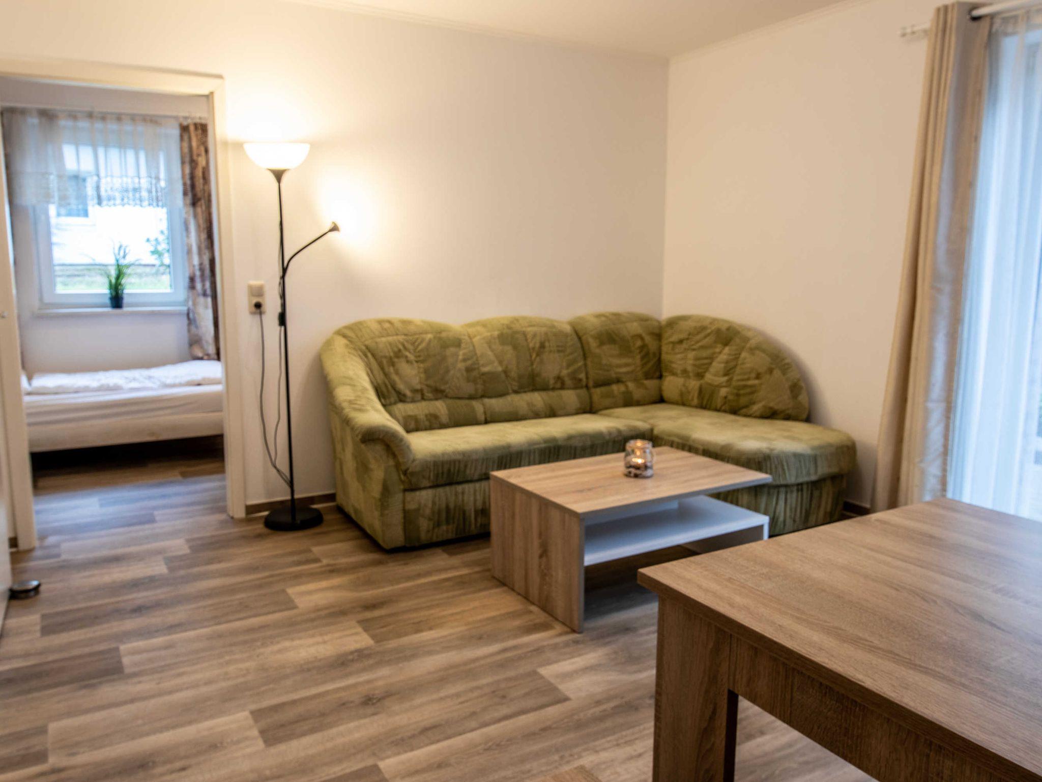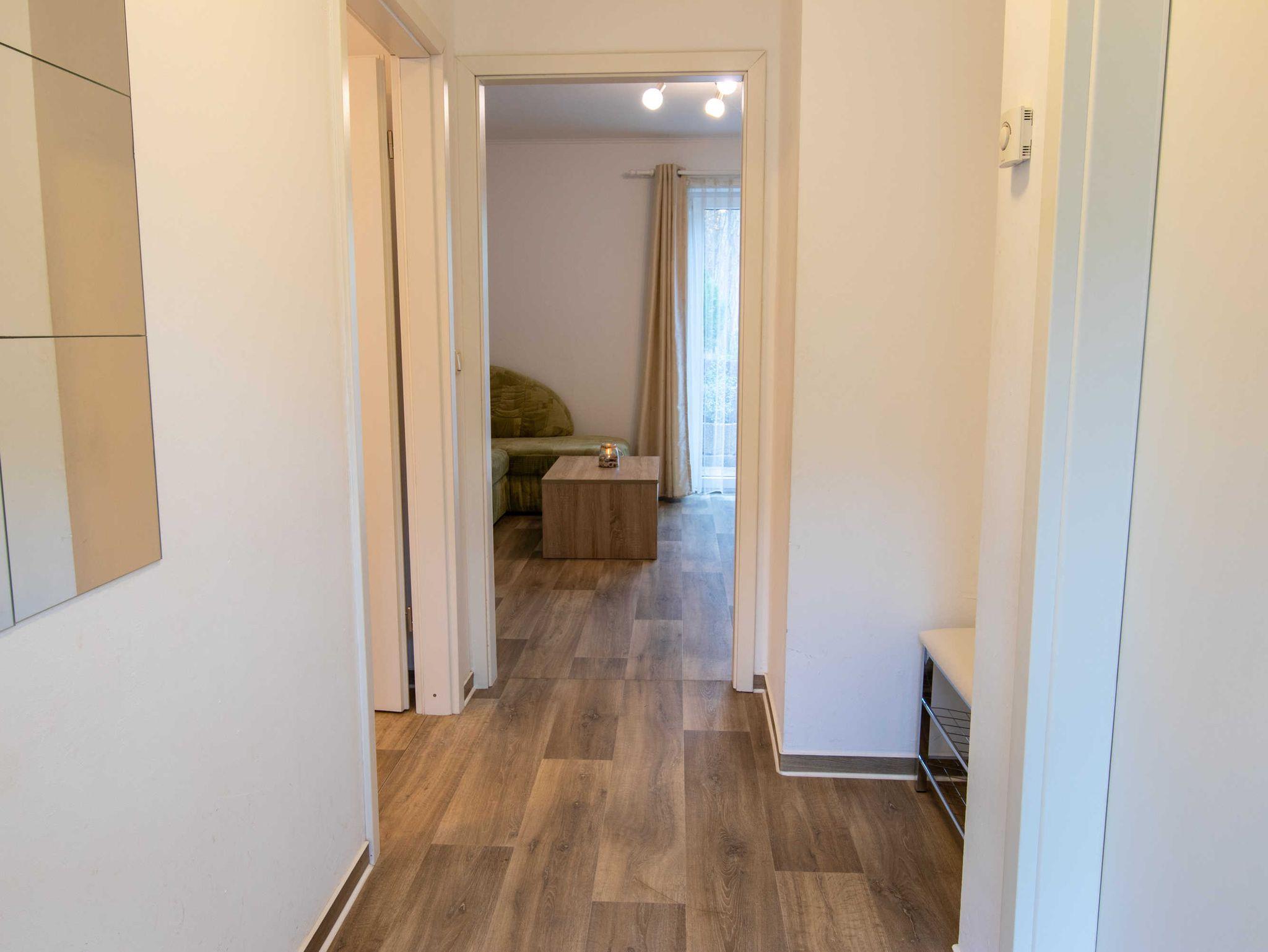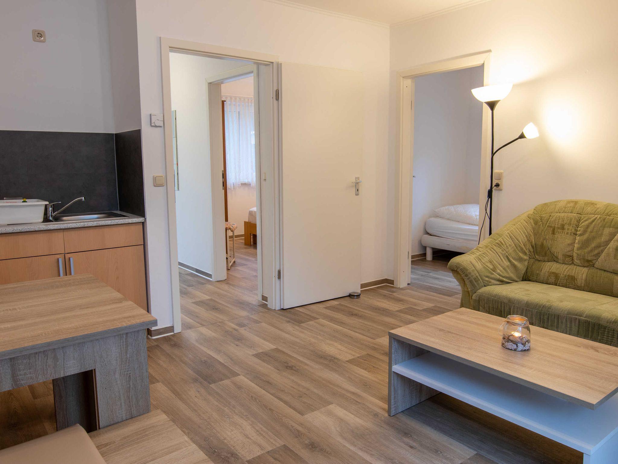 DIe ca. 50 m² große Ferienwohnung befindet sich in einem einzeln stehenden Doppelhaus mit Terrasse und Blick zum Wald. Sie verfügt über ein Wohnzimmer mit Miniküche, zwei separaten Schlafzimmern, Flur und Bad.