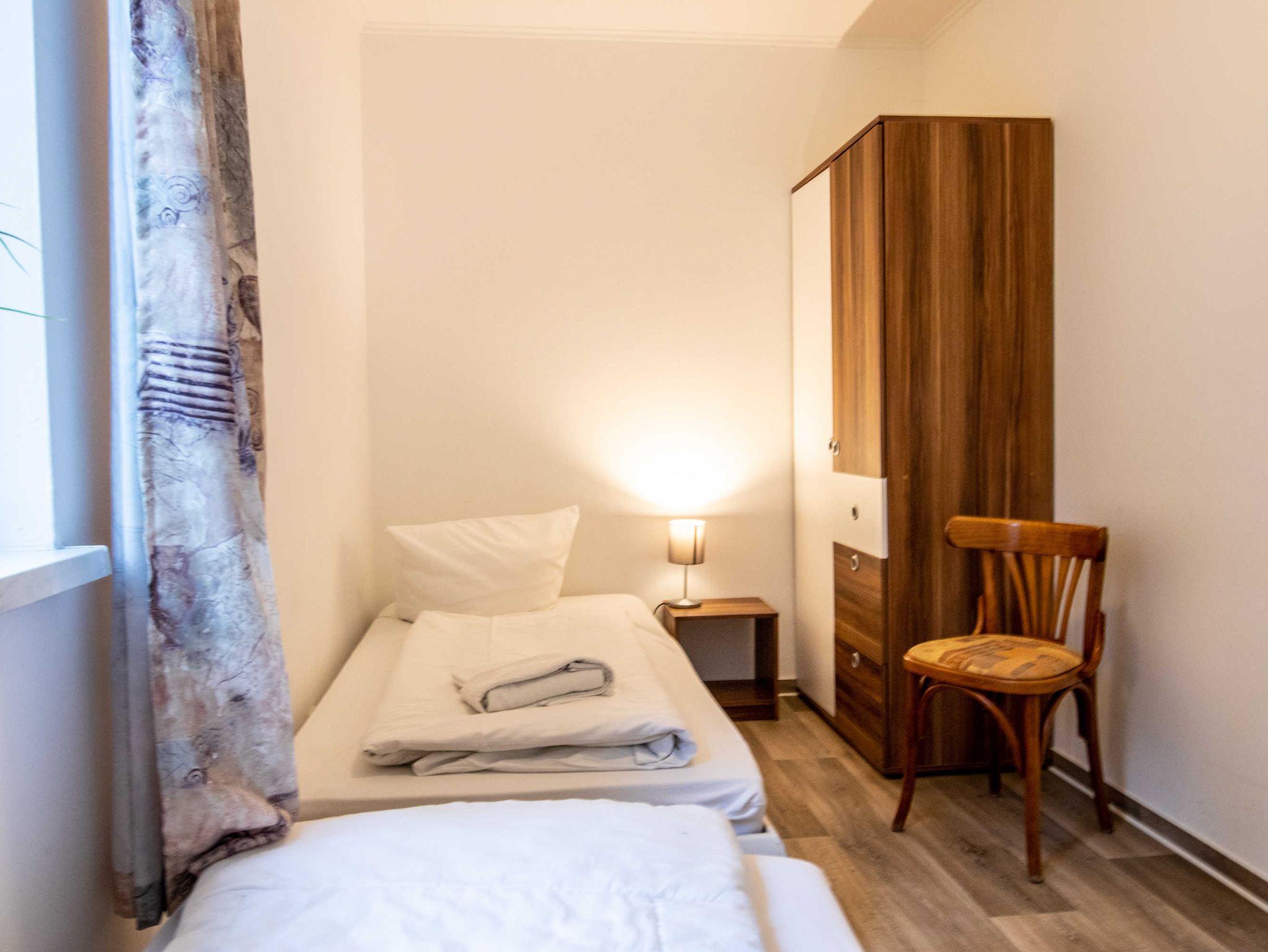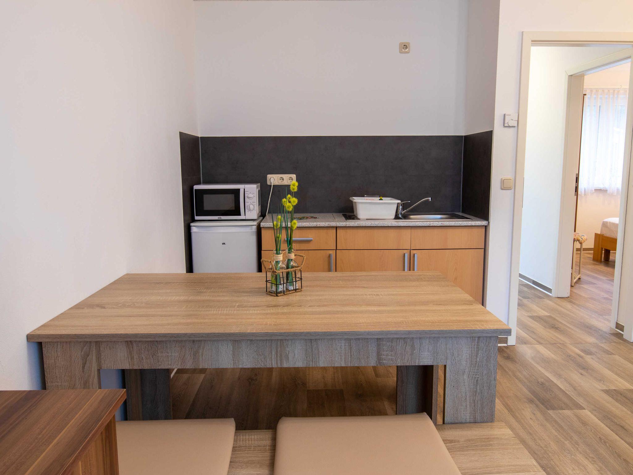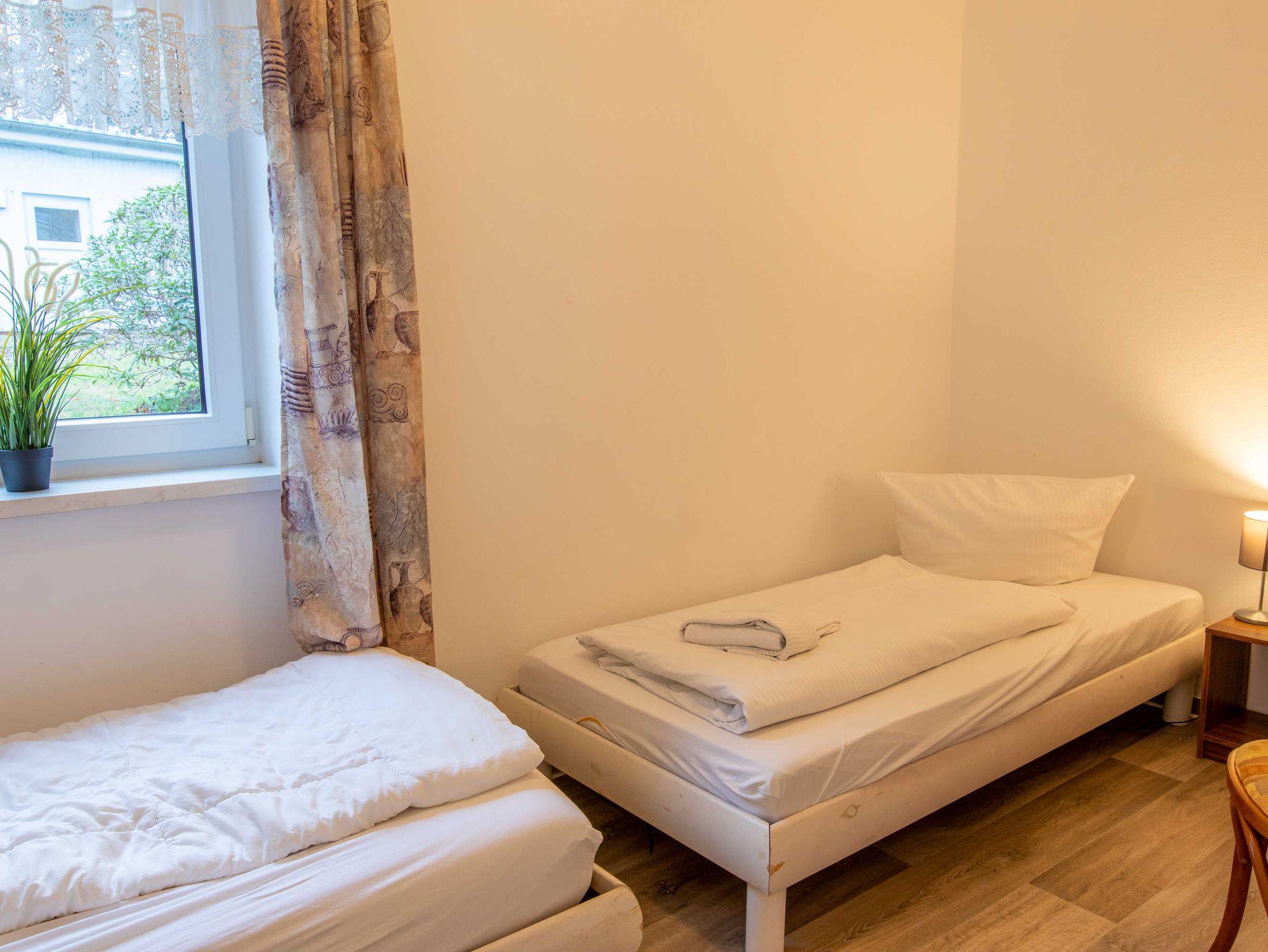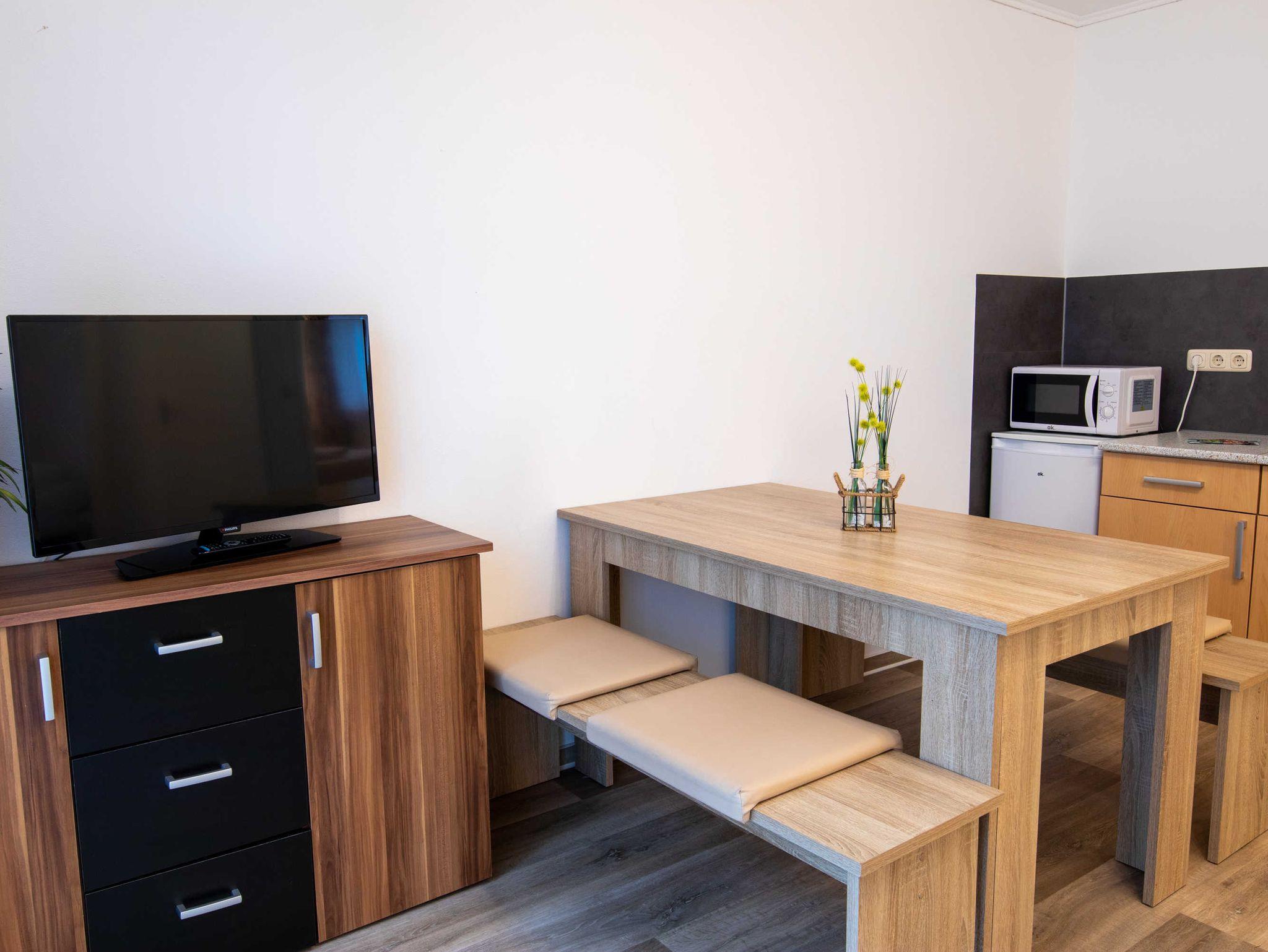 DIe ca. 50 m² große Ferienwohnung befindet sich in einem einzeln stehenden Doppelhaus mit Terrasse und Blick zum Wald. Sie verfügt über ein Wohnzimmer mit Miniküche, zwei separaten Schlafzimmern, Flur und Bad.