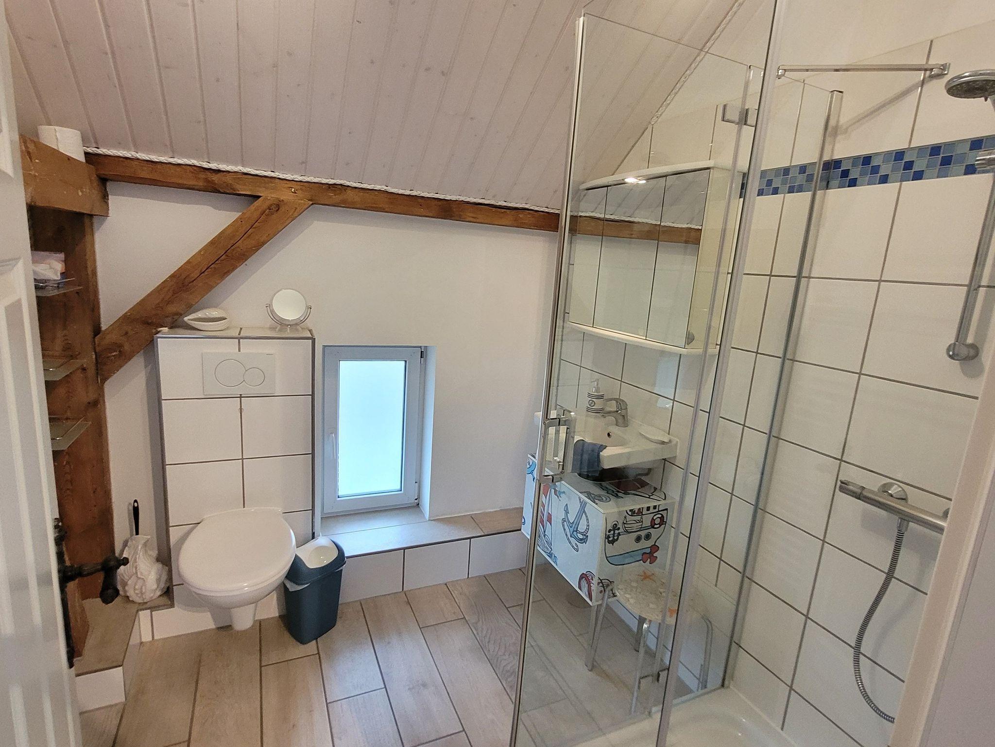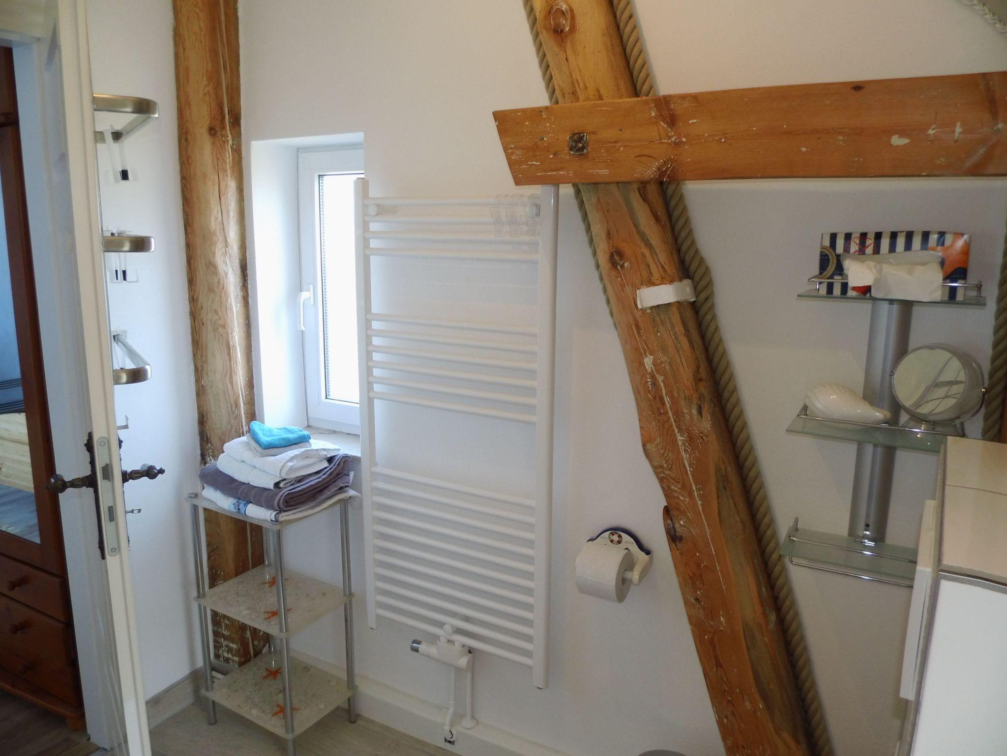 Das lichtdurchflutete Bad ist ausgestattet mit einer Duschkabine, WC, Fön, Waschtisch mit Unterschrank sowie Spiegelschrank und notwendiger Ablageflächen.