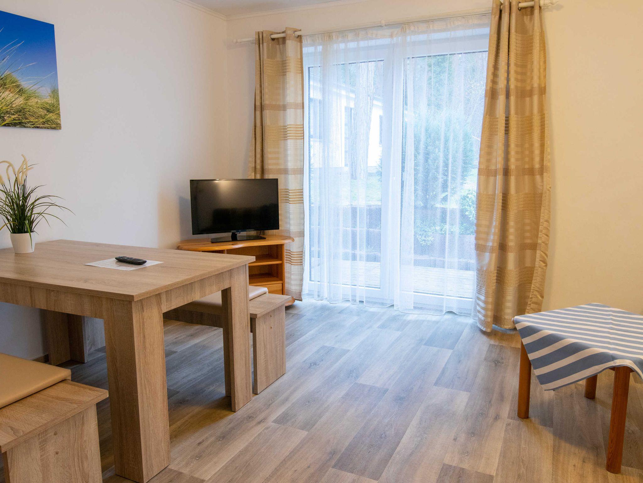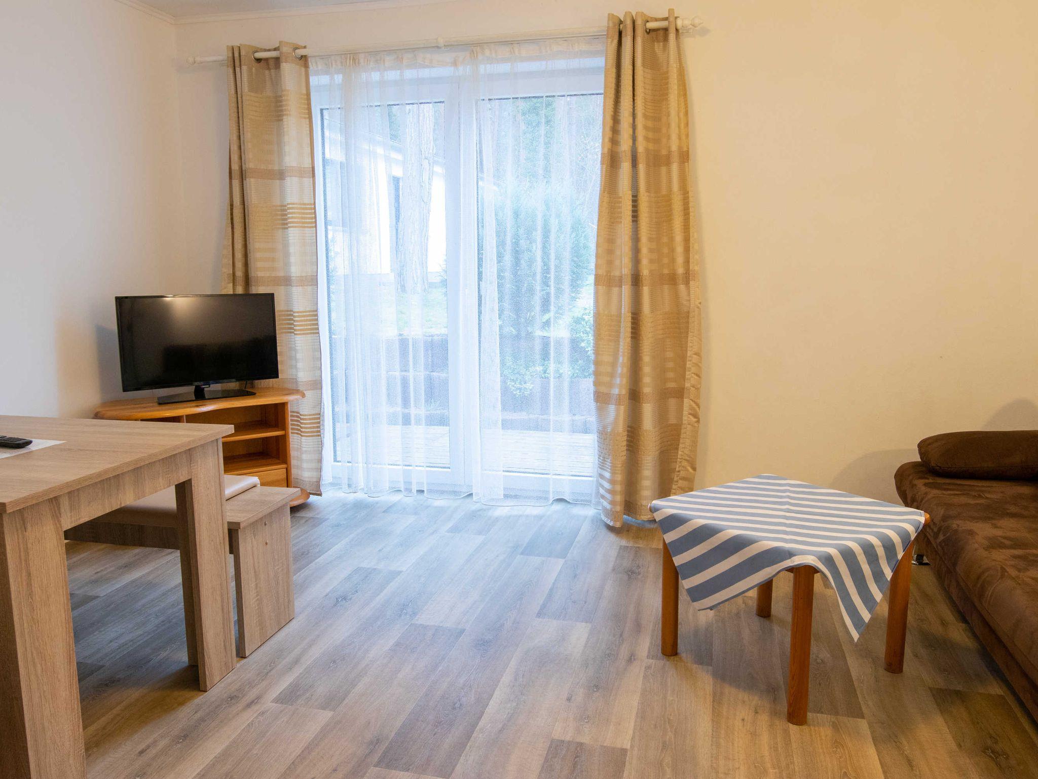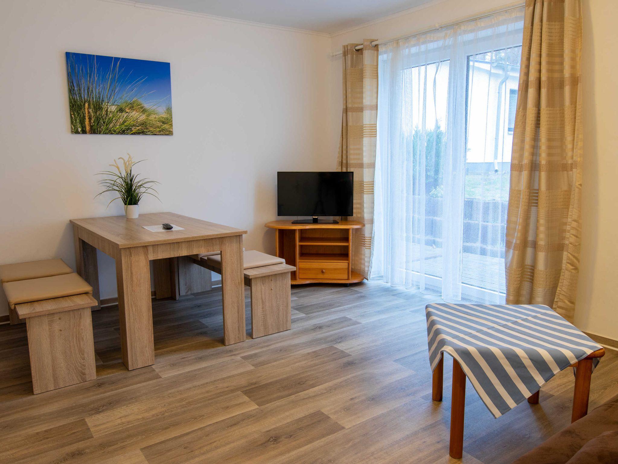 Die ca. 50 m² große Ferienwohnung befindet sich in einem einzeln stehenden Doppelhaus mit Terrasse und Blick zum Wald. Sie verfügt über ein Wohnzimmer mit Miniküche, zwei separaten Schlafzimmern, Flur und Bad.