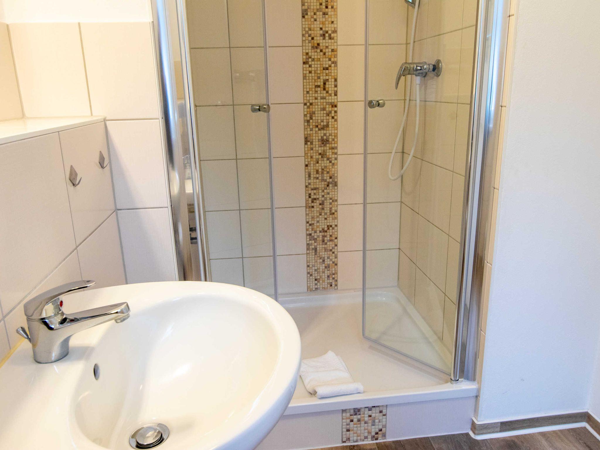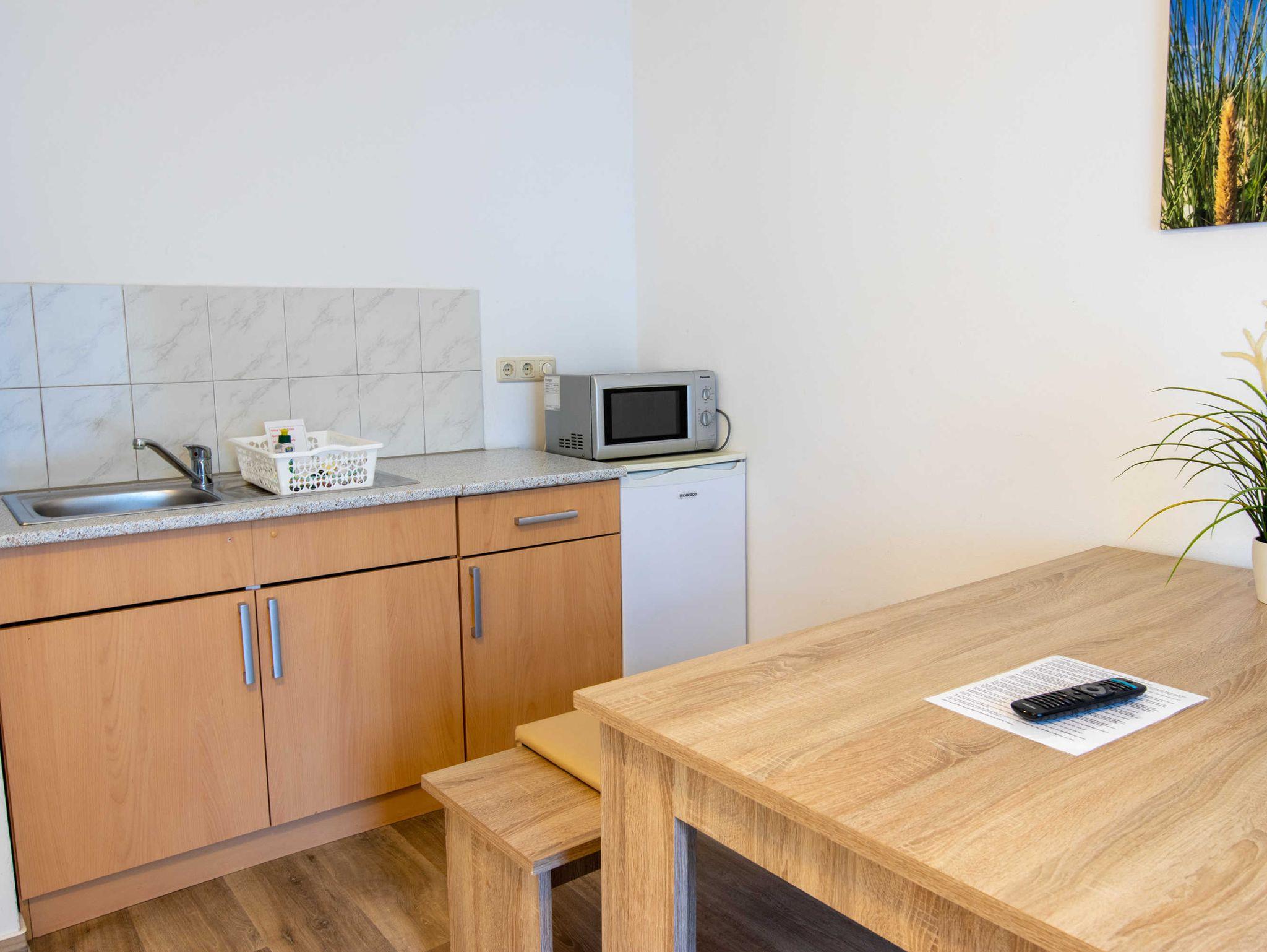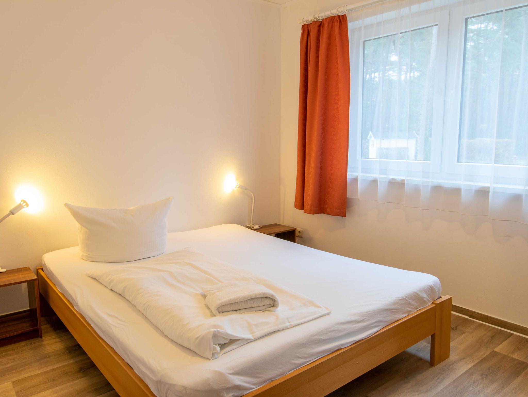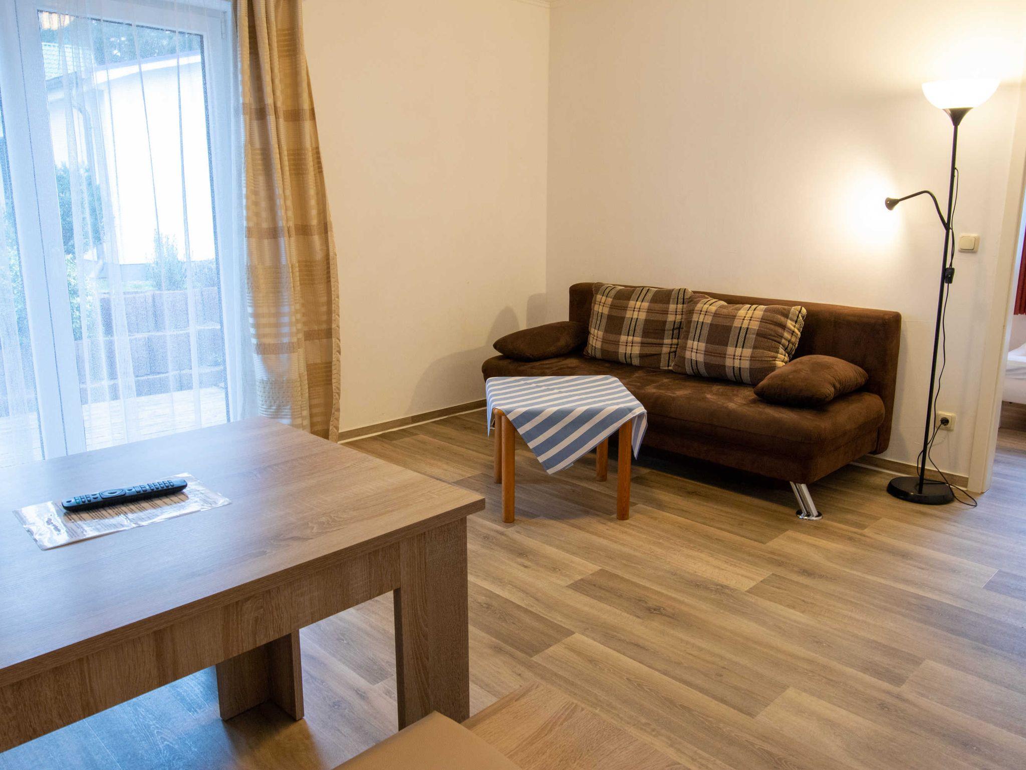 Die ca. 50 m² große Ferienwohnung befindet sich in einem einzeln stehenden Doppelhaus mit Terrasse und Blick zum Wald. Sie verfügt über ein Wohnzimmer mit Miniküche, zwei separaten Schlafzimmern, Flur und Bad.