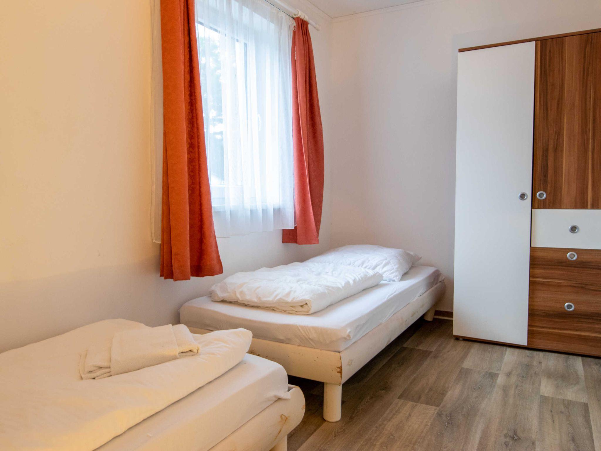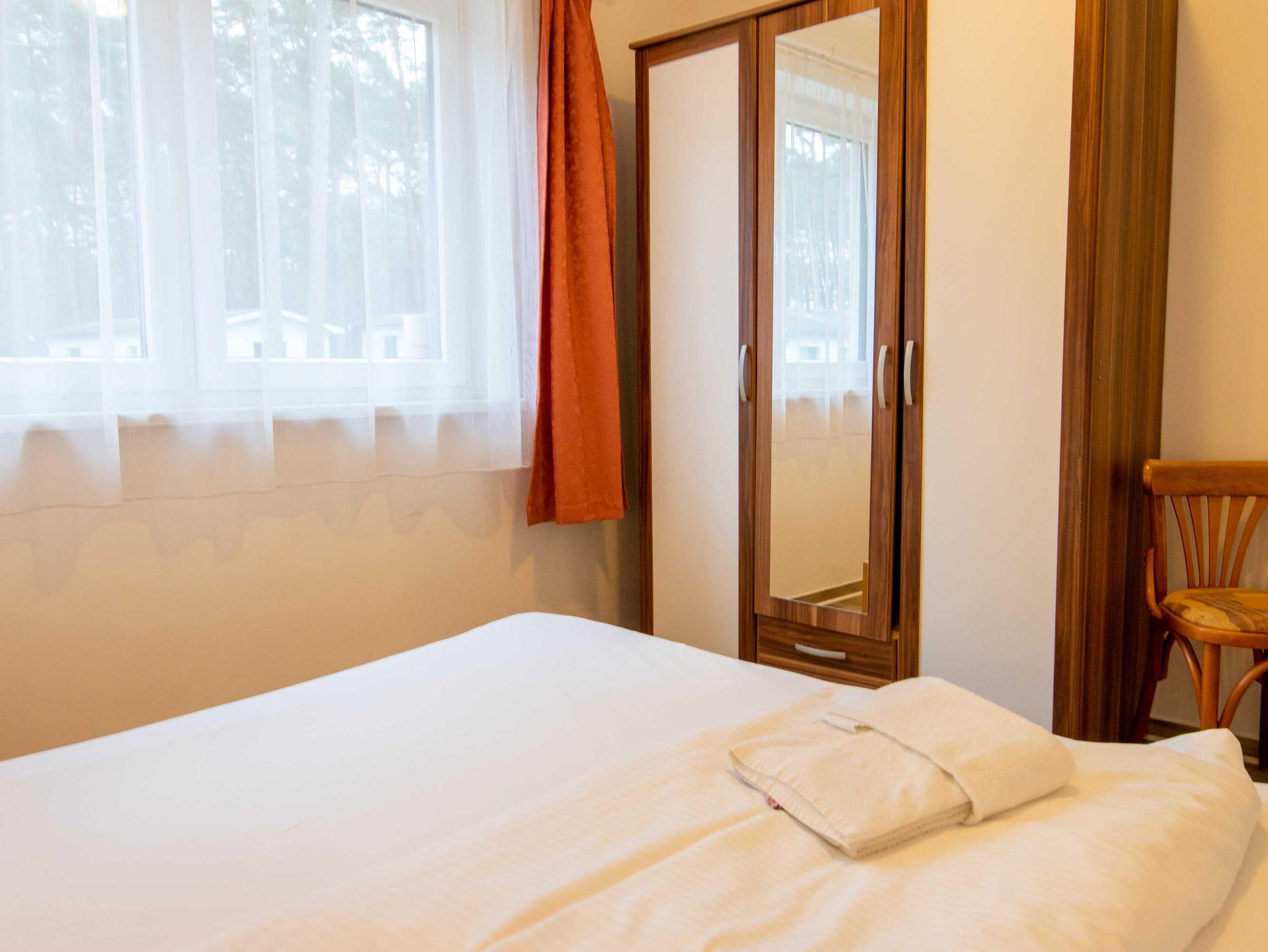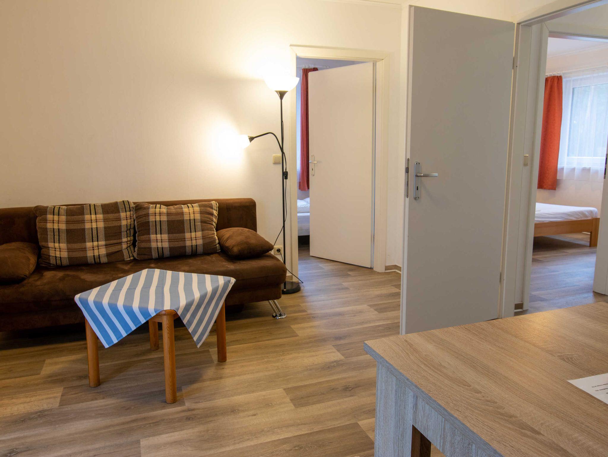 Das Wohnzimmer ist mit einer Schlafcouch (Aufbettung für 2 Personen), TV, einem Esstisch und einer Miniküche mit Kühlschrank und Mikrowelle eingerichtet. Im ersten Schlafzimmer befindet sich ein gemütliches Doppelbett mit Kleiderschrank. Das zweite Schlafzimmer beherbergt zwei Einzelbetten und einen Kleiderschrank. Das freundliche Tageslichtbad hat eine Dusche und ein WC. Zum Entspannen und Sonne tanken lädt die Terrasse ein. Sie ist vom Wohnzimmer aus begehbar.