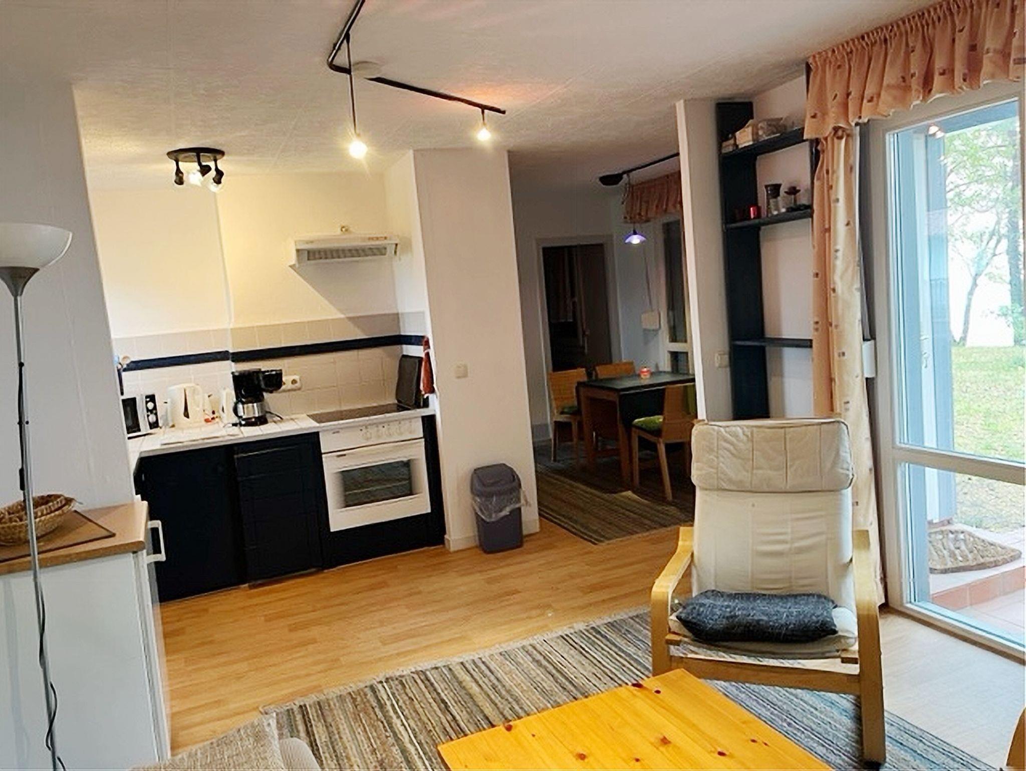 Einbauküche mit Kühlschrank/Gefrierfach, Backofen, Umlufthaube, Geschirrspüler, Kaffeemaschine, Wasserkocher, Toaster, Mikrowelle sowie Sitzecke für 4 Personen