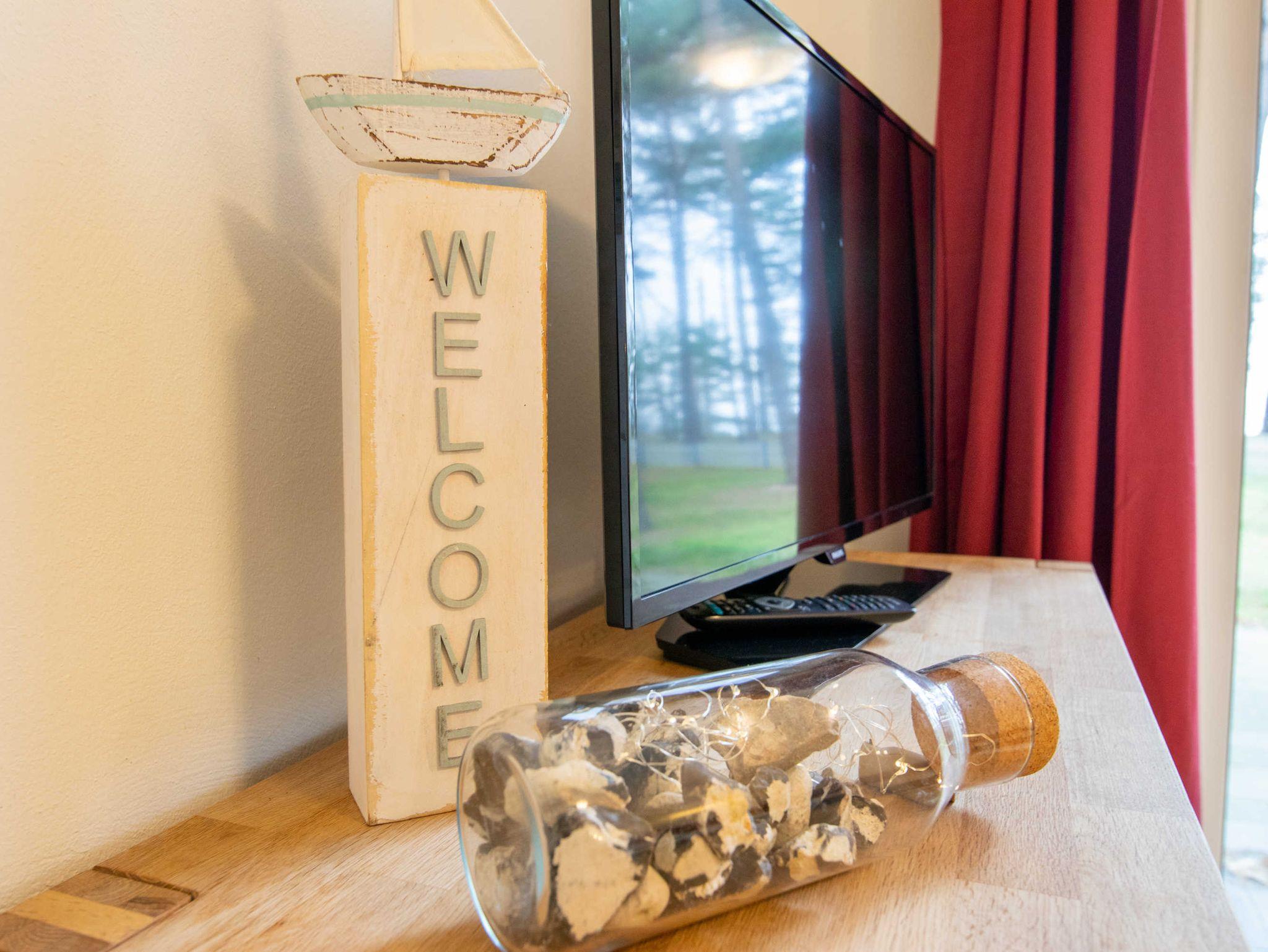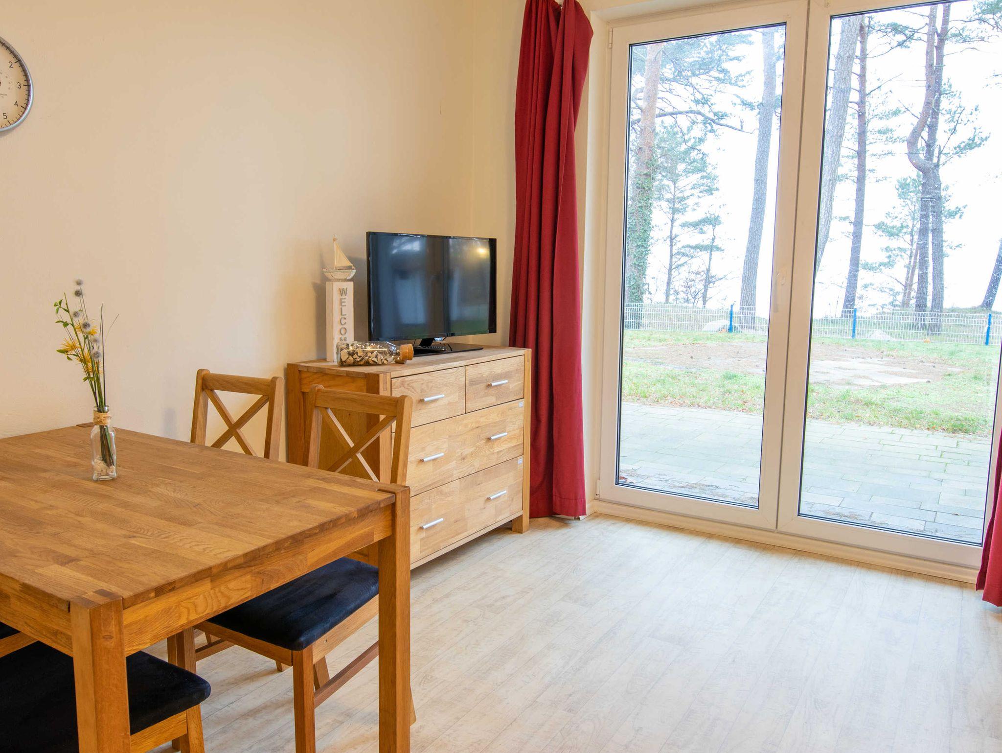 Die ca. 50 m² große Ferienwohnung befindet sich in einem einzeln stehenden Doppelhaus mit Terrasse und direktem Meerblick. Sie verfügt über ein Wohnzimmer mit Küche, zwei separaten Schlafzimmern, Flur und Bad. Das Wohnzimmer ist gemütlich eingerichtet mit einer Schlafcouch (Aufbettung für 2 Personen), TV, einem Esstisch und einer Küchenzeile mit Kühlschrank, Mikrowelle, 2 Herdplatten, Kaffeemaschine und Wasserkocher. Im ersten Schlafzimmer befindet sich ein gemütliches Doppelbett mit Kleiderschrank. Das zweite Schlafzimmer beherbergt zwei Einzelbetten und einen Kleiderschrank. Das freundliche Tageslichtbad hat eine geräumige Dusche und ein WC. Zum Entspannen und Sonne tanken lädt die Terrasse ein. Sie ist vom Wohnzimmer aus begehbar. Die gesamte Ferienwohnung ist mit einer Fußbodenheizung ausgestattet.
