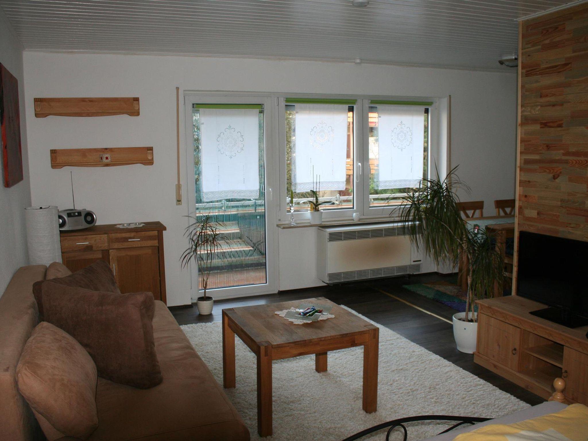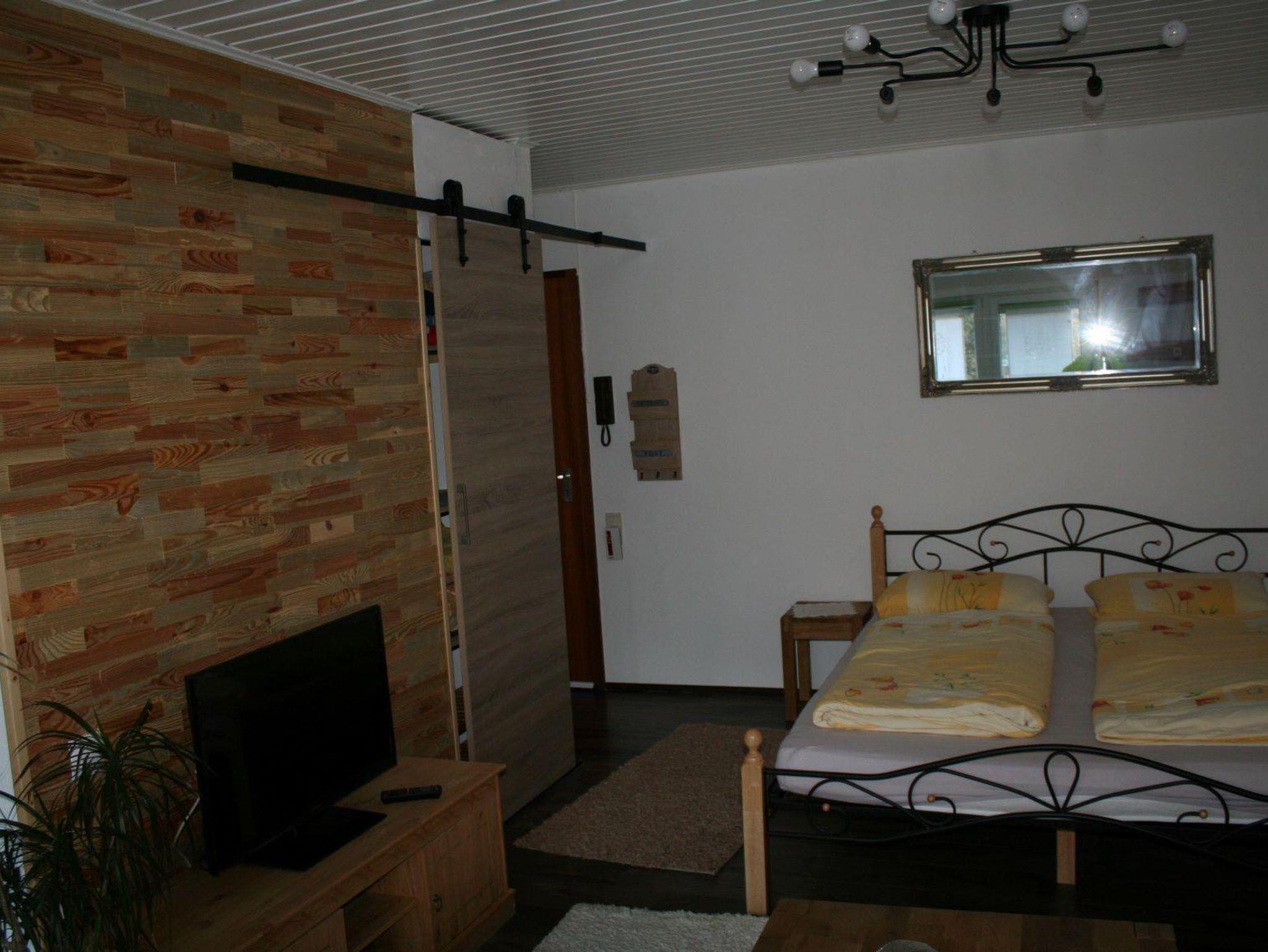 Neu renovierte und geschmackvoll zum Wohlfühlen eingerichtete Ein-Zimmer-Ferienwohnung mit Küchenzeile, Essbereich im 1.OG mit Balkon, sehr ruhig gelegen im Ortsteil Schöntal direkt am Wald und 150 Meter vom Badeweiher Schöntal entfernt. Es besteht die Möglichkeit neben dem Doppelbett die Couch als Schlafcouch zu benutzen, so können auch drei Personen übernachten.