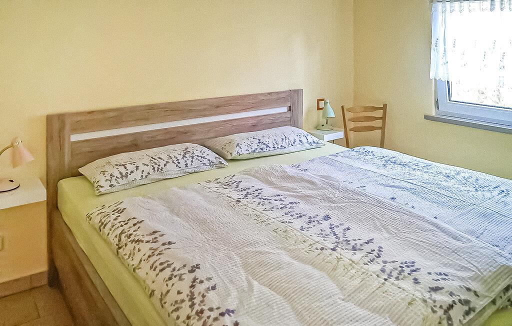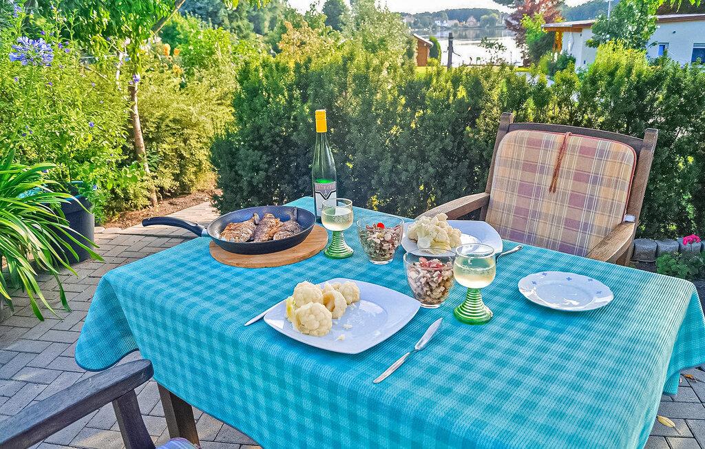 Das etwa 40 qm große, 2017 vollständig sanierte Ferienhaus für bis zu 3 Personen liegt direkt am Wasser ist ausgestattet mit einem Wohnraum (Schlafcouch Aufbettung für 1 Person, Flachbild-TV, Radio mit CD-Player, DVD-Player (auf Anfrage), Essecke), einer separaten Küche (E-Herd mit Backofen, Kühlschrank mit Tiefkühlteil, Mikrowelle, div. Küchenkleingeräten), einem Schlafzimmer (Doppelbett) sowie Bad mit Dusche, WC und Fön. Das Ferienhaus verfügt über WLA und Insektenschutz vor den Fenstern. Das Rauchen ist ausschließlich im Freien erlaubt. Zum Ferienhaus gehören: möblierte Terrasse mit Grill, 1 Fahrrad (kostenlos), 1 Ruderboot (kostenlos).