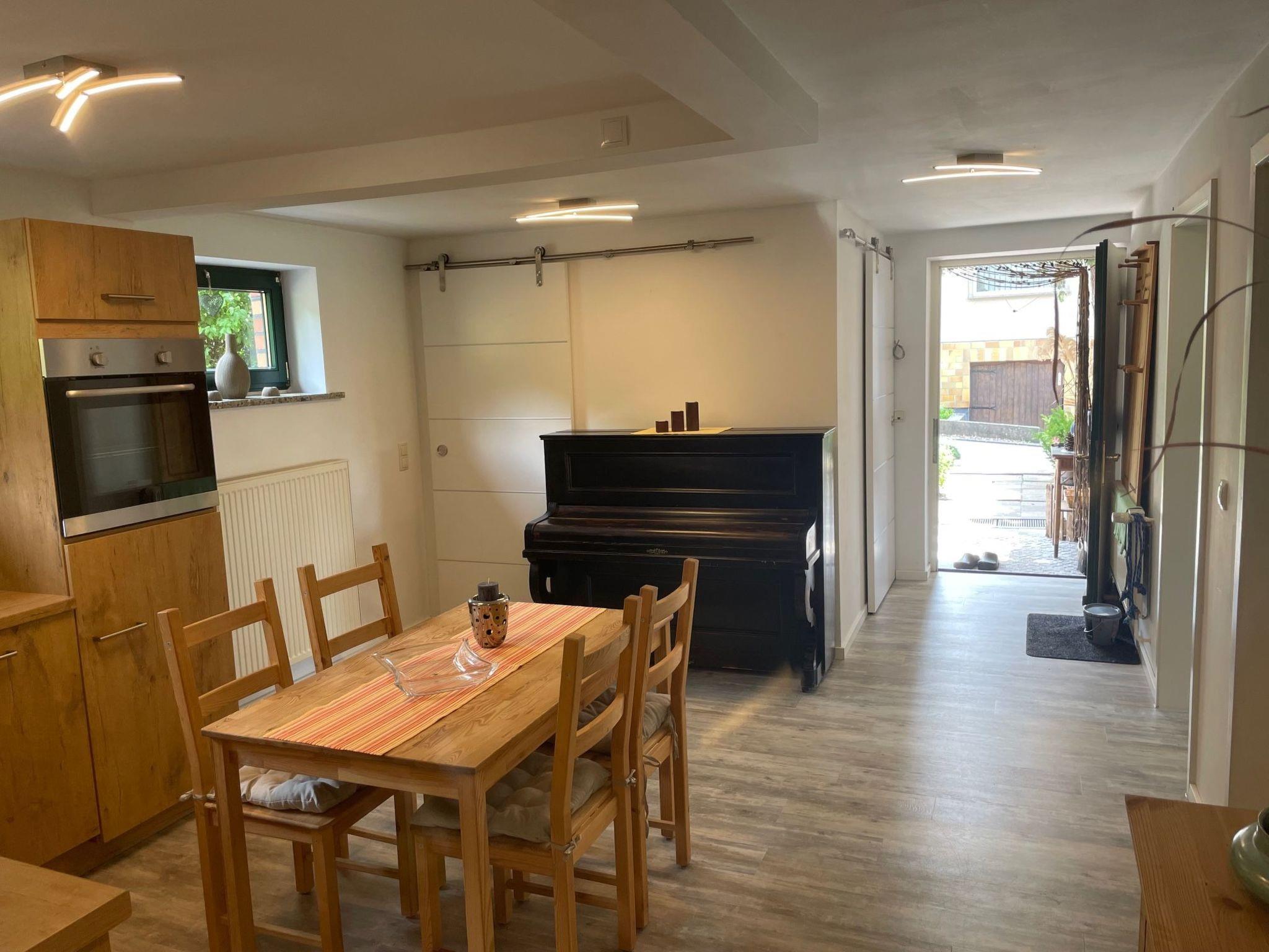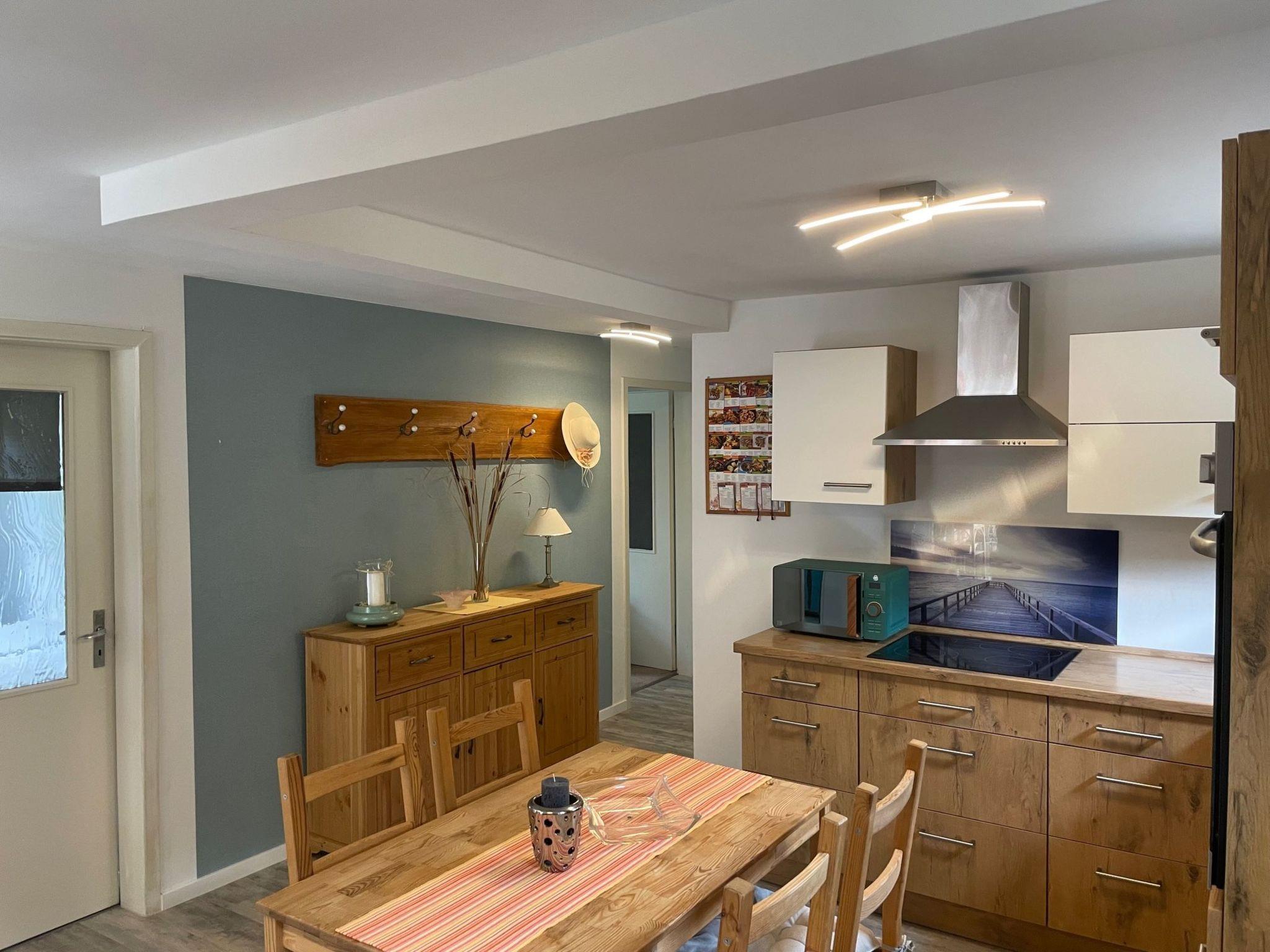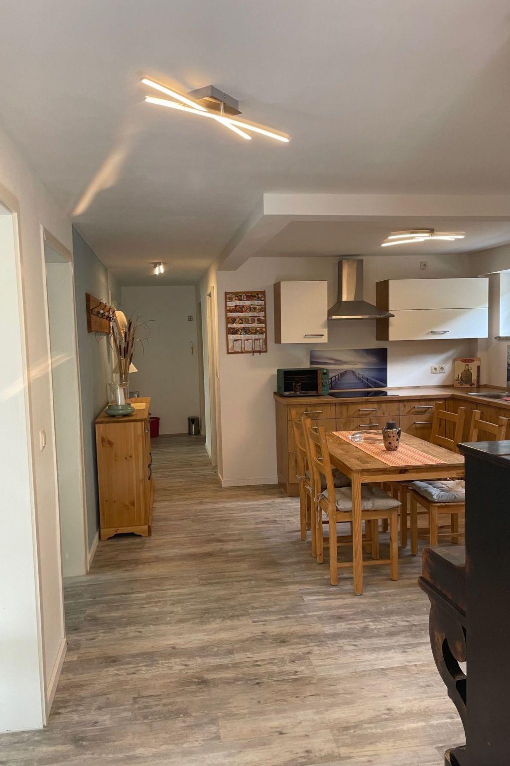 Facilities of FeWo-Seeweg 4 in Lychen Size approx. 90 m² Interior facilities: 2 bedrooms with double beds, 1 bedroom with two single beds, kitchen and household utensils, 4-zone ceramic hob, extractor bonnet, fitted kitchen, freezer, coffee machine, refrigerator, microwave, hoover, toaster, kettle, bathroom and sanitary facilities, full bath, WC, TV, radio, satellite system, games collection, terrace, garden, garden furniture, waterfront property with bathing facilities