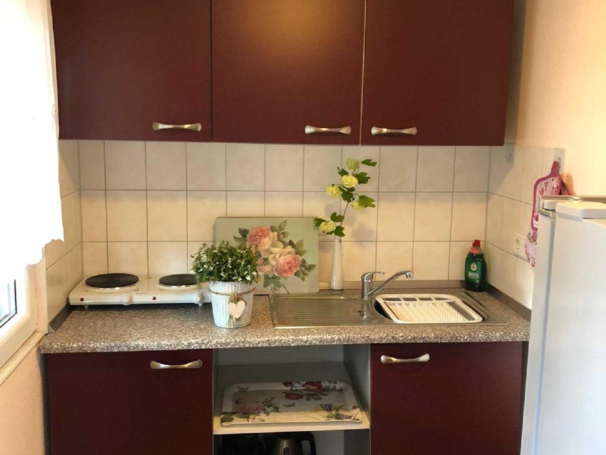 Das Ferienhaus direkt am See in der Uckermark Lychen ist 30 qm groß. Sie betreten es gleich im Wohn- und Schlafbereich. hier finden Sie eine Flurgarderobe, ein Doppelbett, einen Kleiderschrank, eine Couch, eine Kommode, einen Fernseher, einen Esstisch mit Stühlen und eine Eckbank. Durch einen offenen Durchgang gelangen Sie in die Küche. Es ist eine kleine Einbauküche mit einem 2-Platten-Kochfeld, einem Kühlschrank mit Gefrierfach, einem Spülbecken, einer Mikrowelle, einem Toaster, einer Kaffeemaschine und einem Wasserkocher. Vor hier gelangen Sie ins Bad mit Dusche und WC. Am Haus ist eine überdachte Terrasse mit Gartenmöbeln und Grill. Im Großen Garten ist eine Spiel- und Liegewiese mit einer nostalgischen Wasserpumpe. Einen Pkw-Parkplatz gibt es direkt am Grundstück.