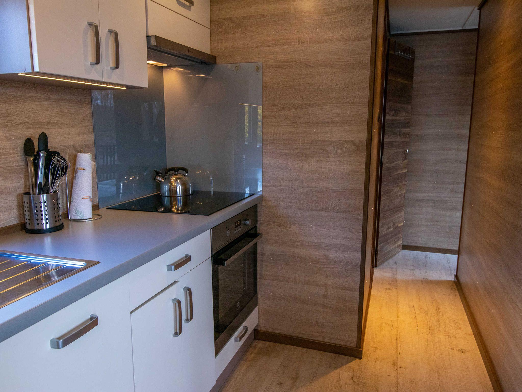 Die offene Küche ist mit 4-Zonen-Kochfeld, Kaffeemaschine, Kühlschrank, Geschirrspüler und Toaster ausgestattet.
