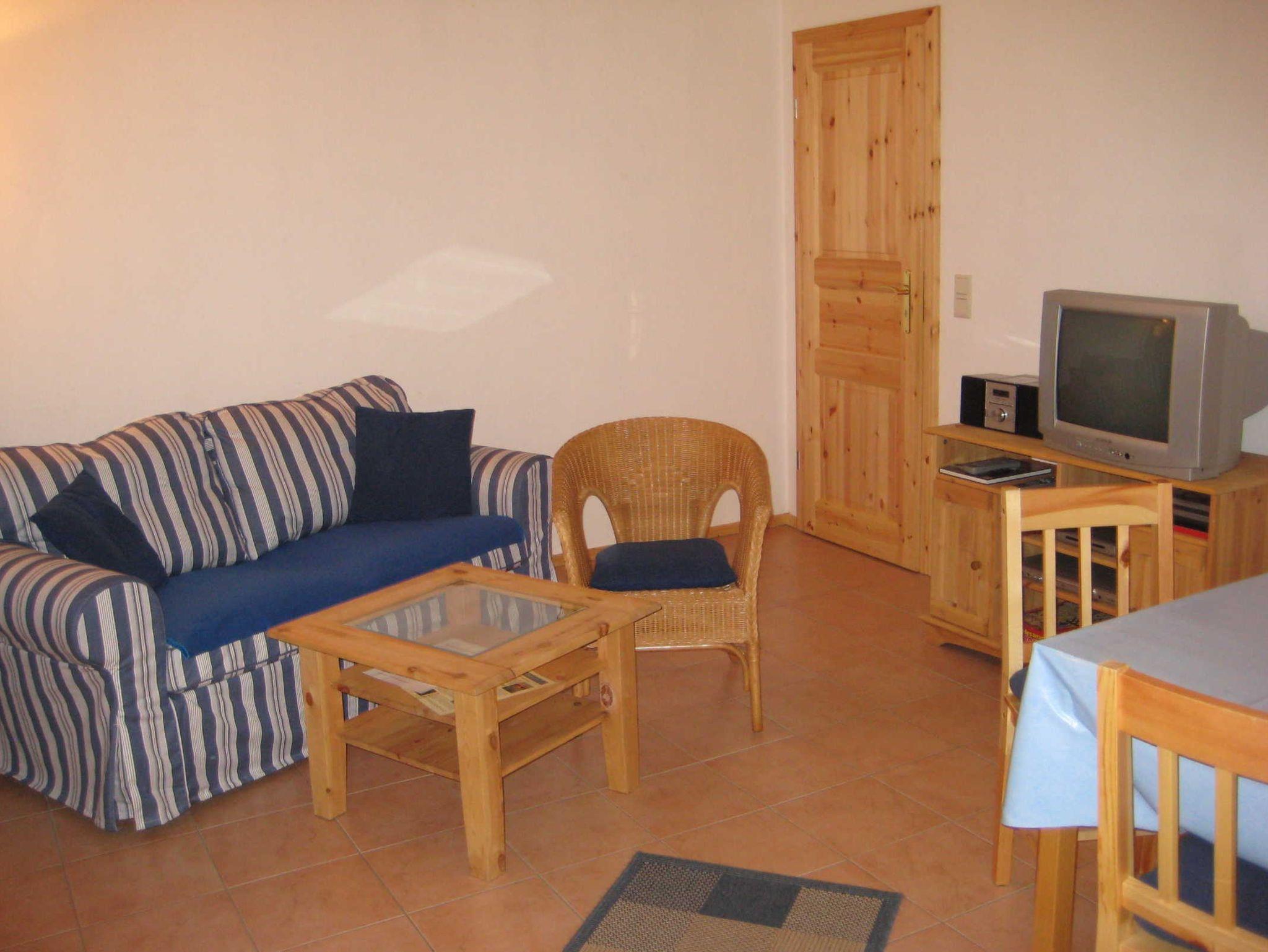 - Wohnzimmer mit Couch, Couchtisch, separater Esstisch mit Stühlen, Garderobe, Schrank, Fußboden gefliest